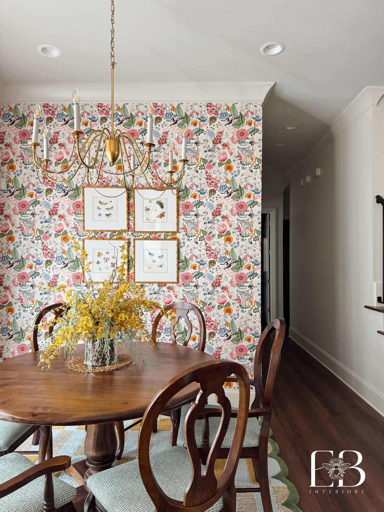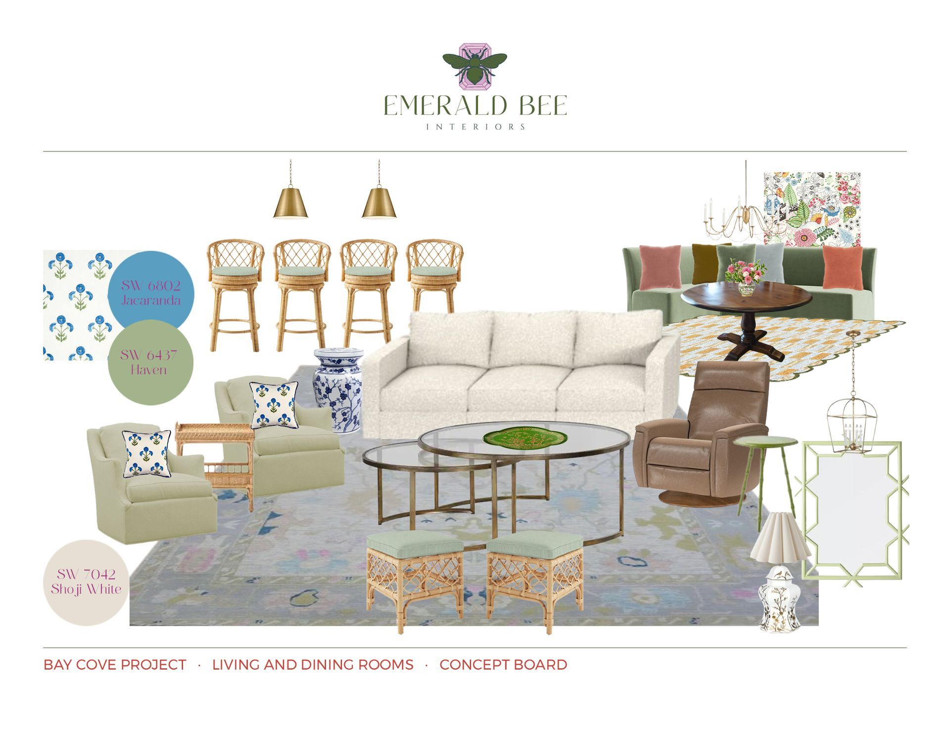 Emerald Bee Interiors provided comprehensive design direction, assisting with paint and finish selections, art and lighting curation, and the layering of accessories to create balance and flow throughout the open-concept living and dining areas. The result is a bright, inviting space anchored by classic details — rattan barstools, brass lighting, and chinoiserie accents — all complemented by bold, joyful color and pattern.