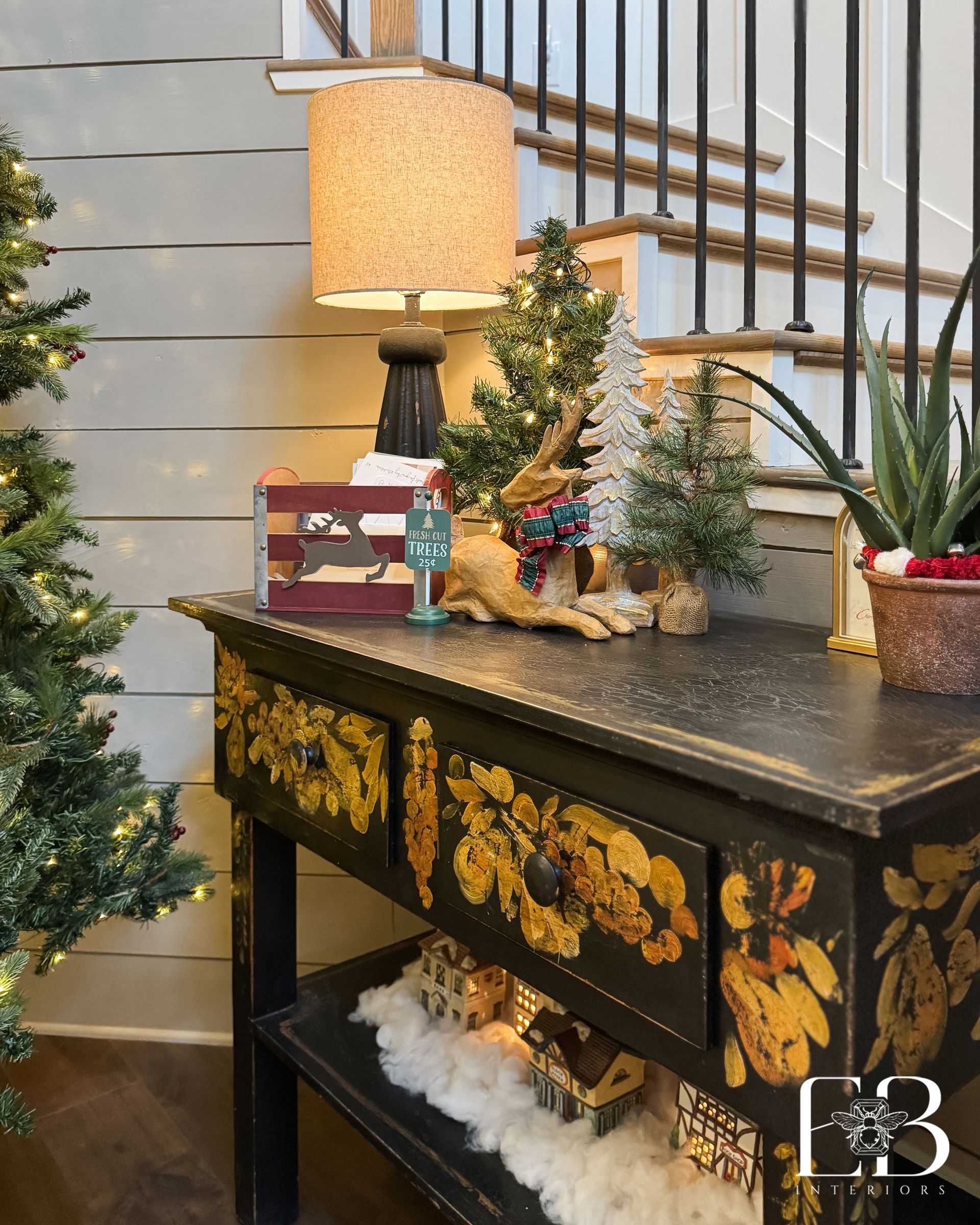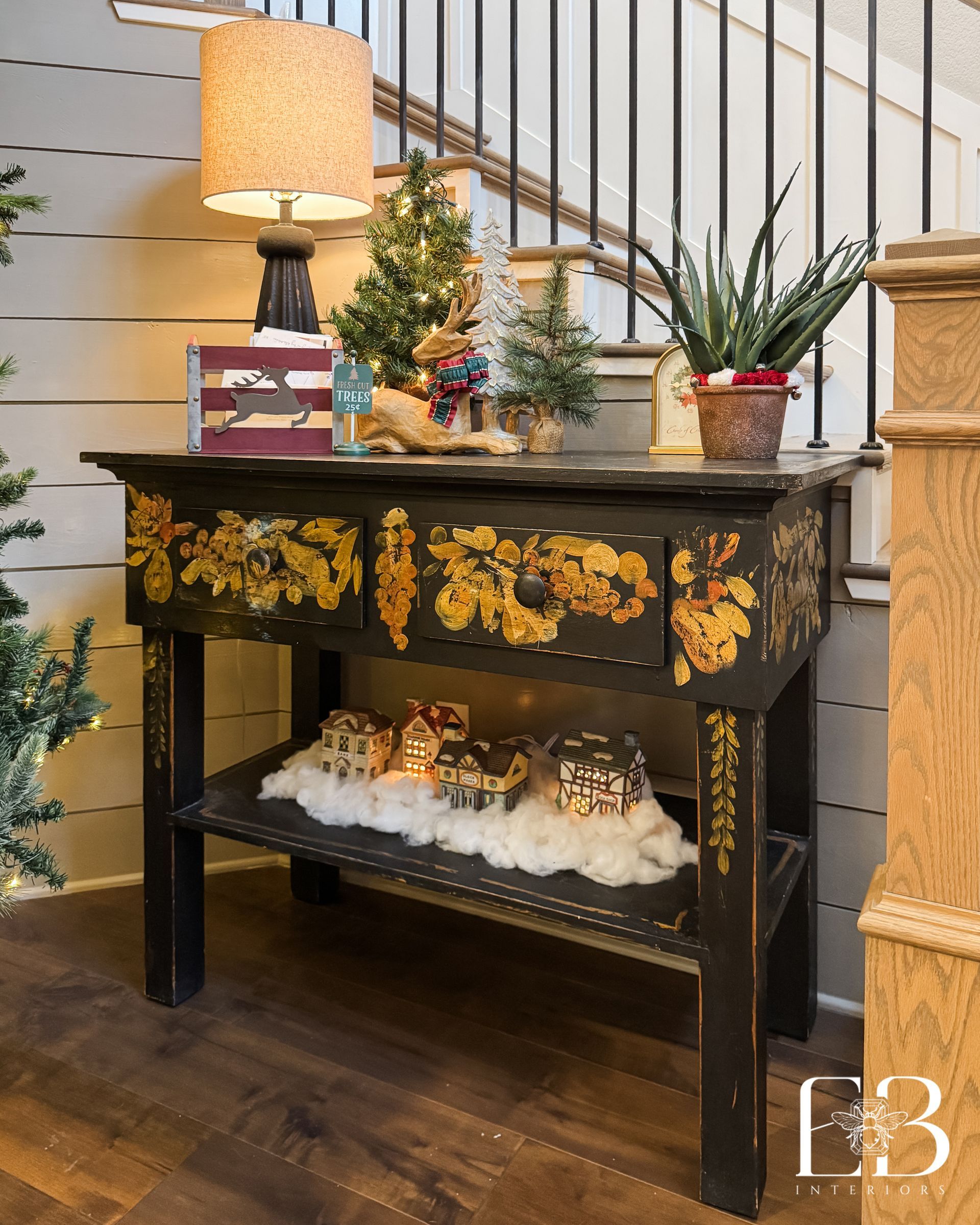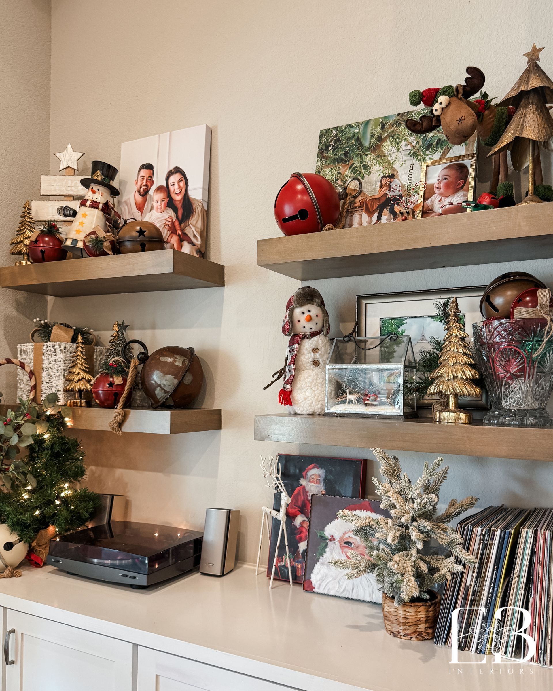 In the foyer, a tall, pre-lit tree draws the eye upward along the architectural staircase, while the hand-painted console was transformed with illuminated village houses, mixed greenery, and collected seasonal accents. Throughout the living room, floating shelves, built-ins, and surfaces were restyled with curated combinations of sentimental pieces, metallic trees, vintage-inspired figurines, and warm pops of red and green—all intentionally tied into the home's new jewel-tone and neutral palette. The console beneath the gold mirror features a fresh holiday arrangement with berries and greenery, anchoring the space with warmth and balance.