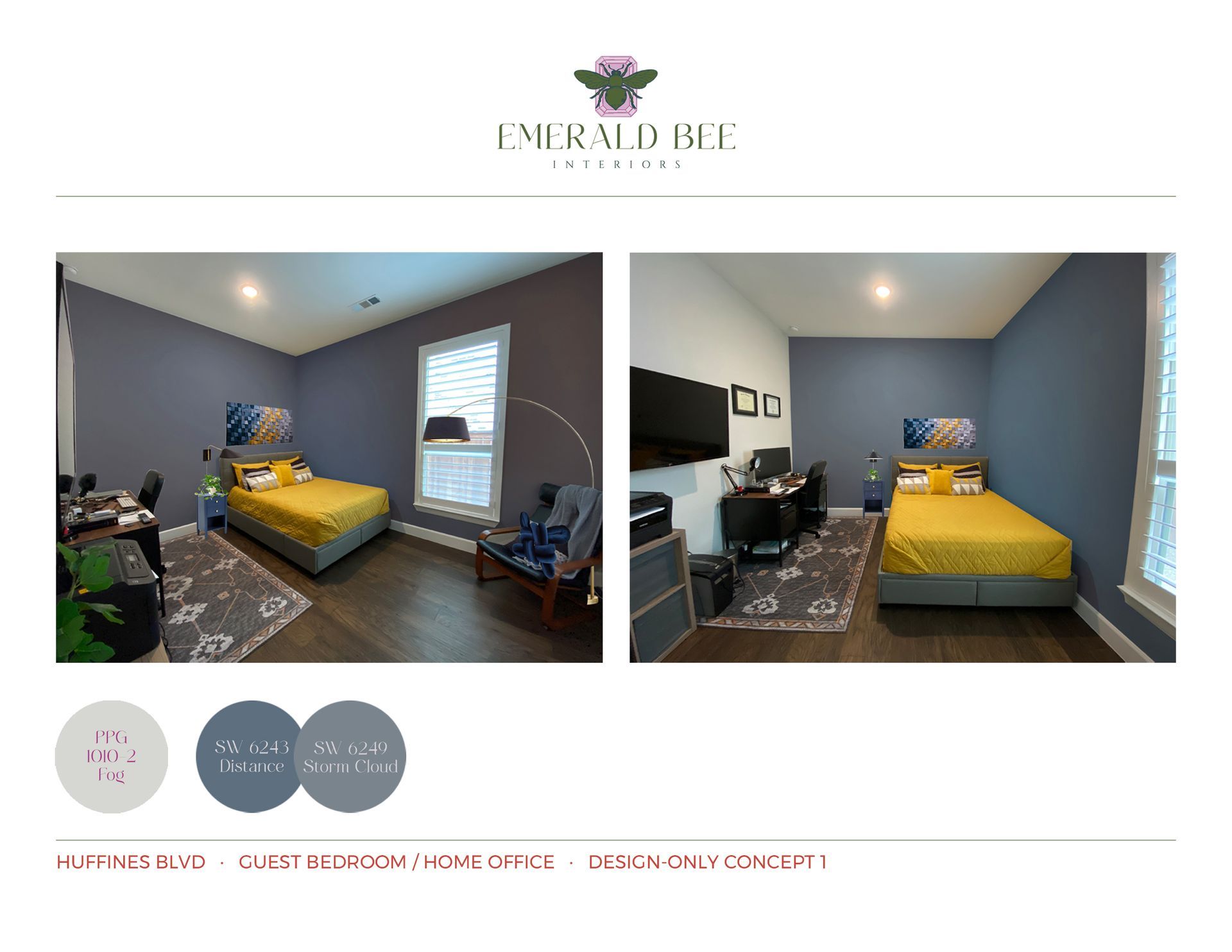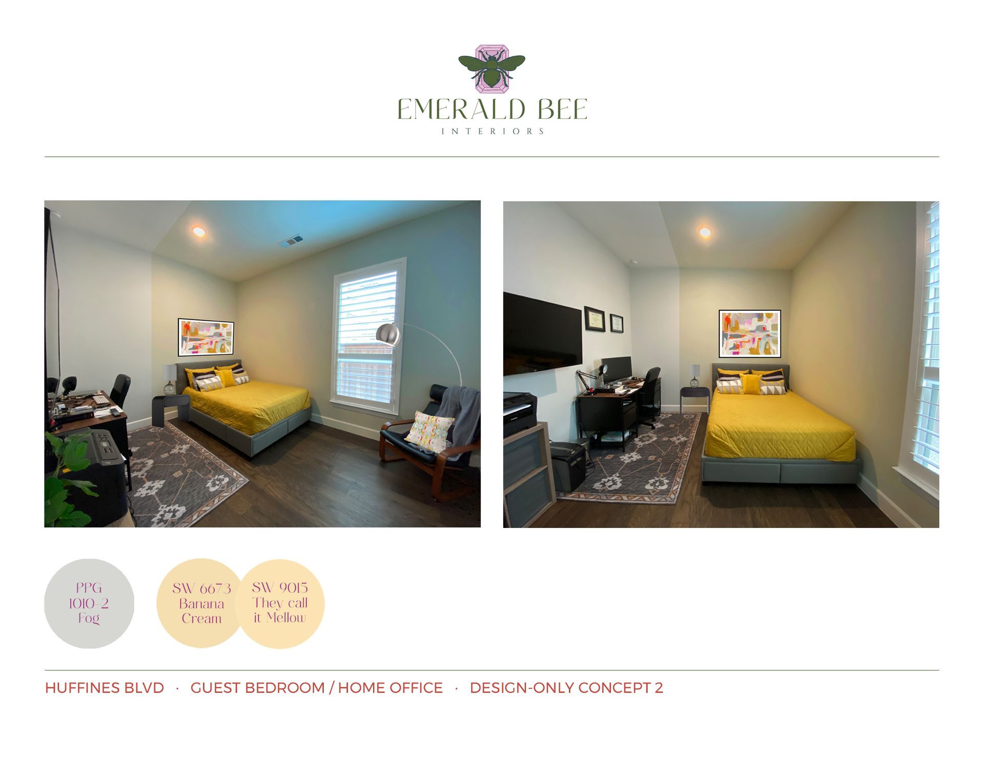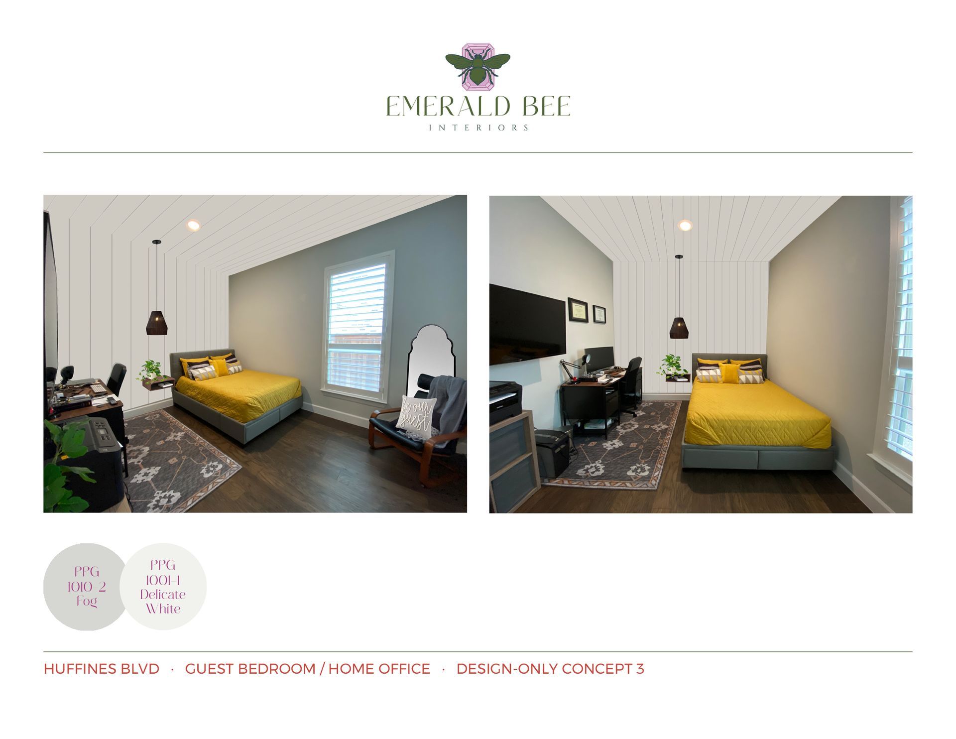 - Concept 2: A painted yellow boundary treatment to visually separate the office zone from the sleeping area.
