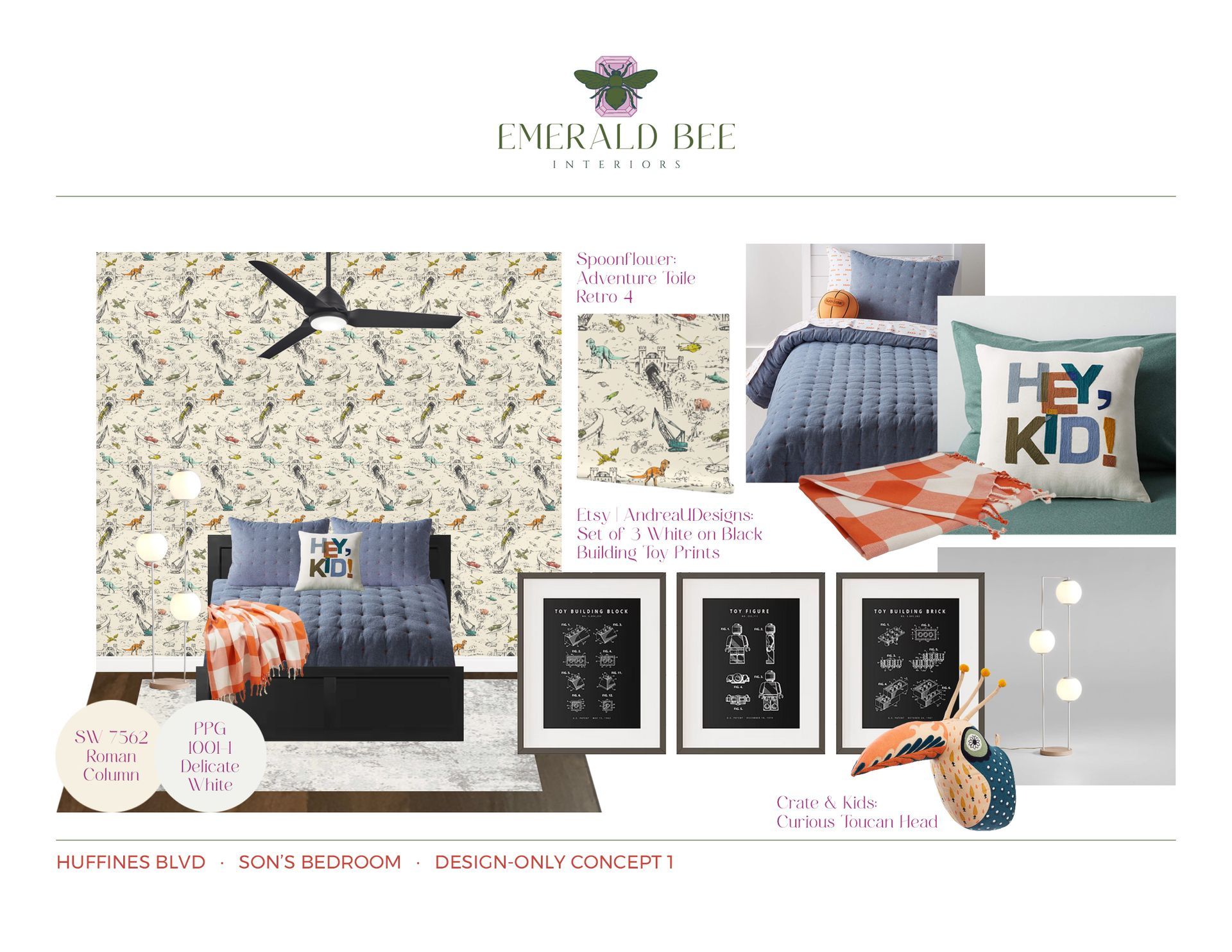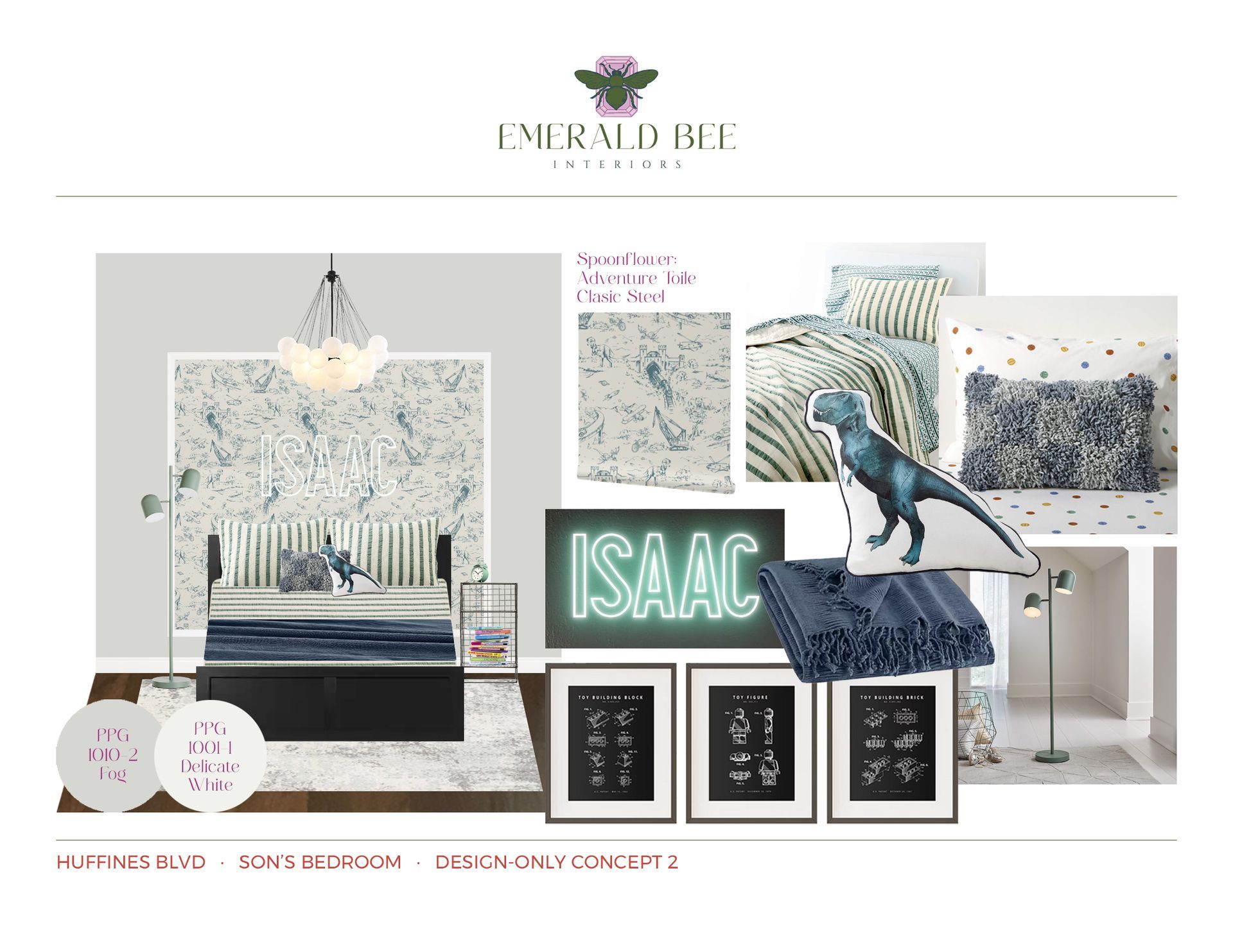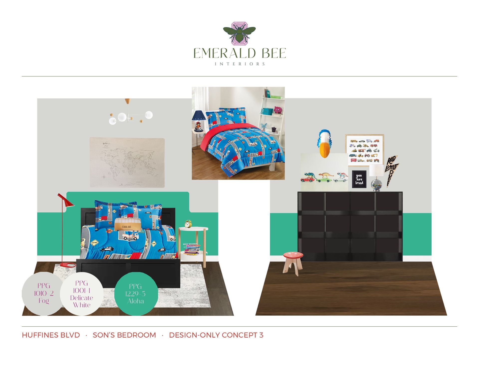 - Concept 3: Two-tone green color block pulled from existing bedding, creating playful dimension with rounded paint edges and a world map focal point.