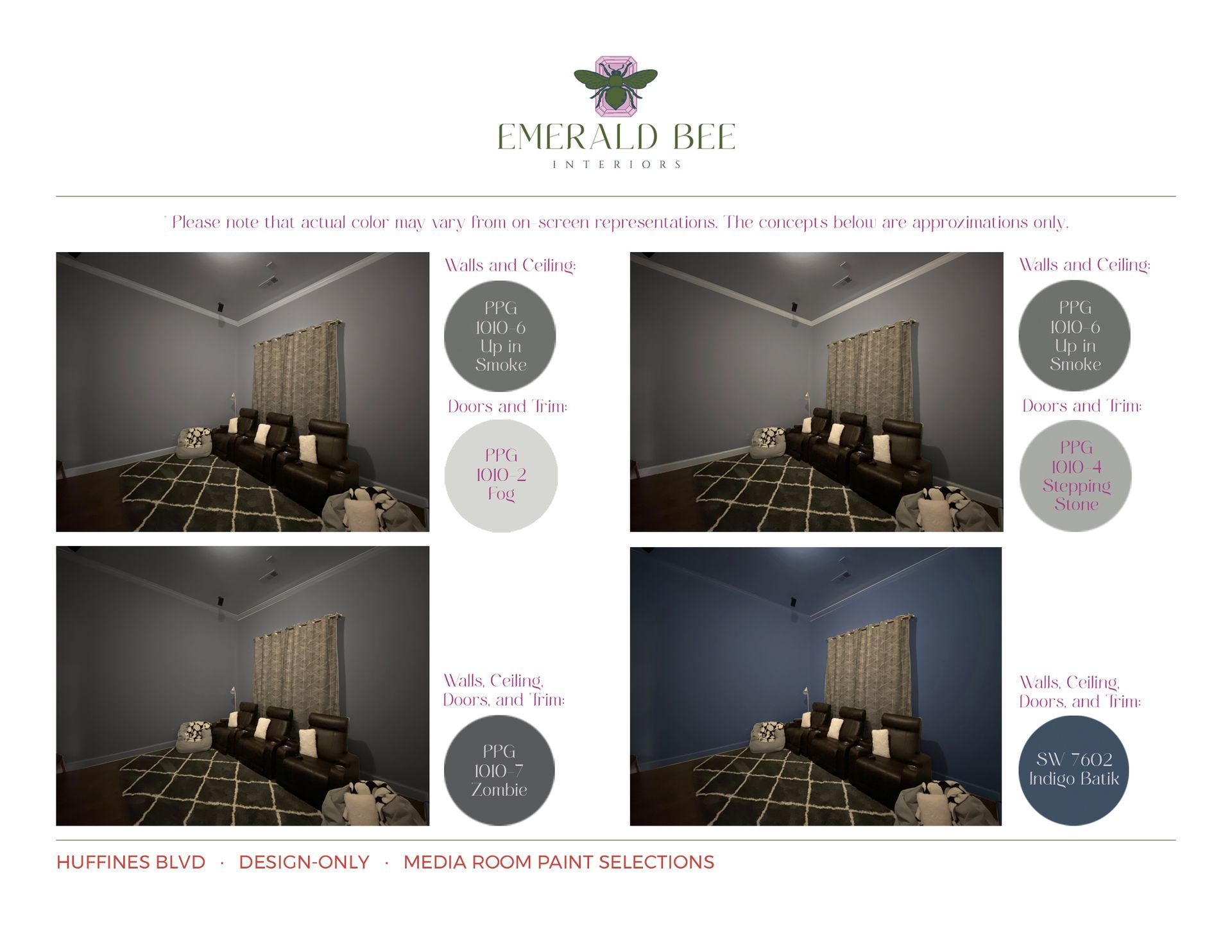 To reduce reflection and create a true theater experience, Emerald Bee proposed deepening the wall color while maintaining harmony with the home’s existing palette (PPG 1010-2 Fog and Delicate White). Several options were presented, including tone-on-tone gray schemes and a dark navy alternative for added visual depth, each with sheen upgrades to improve durability and light diffusion.