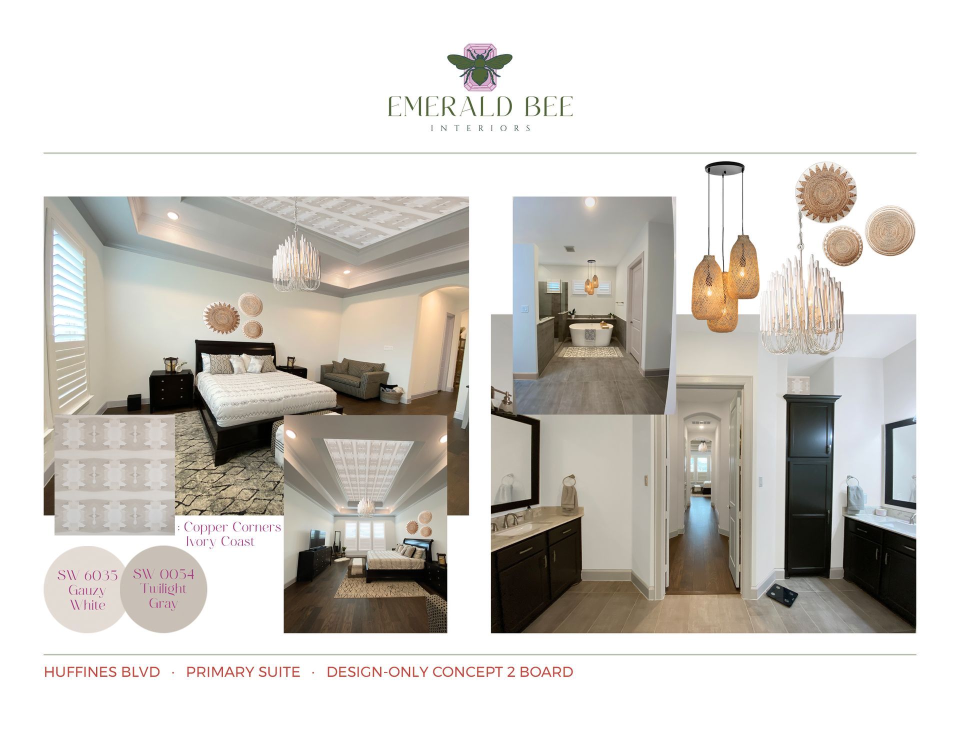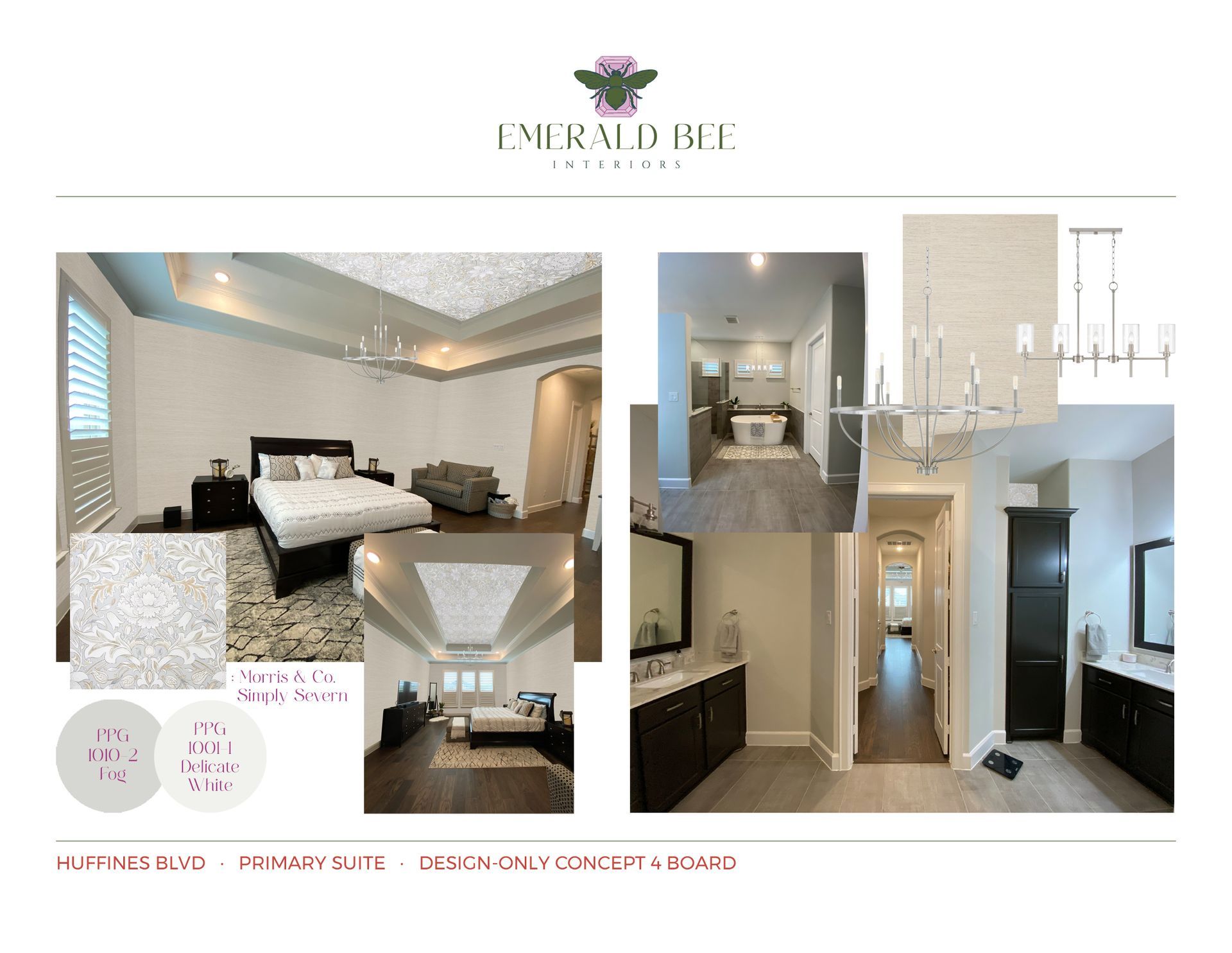 - Concept 2: Neutral patterned wallpaper emphasizing ceiling height and texture, with a complementary palette extending into the ensuite bath.