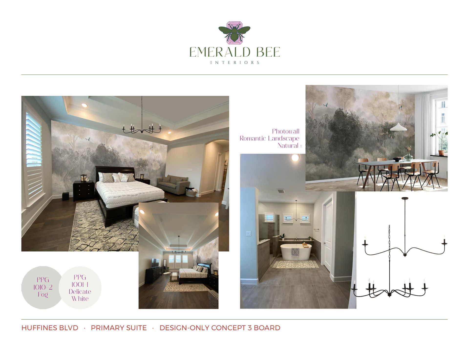 - Concept 3: A full-wall mural serving as a dramatic backdrop for the bed, paired with elegant chandeliers in both bedroom and bath.