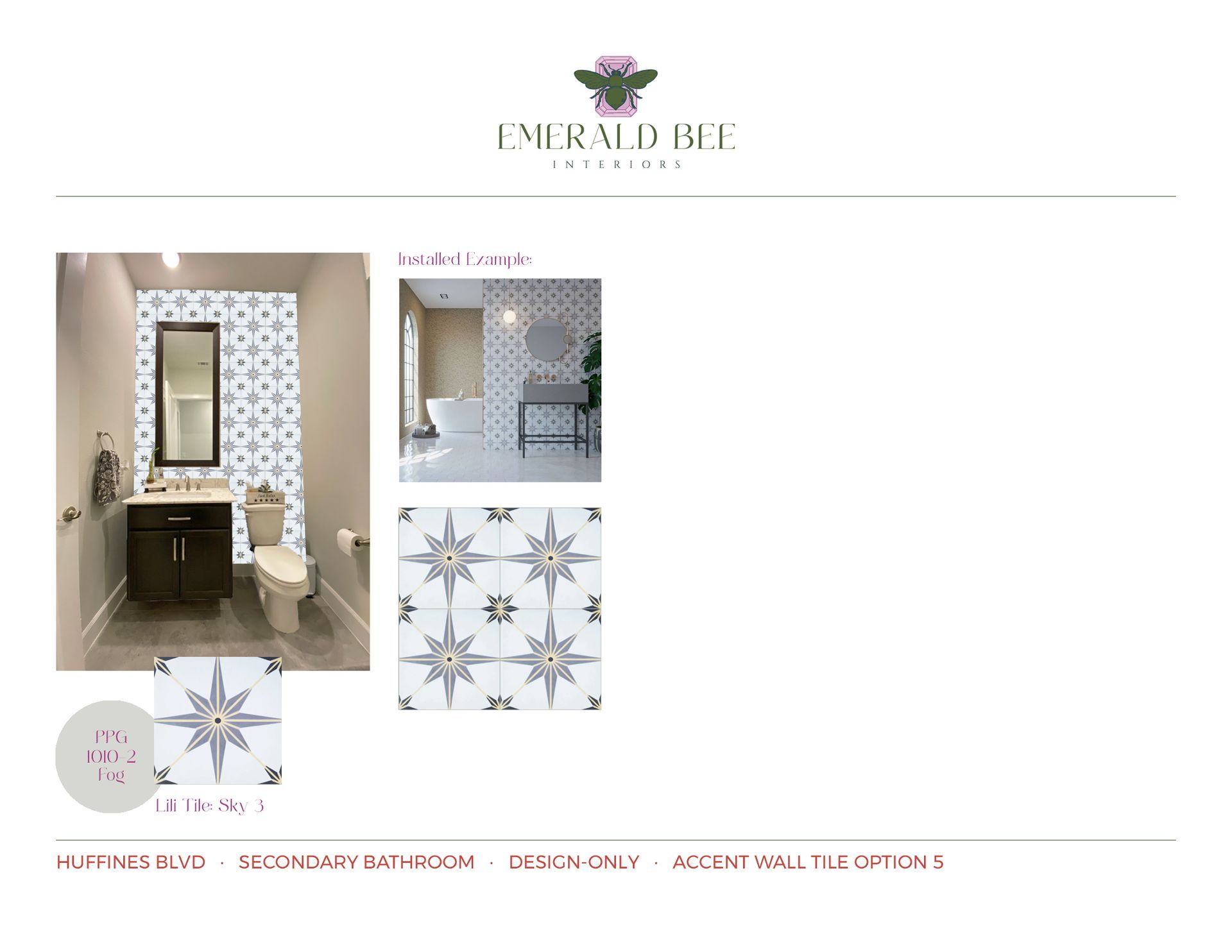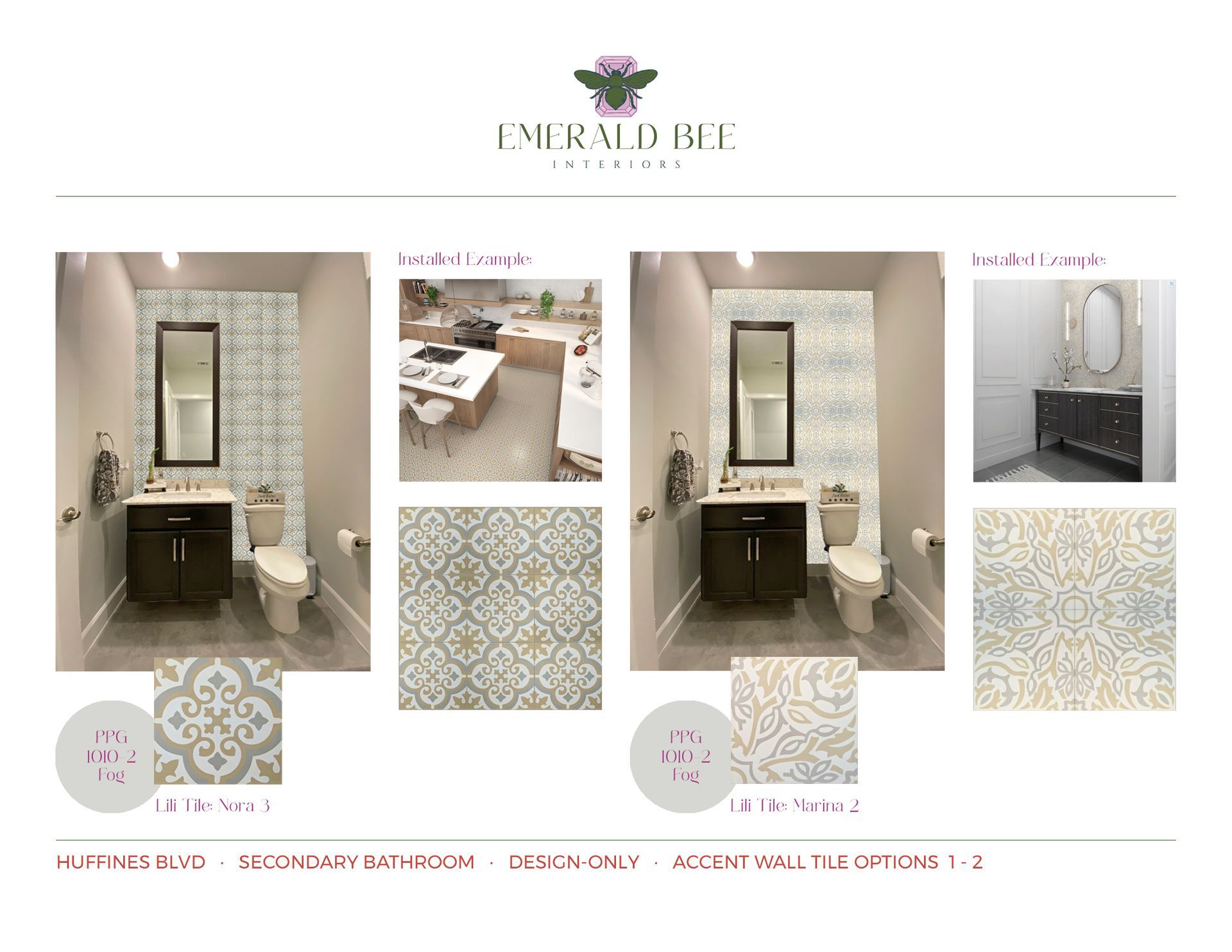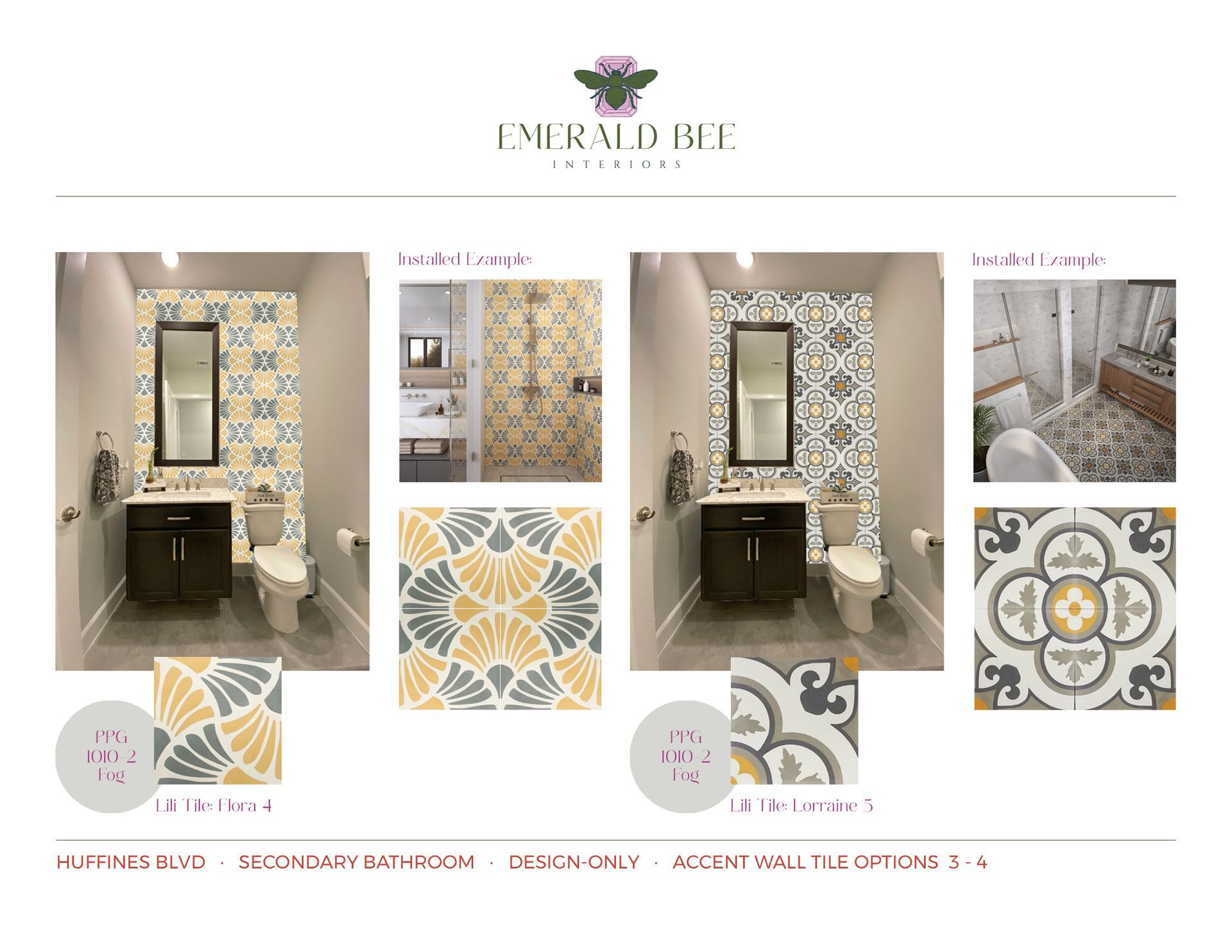 To unify the guest suite, Emerald Bee proposed a tile accent wall behind the vanity incorporating subtle yellow and gray tones echoed from the adjoining bedroom. Multiple patterned concrete tile options were explored, paired with white or gray grout for a clean, cohesive finish.