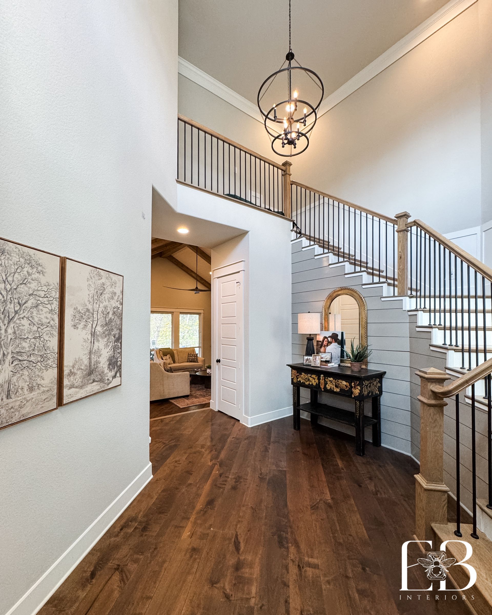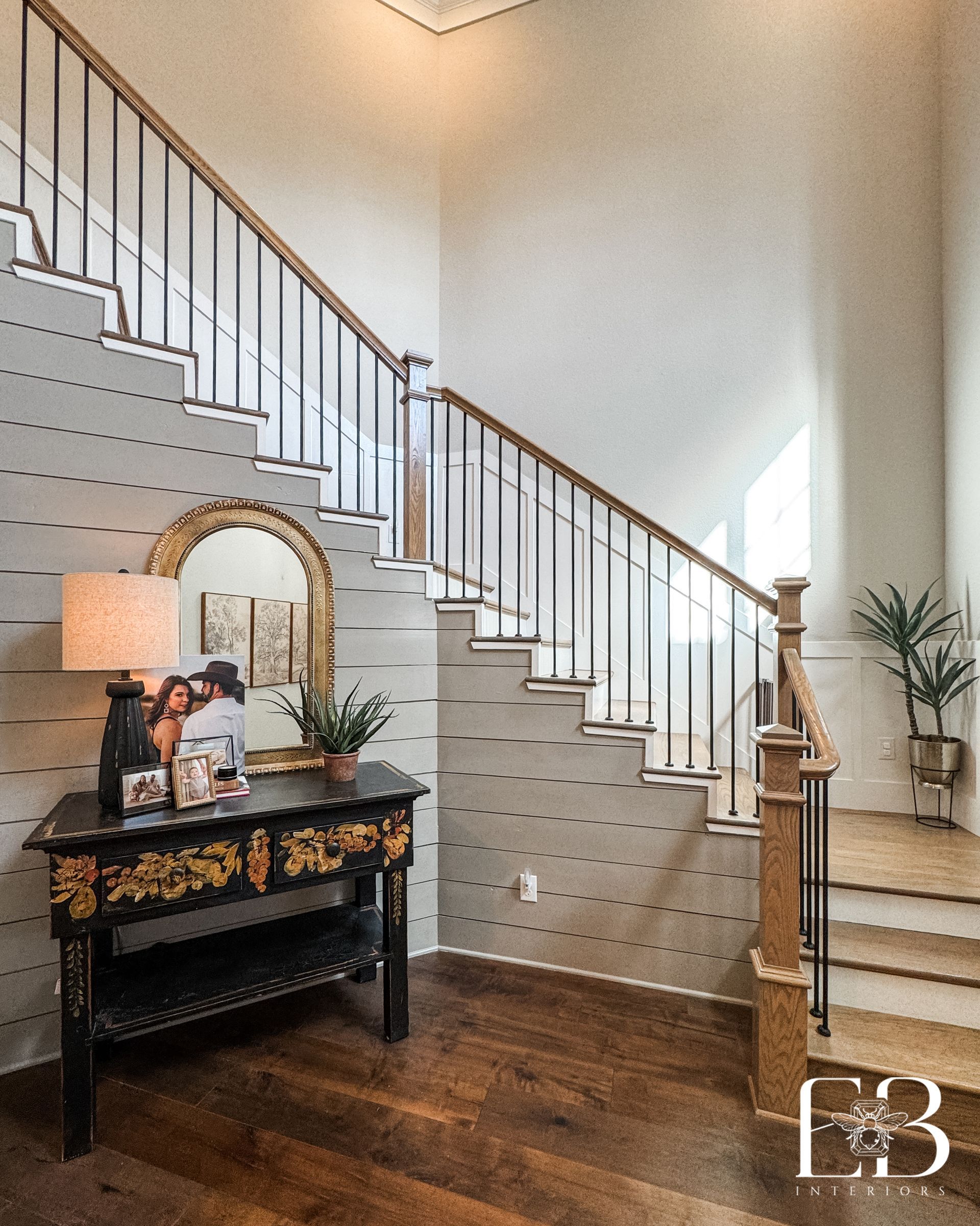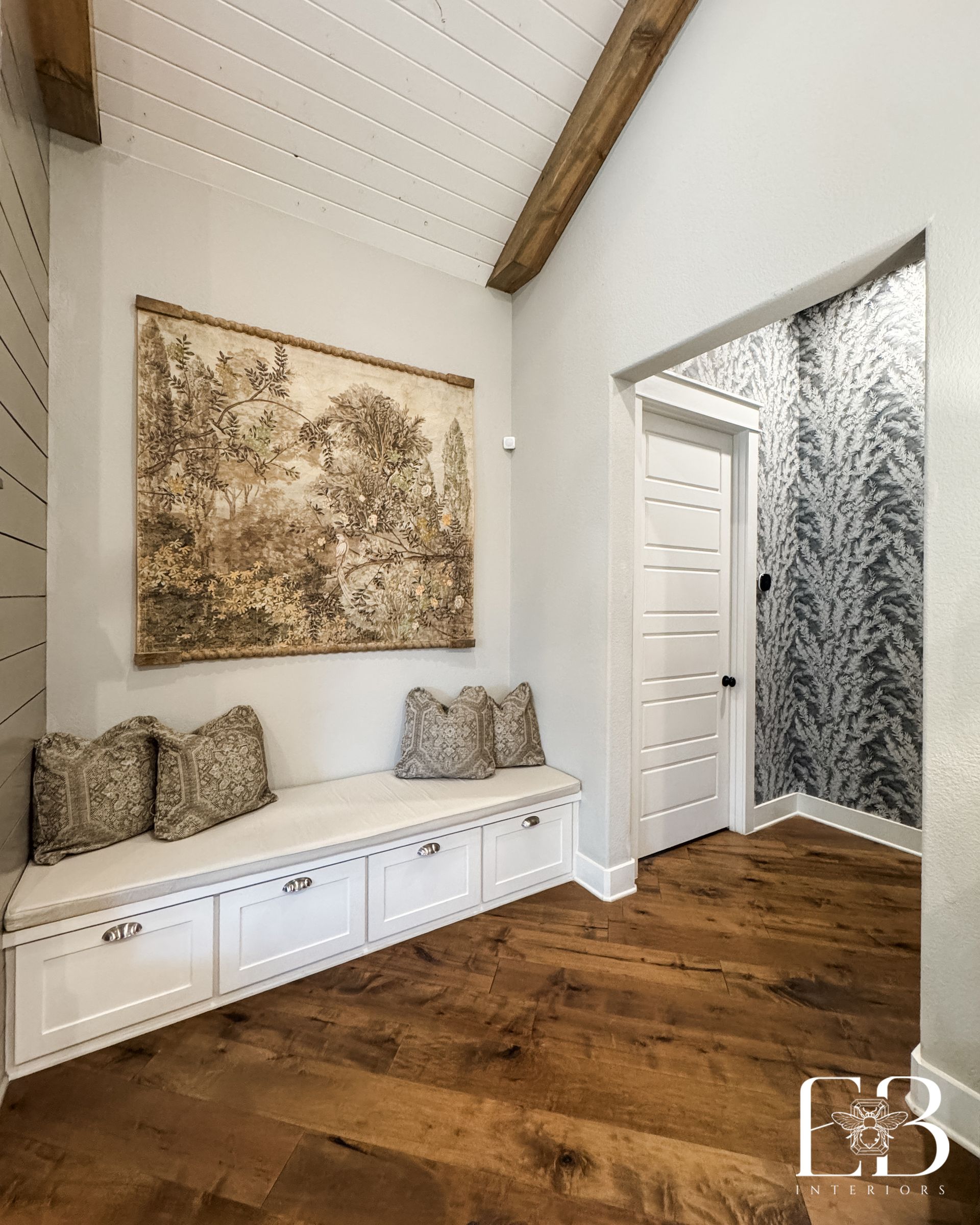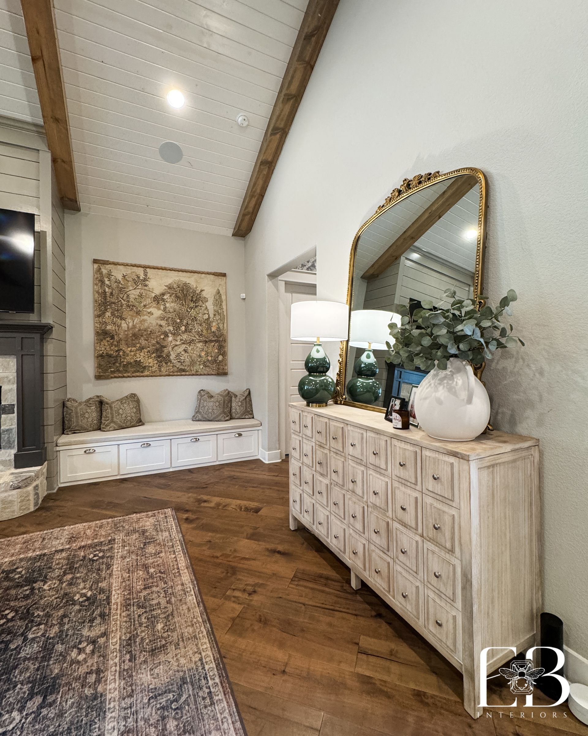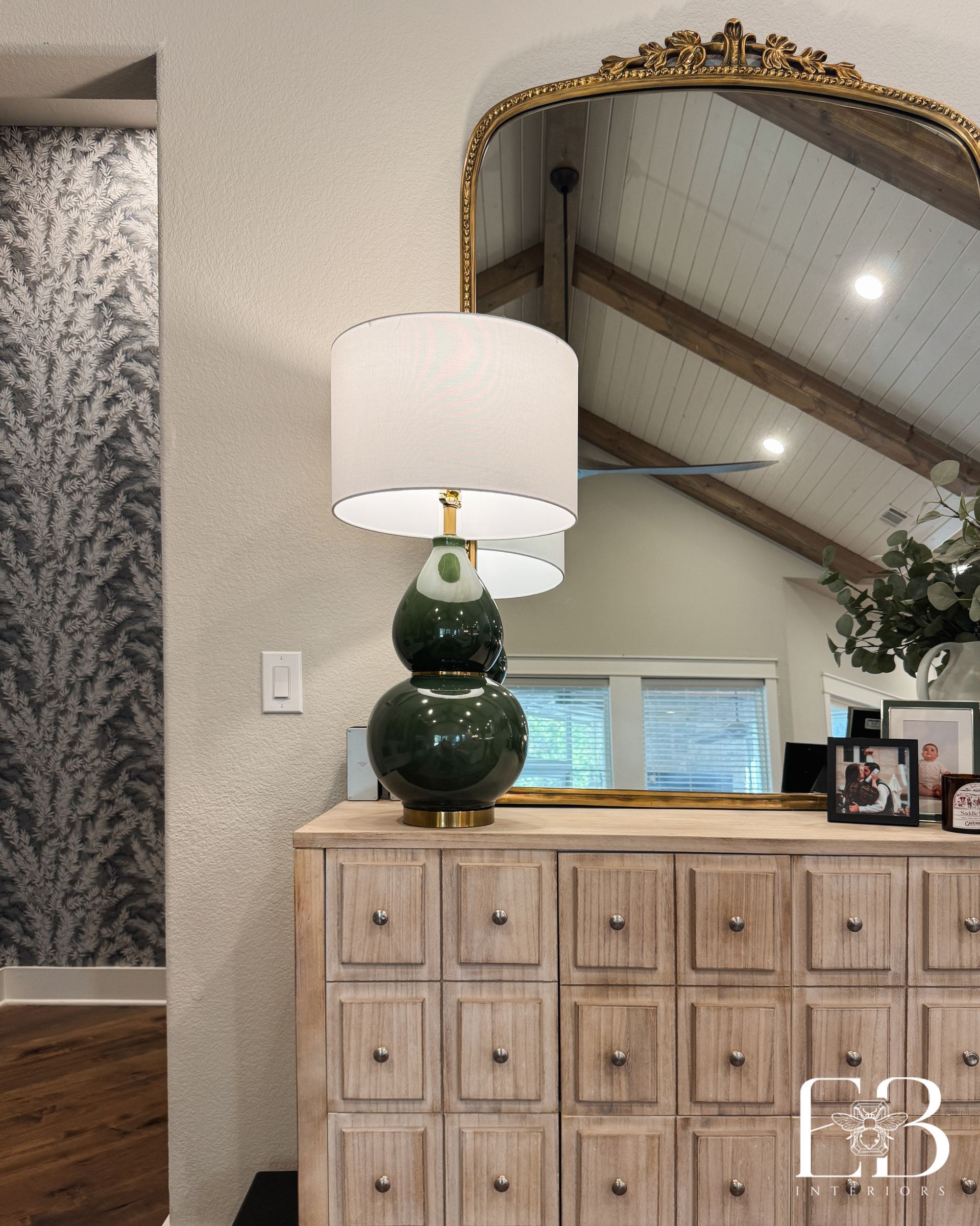 In the foyer and living room, Emerald Bee Interiors reimagined the existing space to move away from a farmhouse palette of muted blues toward a more sophisticated mix of greens, golds, and layered neutrals. The shiplap in both the entry and fireplace surround was painted a warm gray, grounding the space and creating a subtle connection between rooms. Larger investment pieces—such as the existing sofas—were retained, while new artwork, textiles, and lighting introduced richness and depth. A pop of wallpaper was added in the small hallway off the primary bedroom to echo the warm gray tones and add visual interest. Custom window treatment concepts were developed to enhance natural light and accommodate the household’s pets.