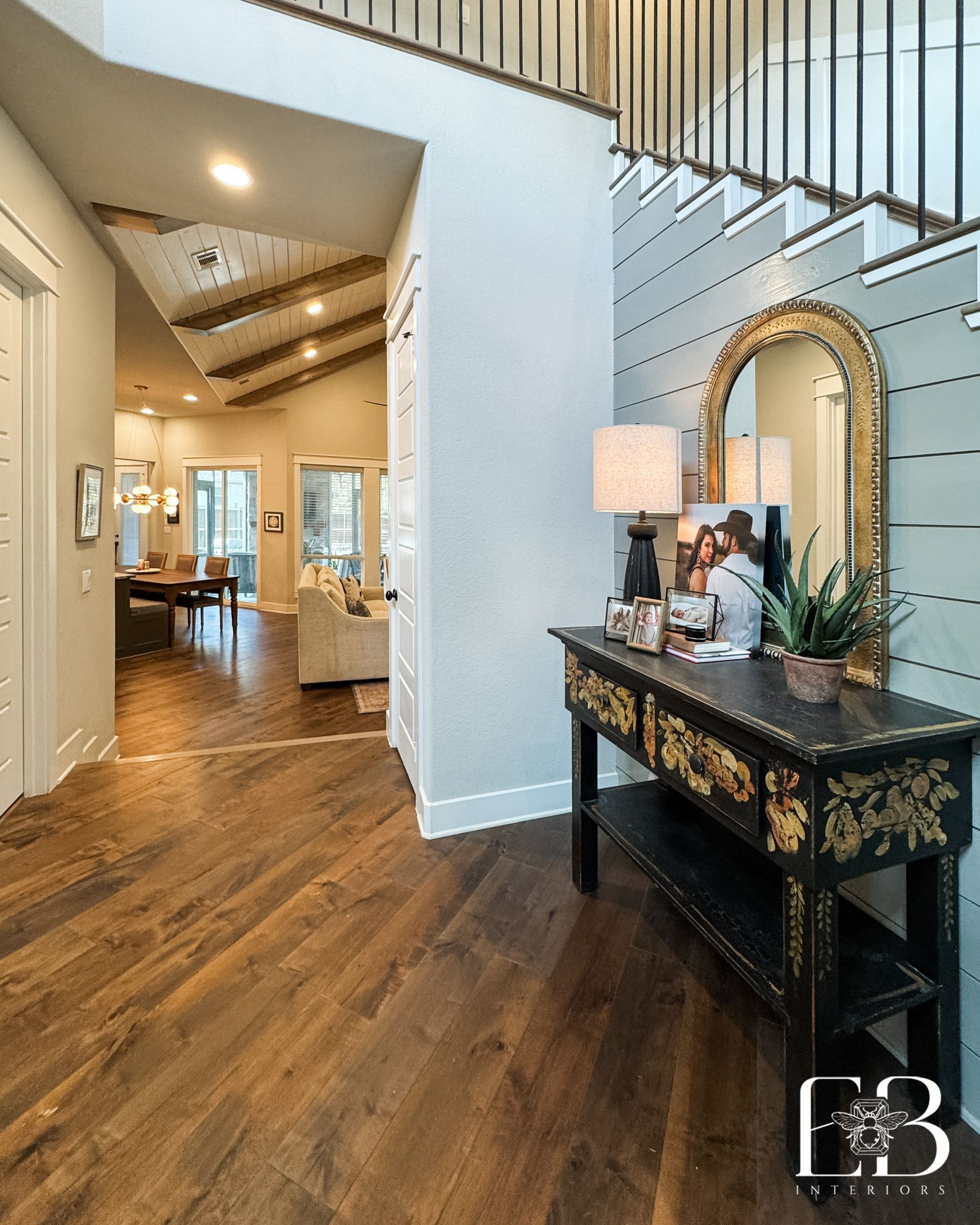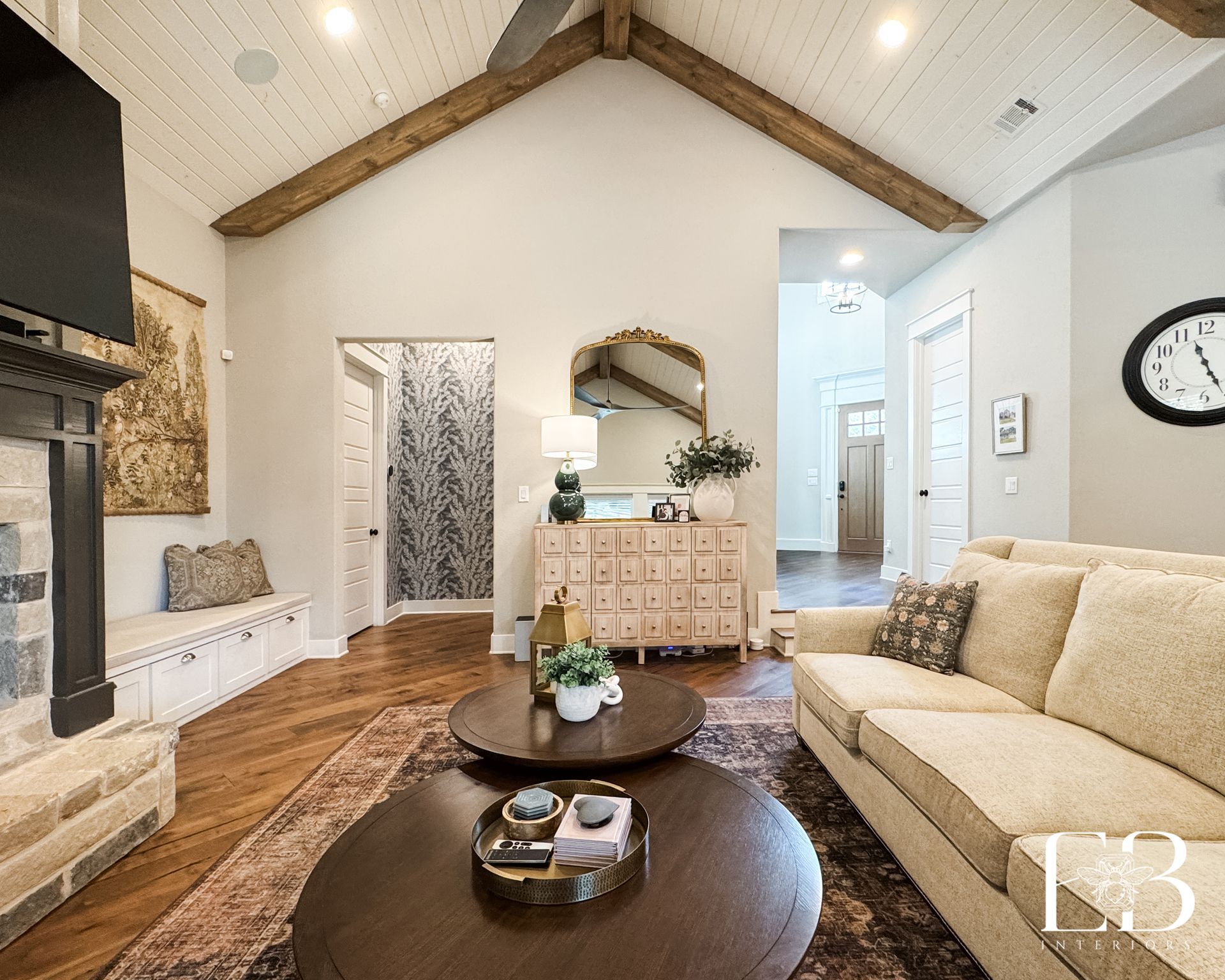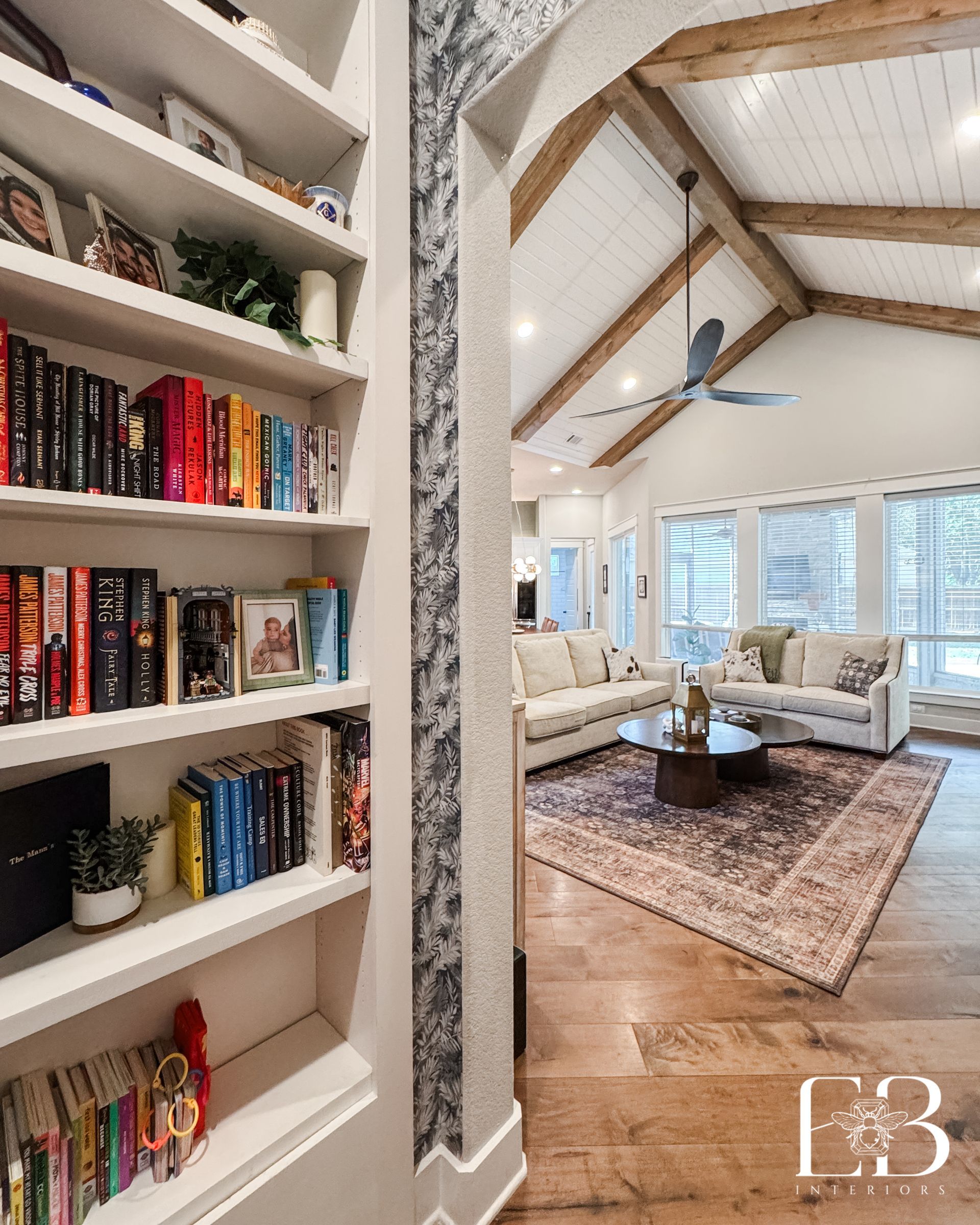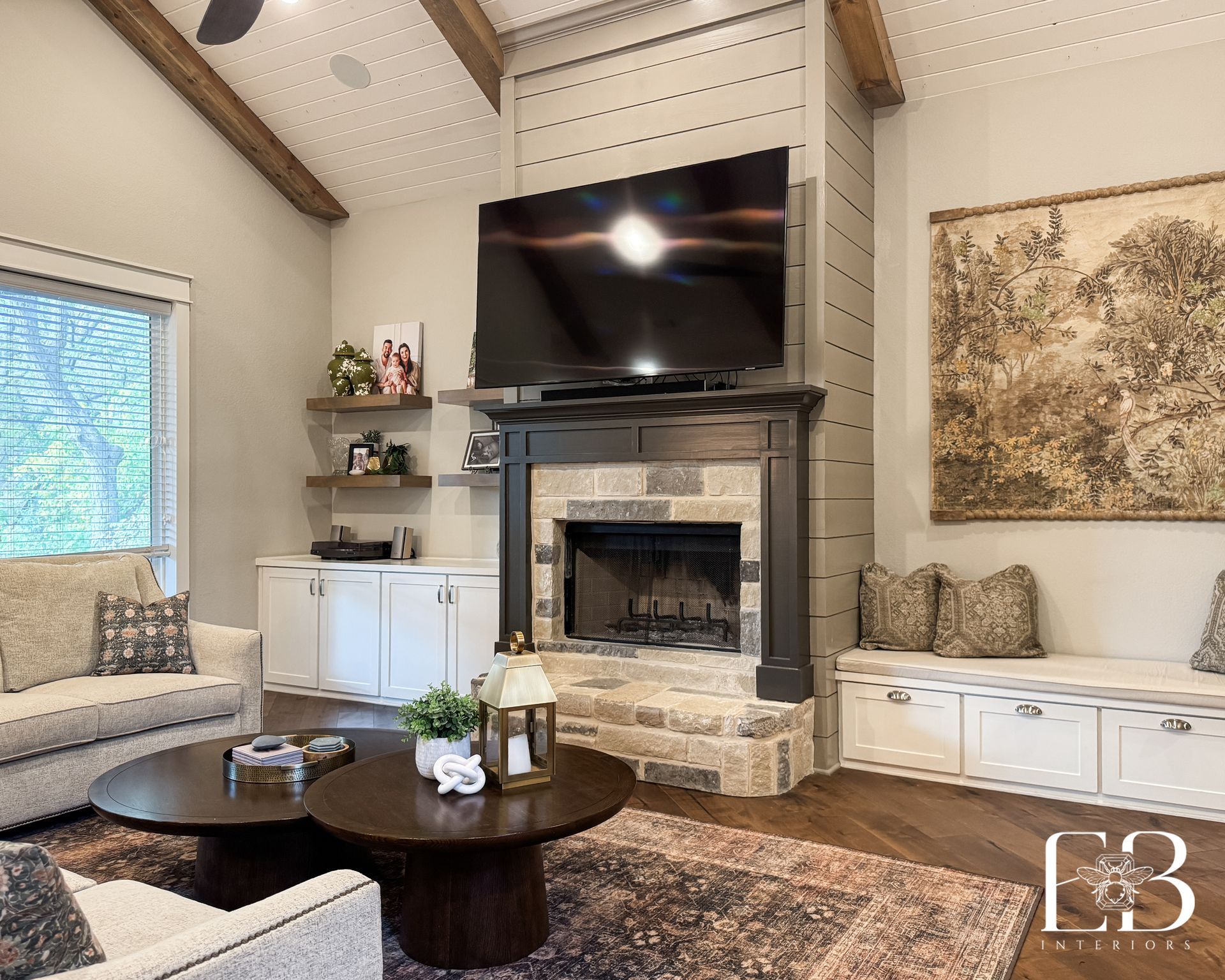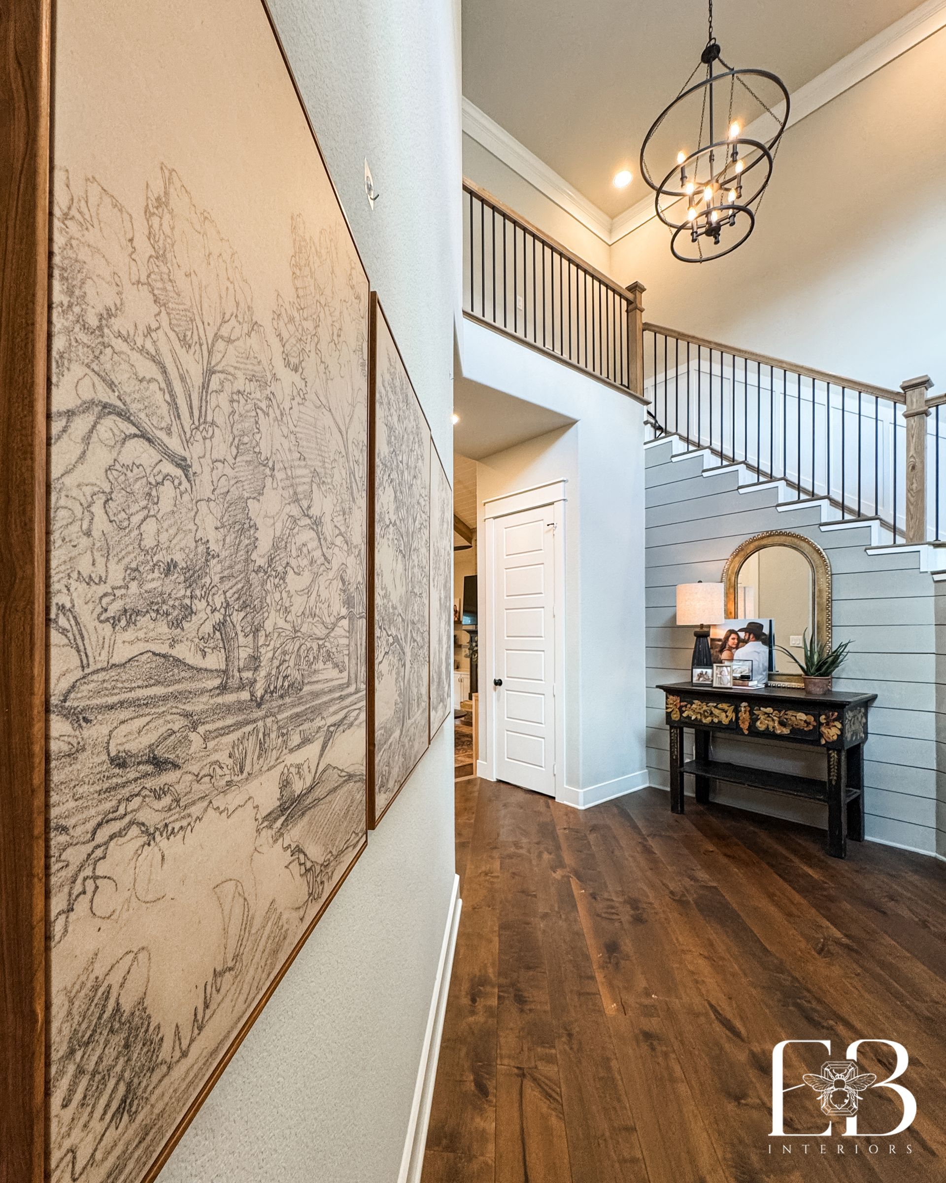 In the foyer and living room, Emerald Bee Interiors reimagined the existing space to move away from a farmhouse palette of muted blues toward a more sophisticated mix of greens, golds, and layered neutrals. The shiplap in both the entry and fireplace surround was painted a warm gray, grounding the space and creating a subtle connection between rooms. Larger investment pieces—such as the existing sofas—were retained, while new artwork, textiles, and lighting introduced richness and depth. A pop of wallpaper was added in the small hallway off the primary bedroom to echo the warm gray tones and add visual interest. Custom window treatment concepts were developed to enhance natural light and accommodate the household’s pets.