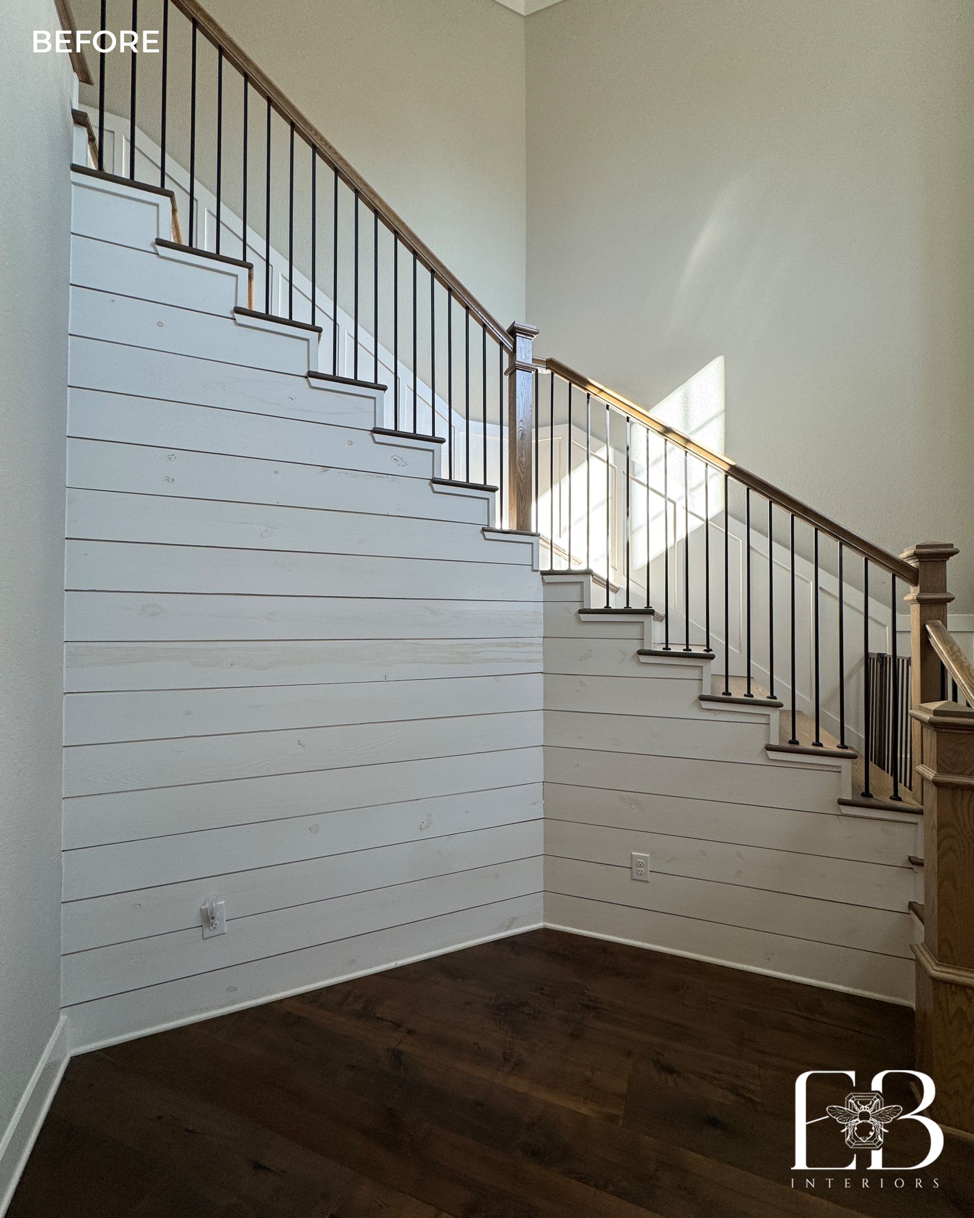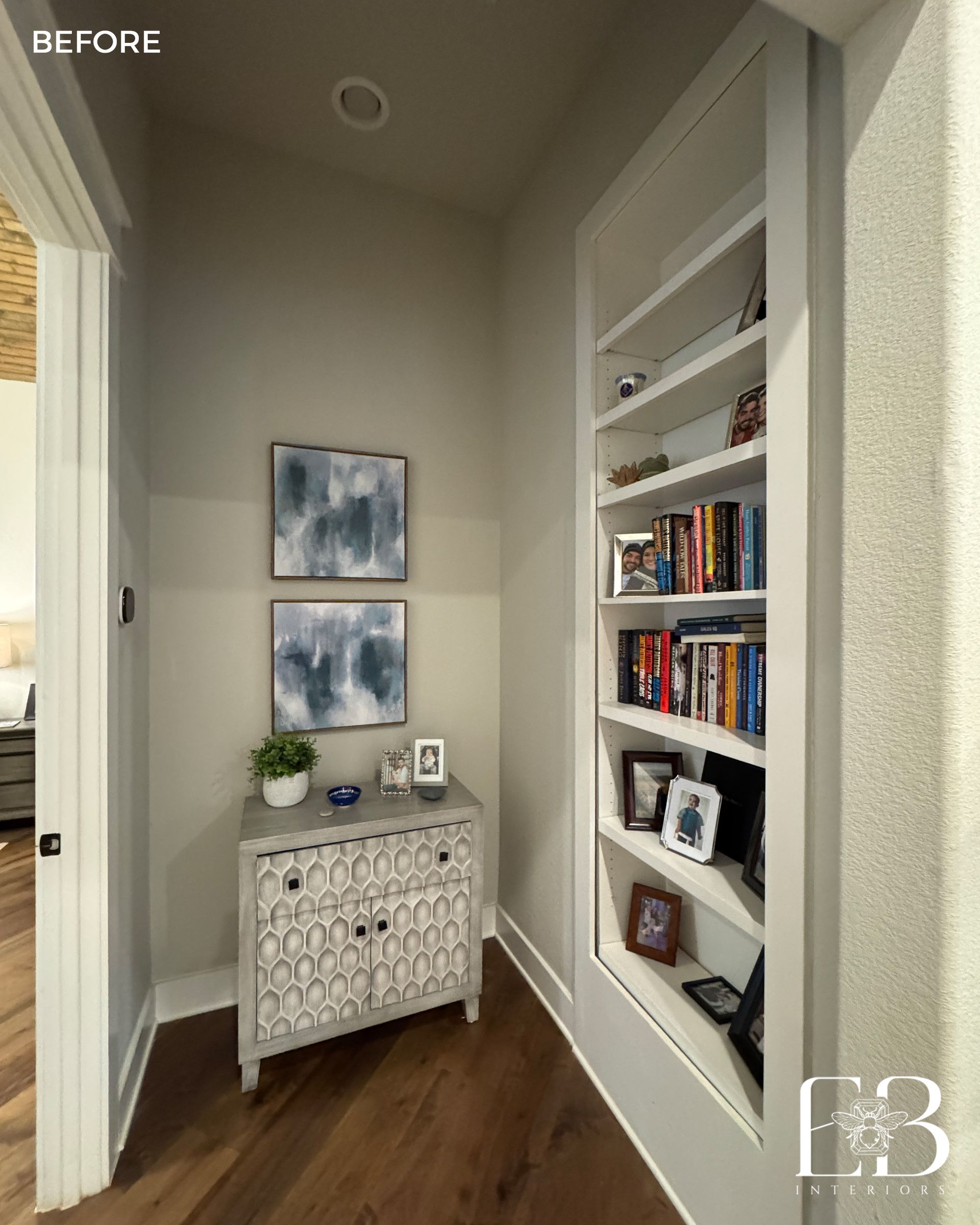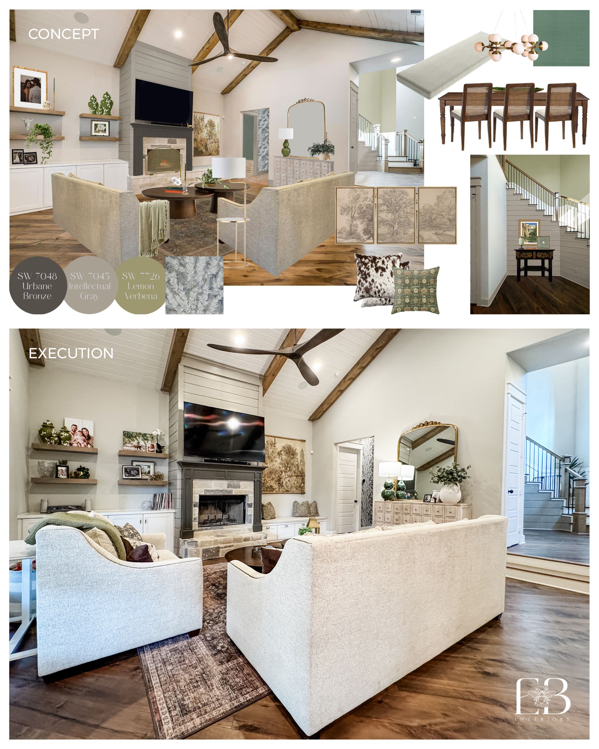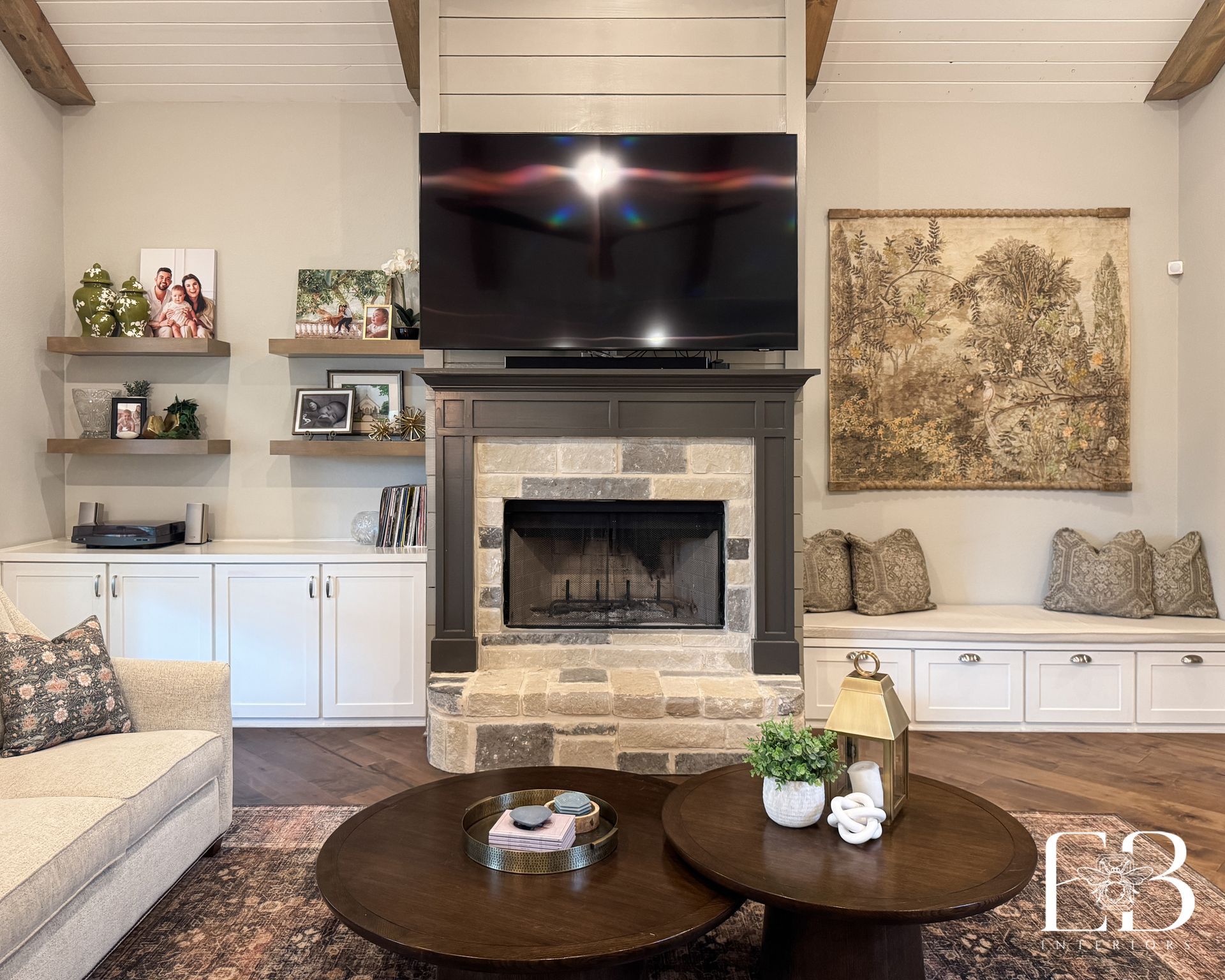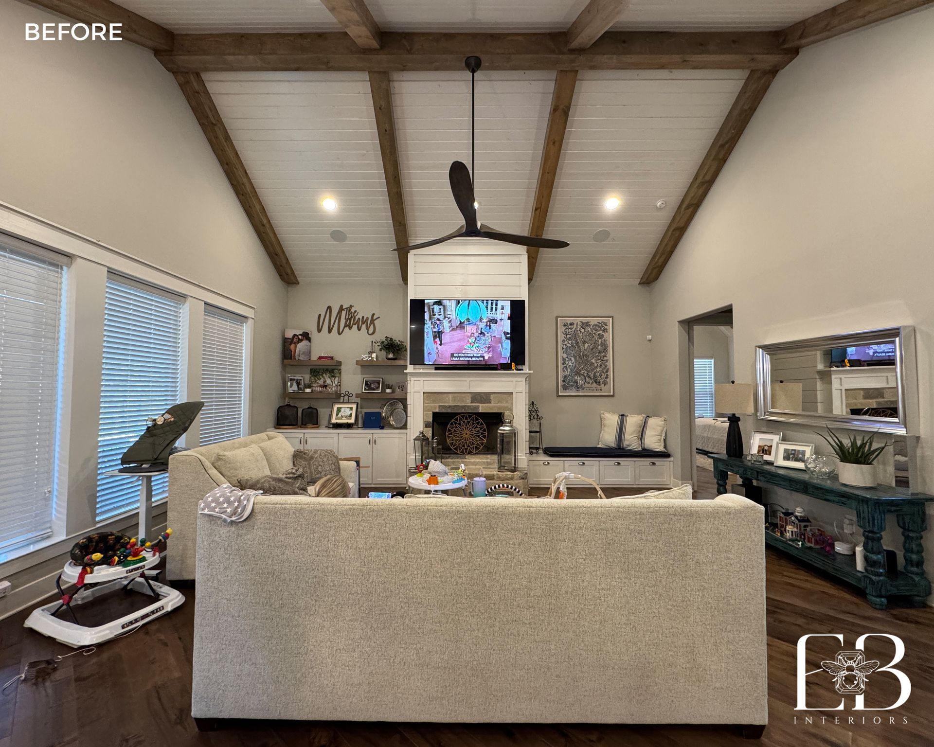 In the foyer and living room, Emerald Bee Interiors reimagined the existing space to move away from a farmhouse palette of muted blues toward a more sophisticated mix of greens, golds, and layered neutrals. The shiplap in both the entry and fireplace surround was painted a warm gray, grounding the space and creating a subtle connection between rooms. Larger investment pieces—such as the existing sofas—were retained, while new artwork, textiles, and lighting introduced richness and depth. A pop of wallpaper was added in the small hallway off the primary bedroom to echo the warm gray tones and add visual interest. Custom window treatment concepts were developed to enhance natural light and accommodate the household’s pets.