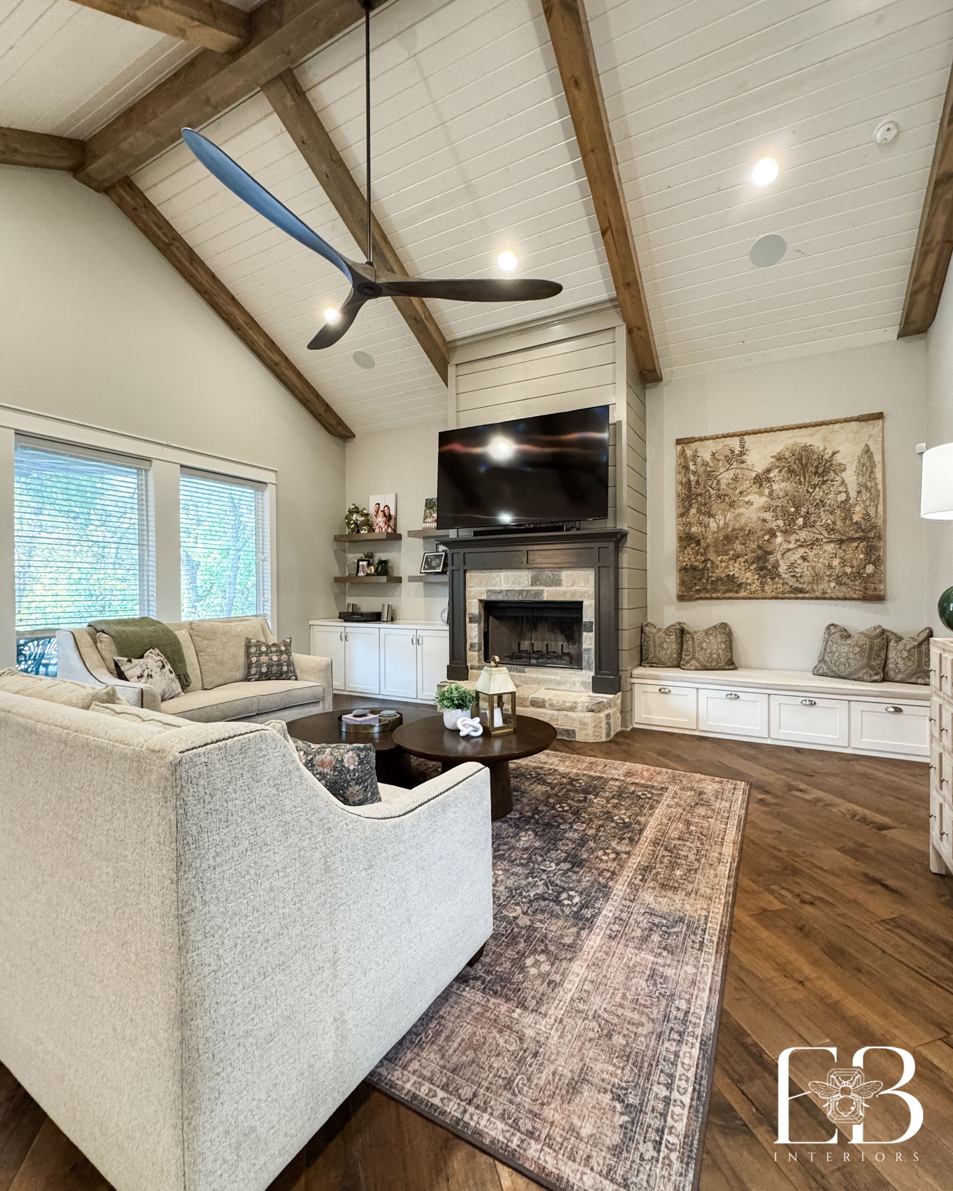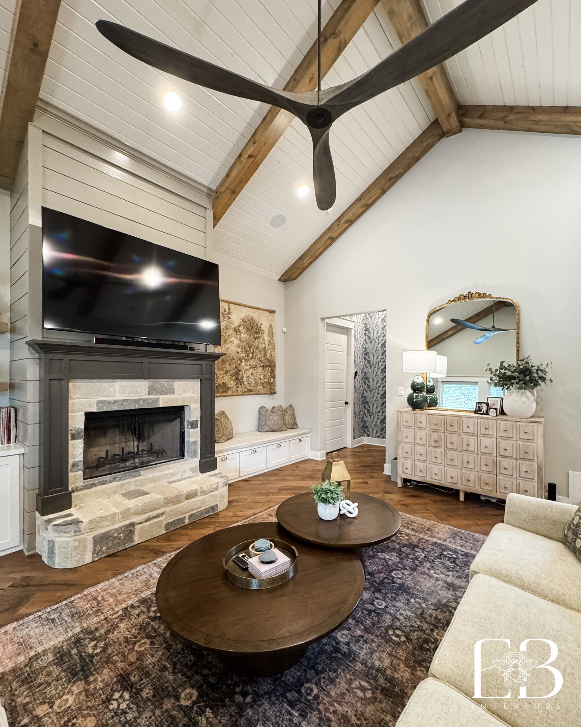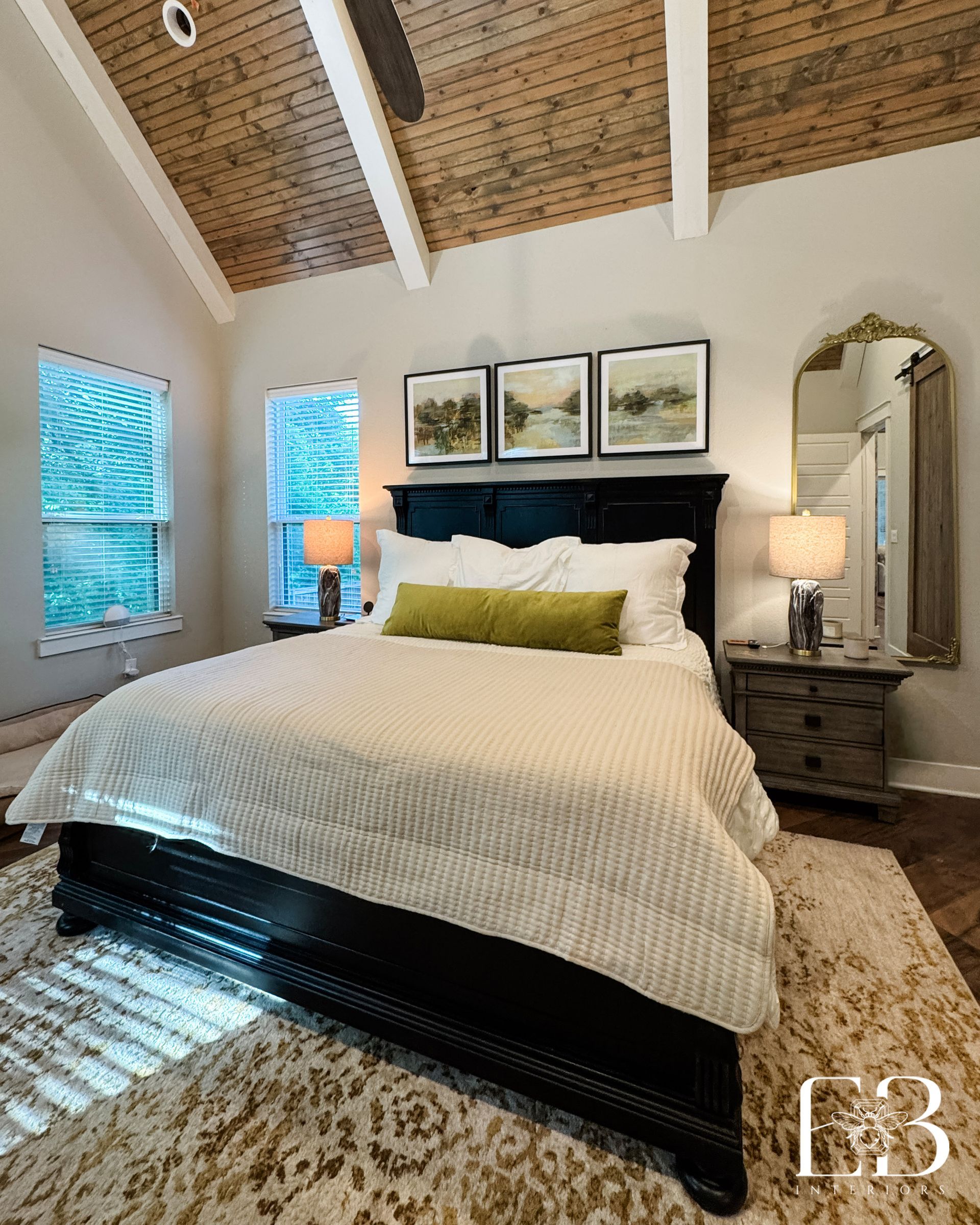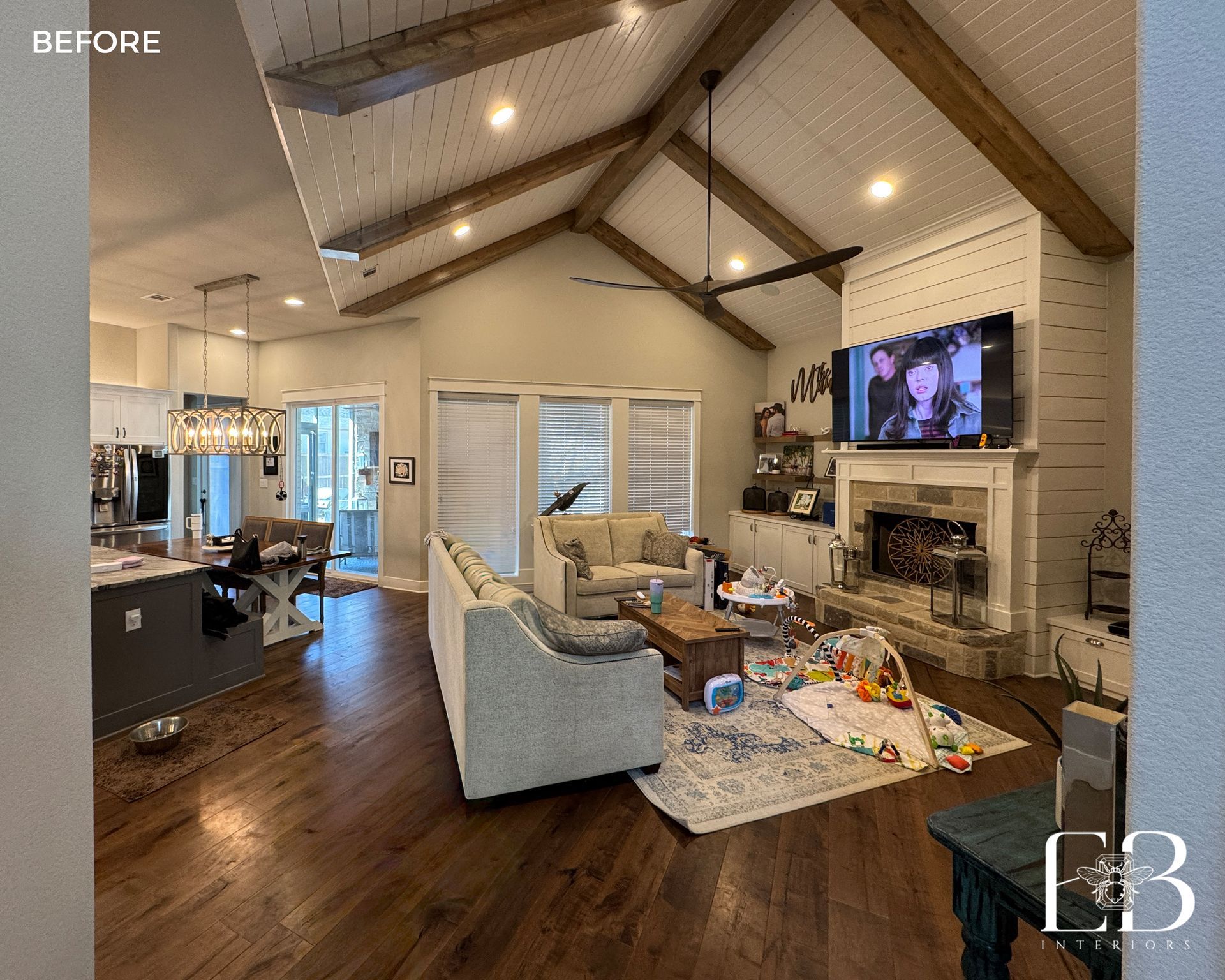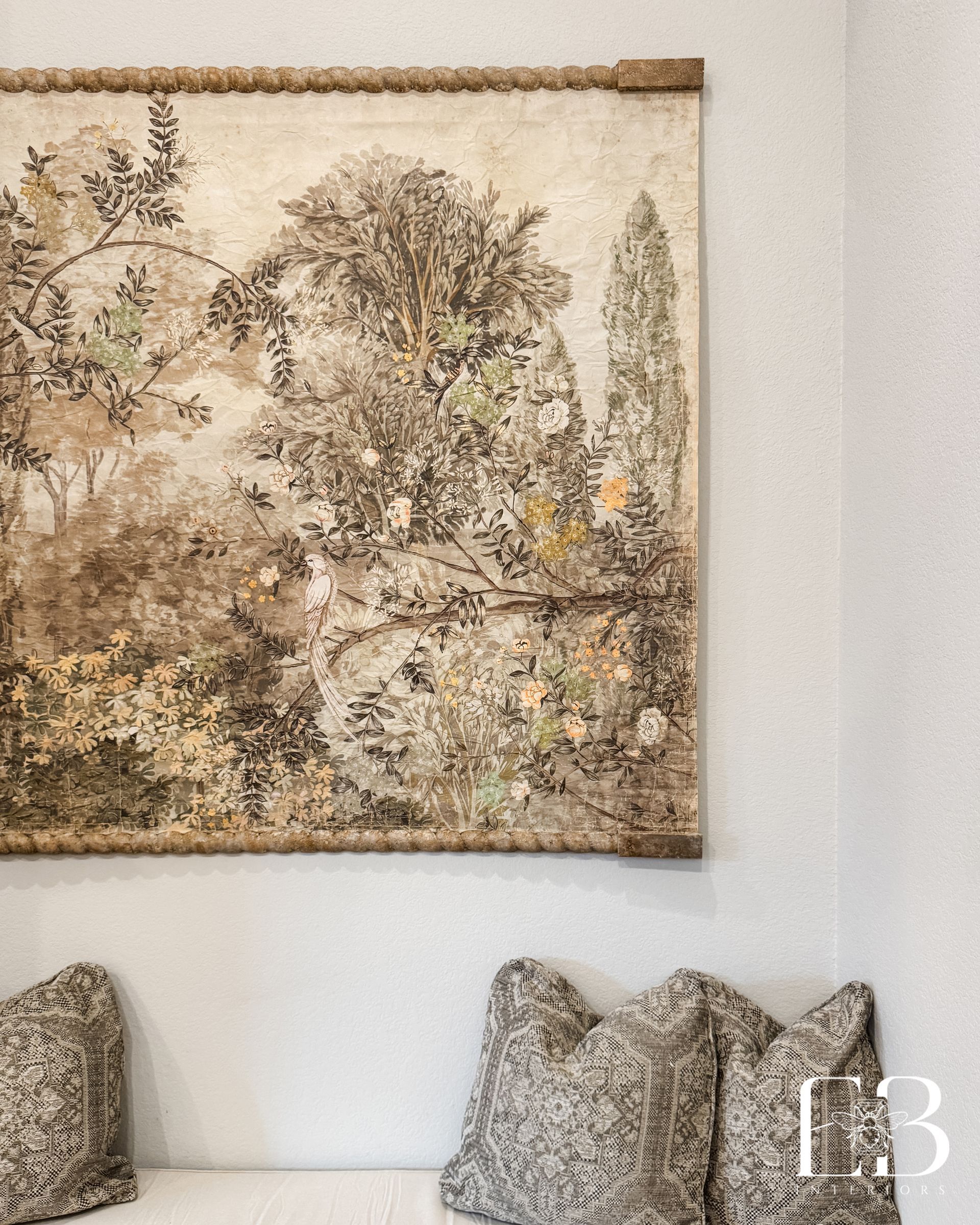 In the foyer and living room, Emerald Bee Interiors reimagined the existing space to move away from a farmhouse palette of muted blues toward a more sophisticated mix of greens, golds, and layered neutrals. The shiplap in both the entry and fireplace surround was painted a warm gray, grounding the space and creating a subtle connection between rooms. Larger investment pieces—such as the existing sofas—were retained, while new artwork, textiles, and lighting introduced richness and depth. A pop of wallpaper was added in the small hallway off the primary bedroom to echo the warm gray tones and add visual interest. Custom window treatment concepts were developed to enhance natural light and accommodate the household’s pets.