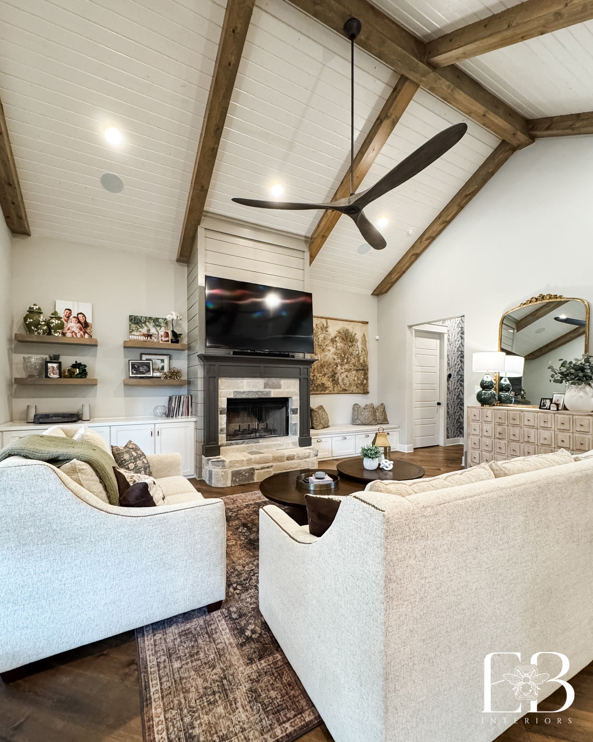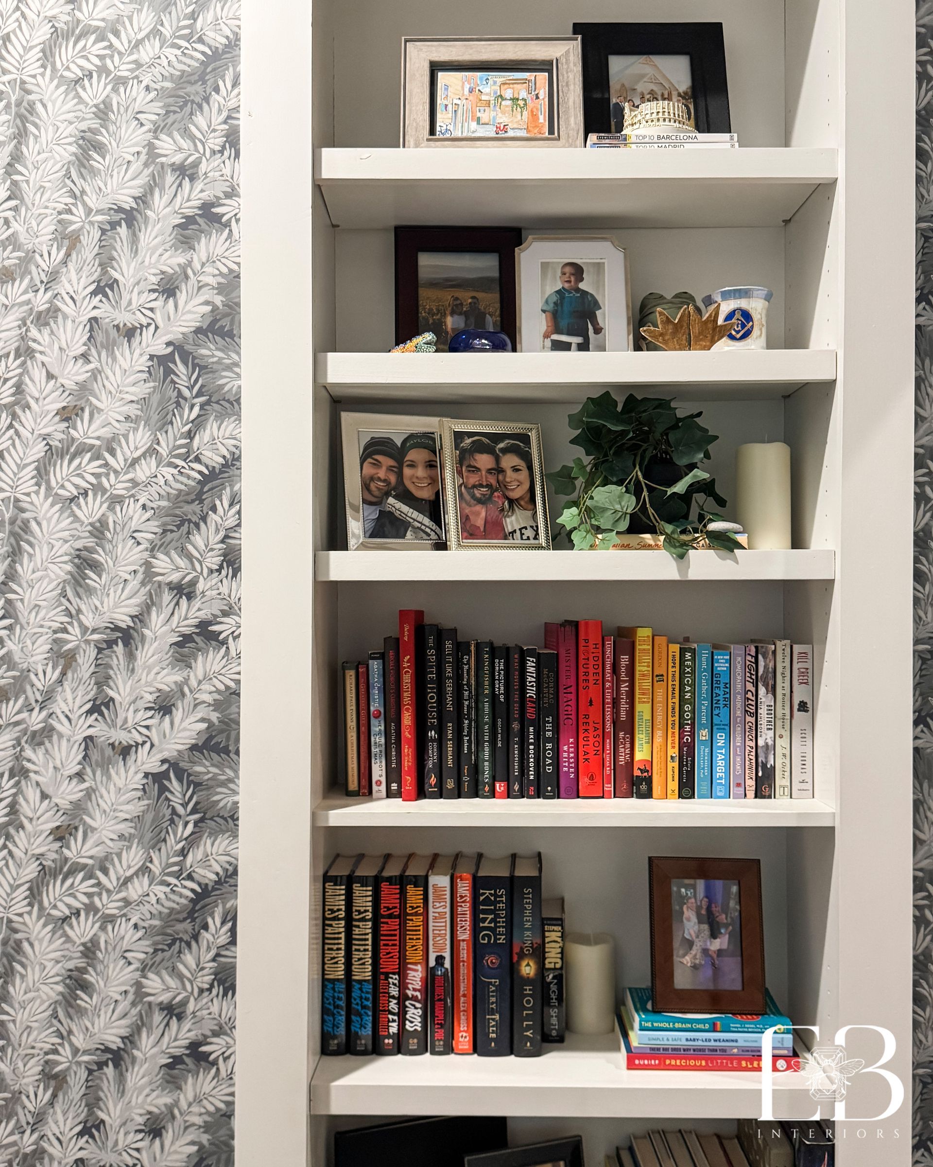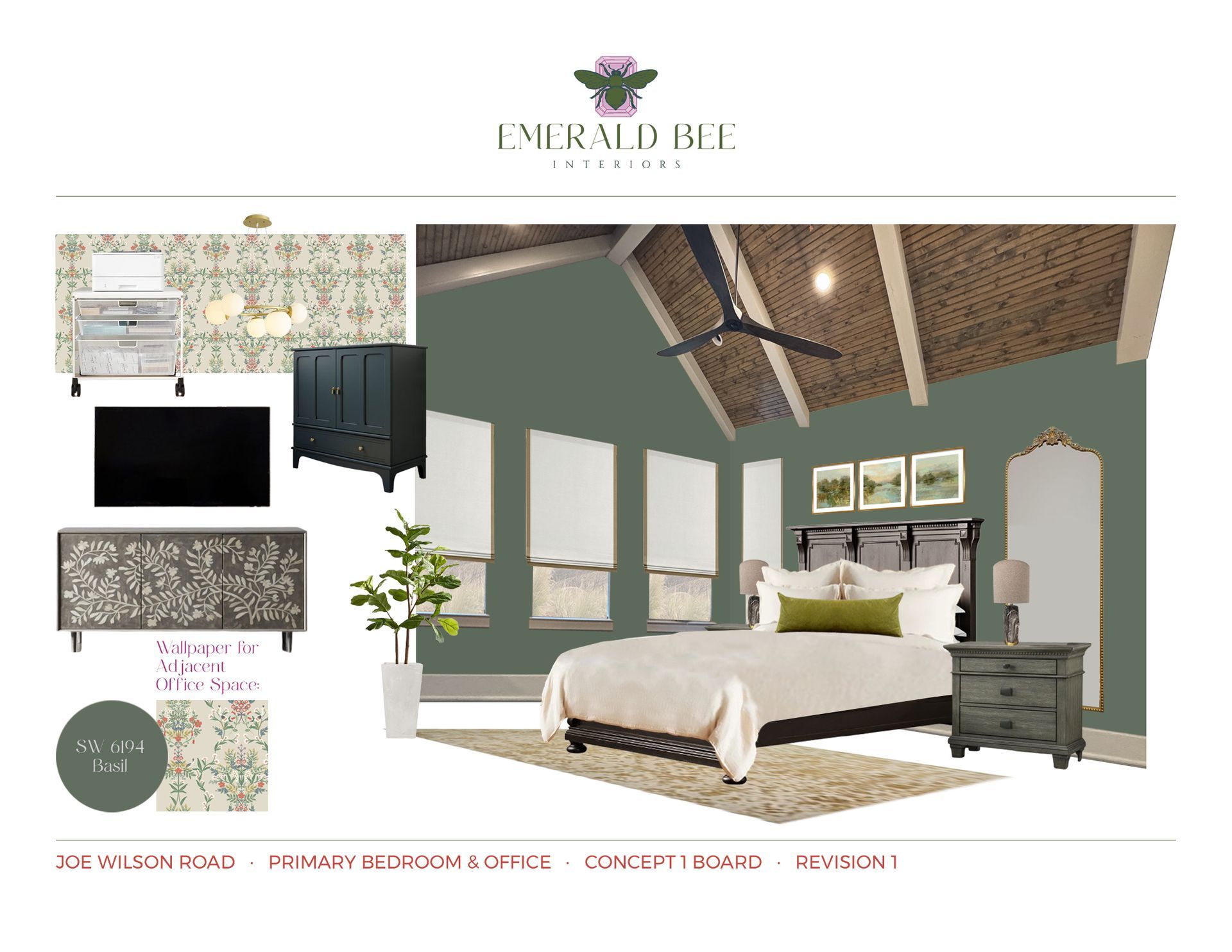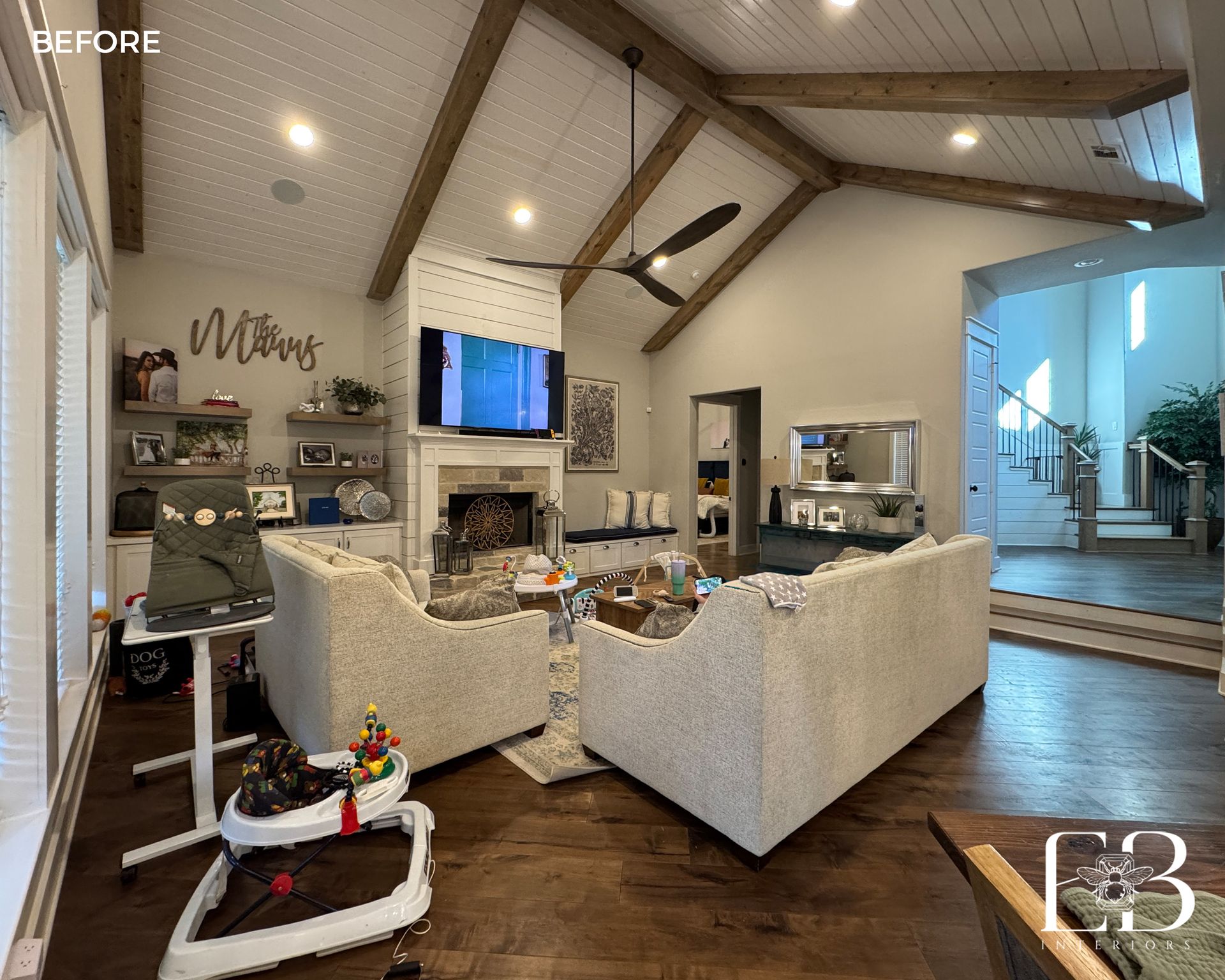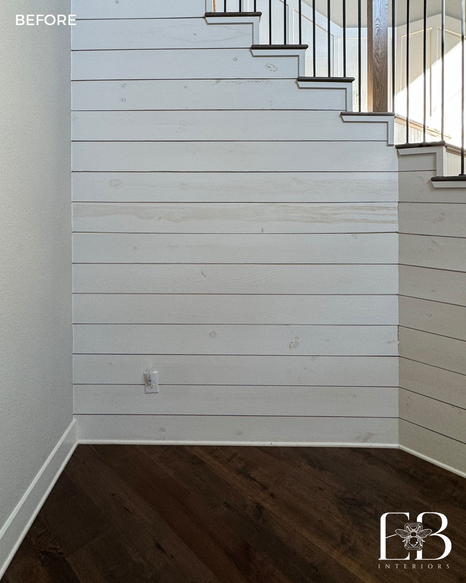 In the foyer and living room, Emerald Bee Interiors reimagined the existing space to move away from a farmhouse palette of muted blues toward a more sophisticated mix of greens, golds, and layered neutrals. The shiplap in both the entry and fireplace surround was painted a warm gray, grounding the space and creating a subtle connection between rooms. Larger investment pieces—such as the existing sofas—were retained, while new artwork, textiles, and lighting introduced richness and depth. A pop of wallpaper was added in the small hallway off the primary bedroom to echo the warm gray tones and add visual interest. Custom window treatment concepts were developed to enhance natural light and accommodate the household’s pets.