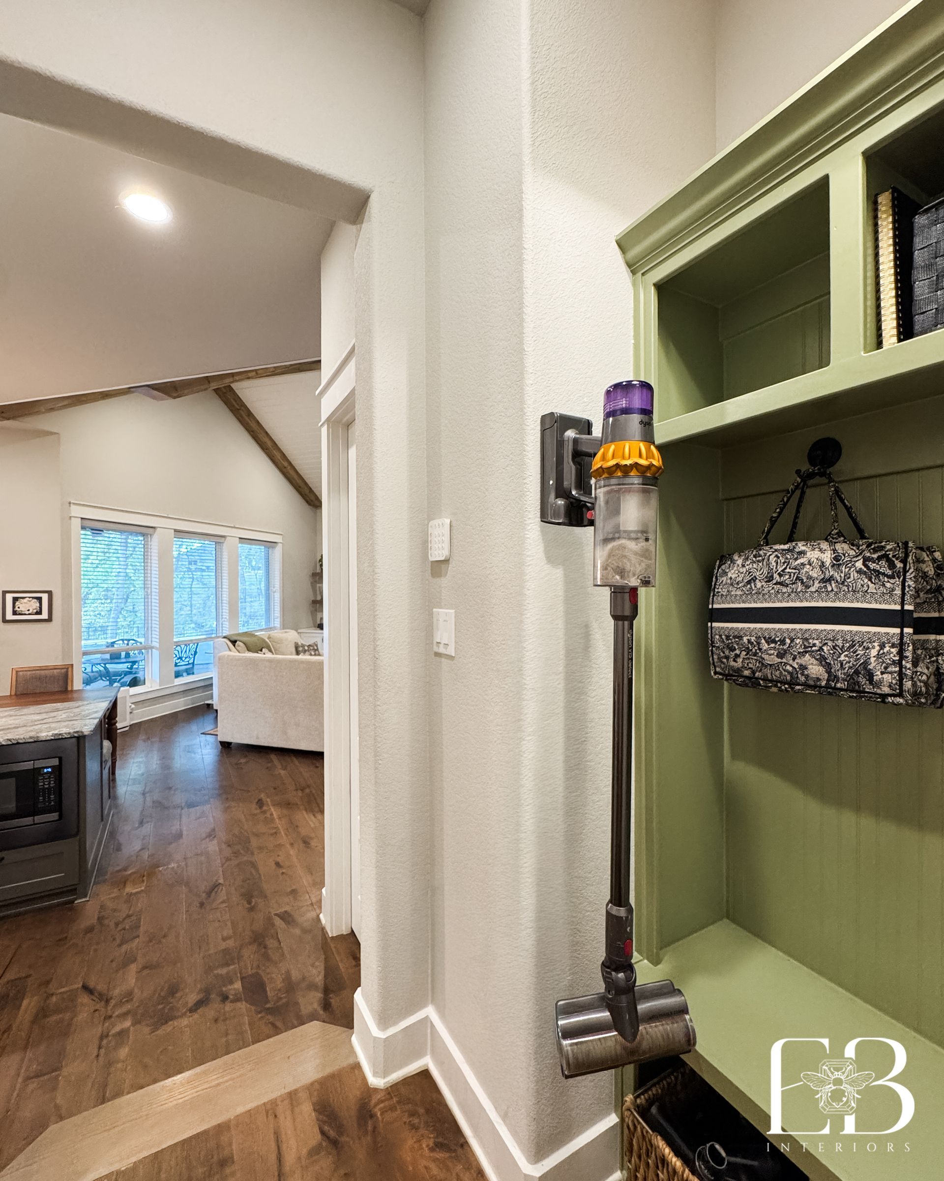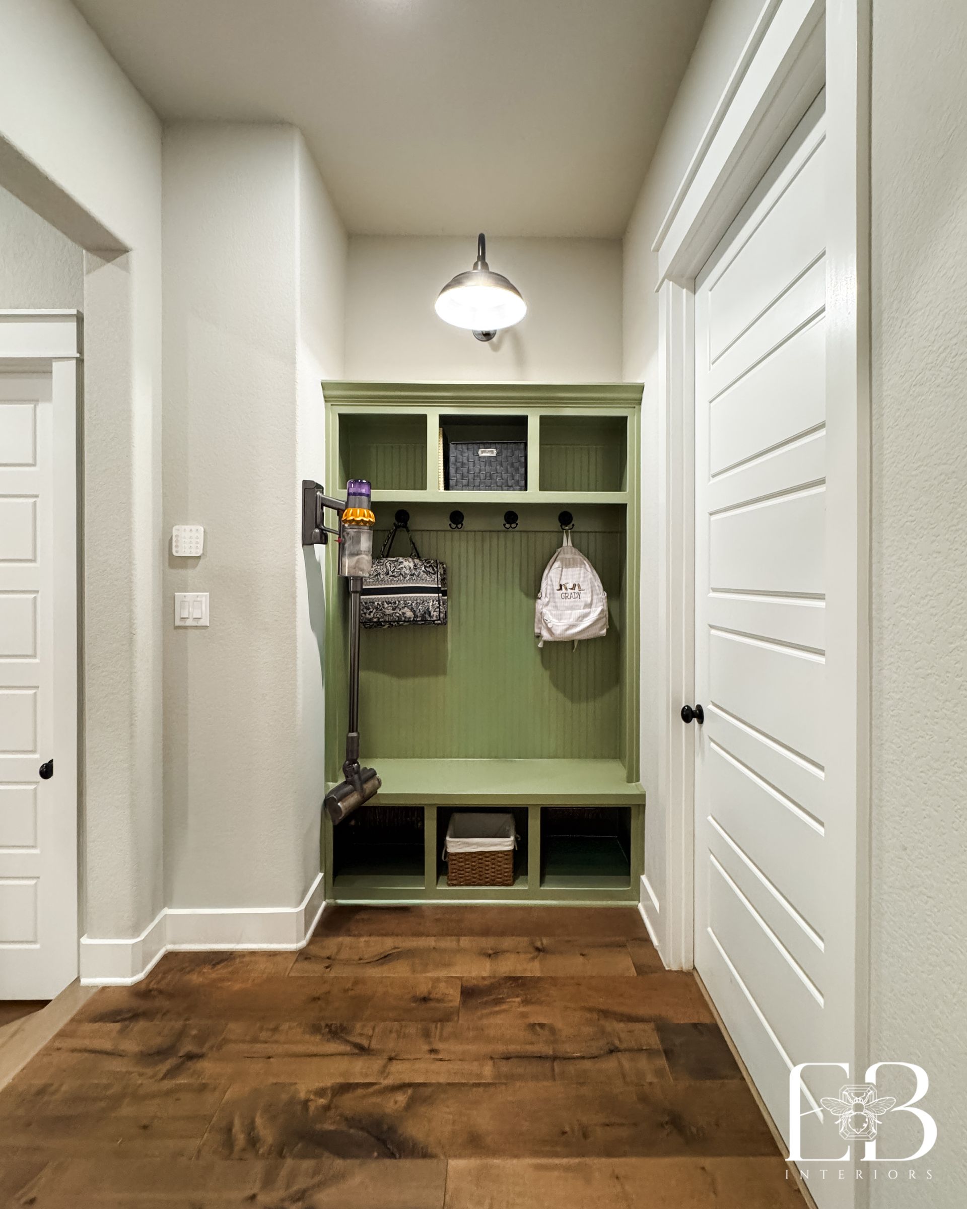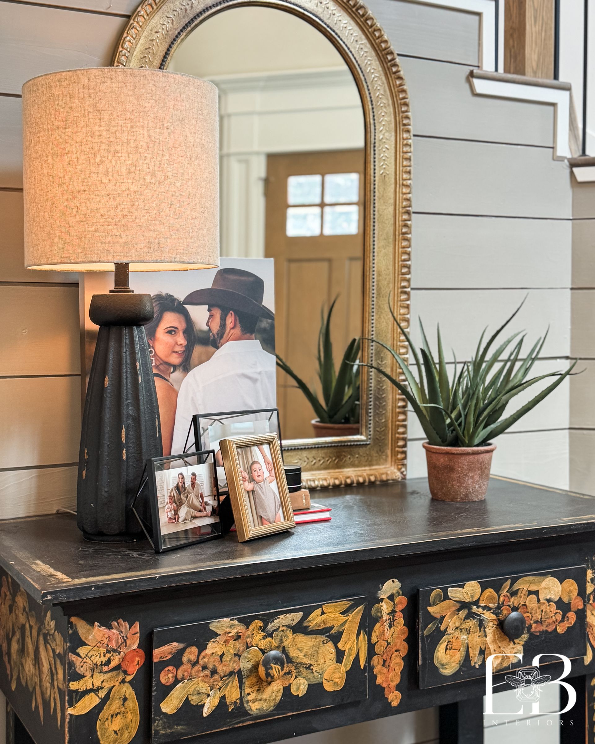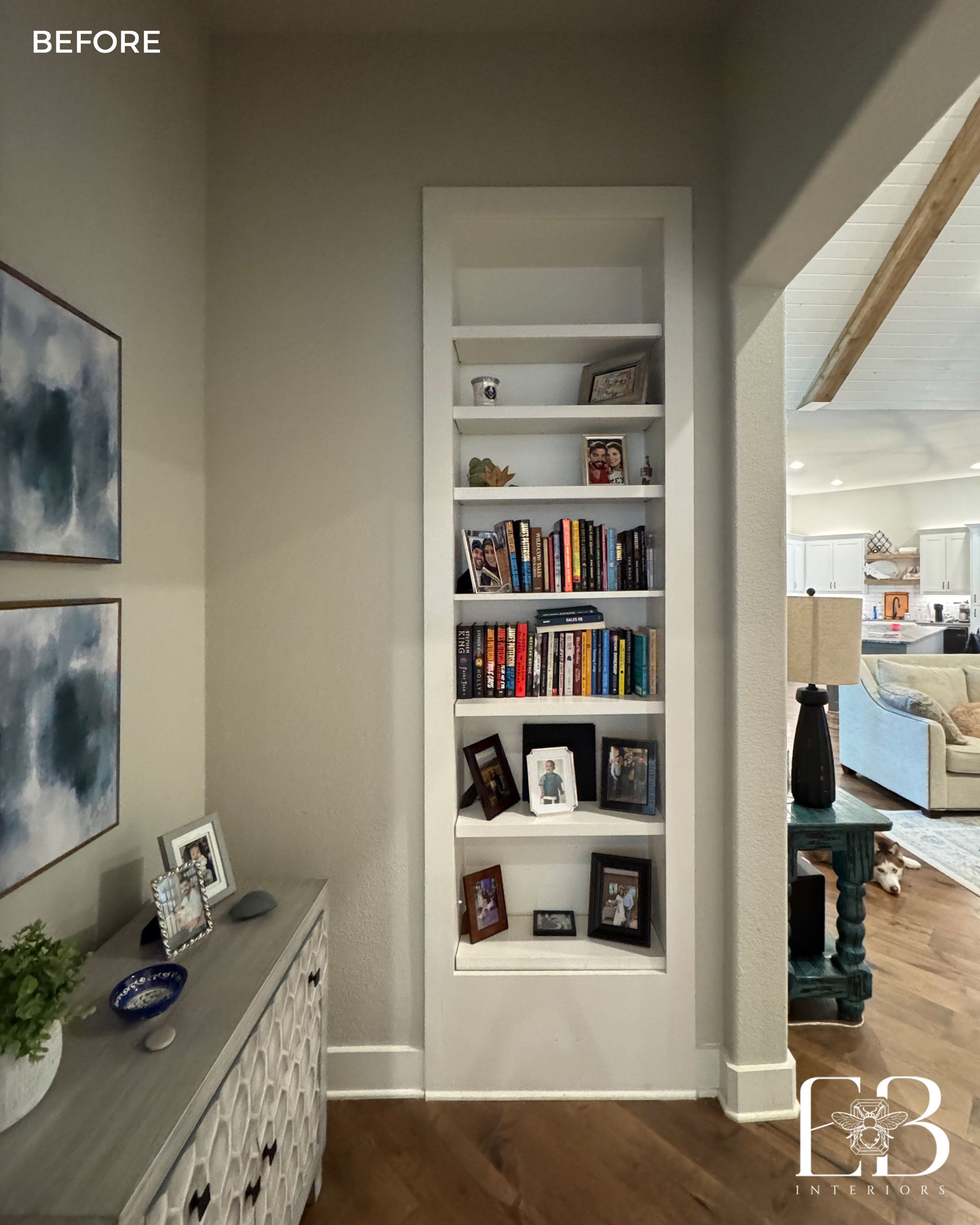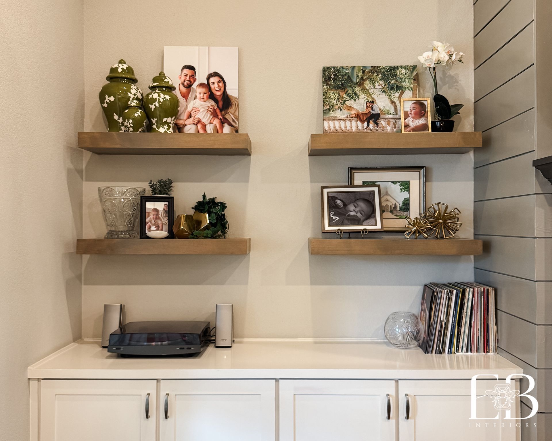 In the foyer and living room, Emerald Bee Interiors reimagined the existing space to move away from a farmhouse palette of muted blues toward a more sophisticated mix of greens, golds, and layered neutrals. The shiplap in both the entry and fireplace surround was painted a warm gray, grounding the space and creating a subtle connection between rooms. Larger investment pieces—such as the existing sofas—were retained, while new artwork, textiles, and lighting introduced richness and depth. A pop of wallpaper was added in the small hallway off the primary bedroom to echo the warm gray tones and add visual interest. Custom window treatment concepts were developed to enhance natural light and accommodate the household’s pets.