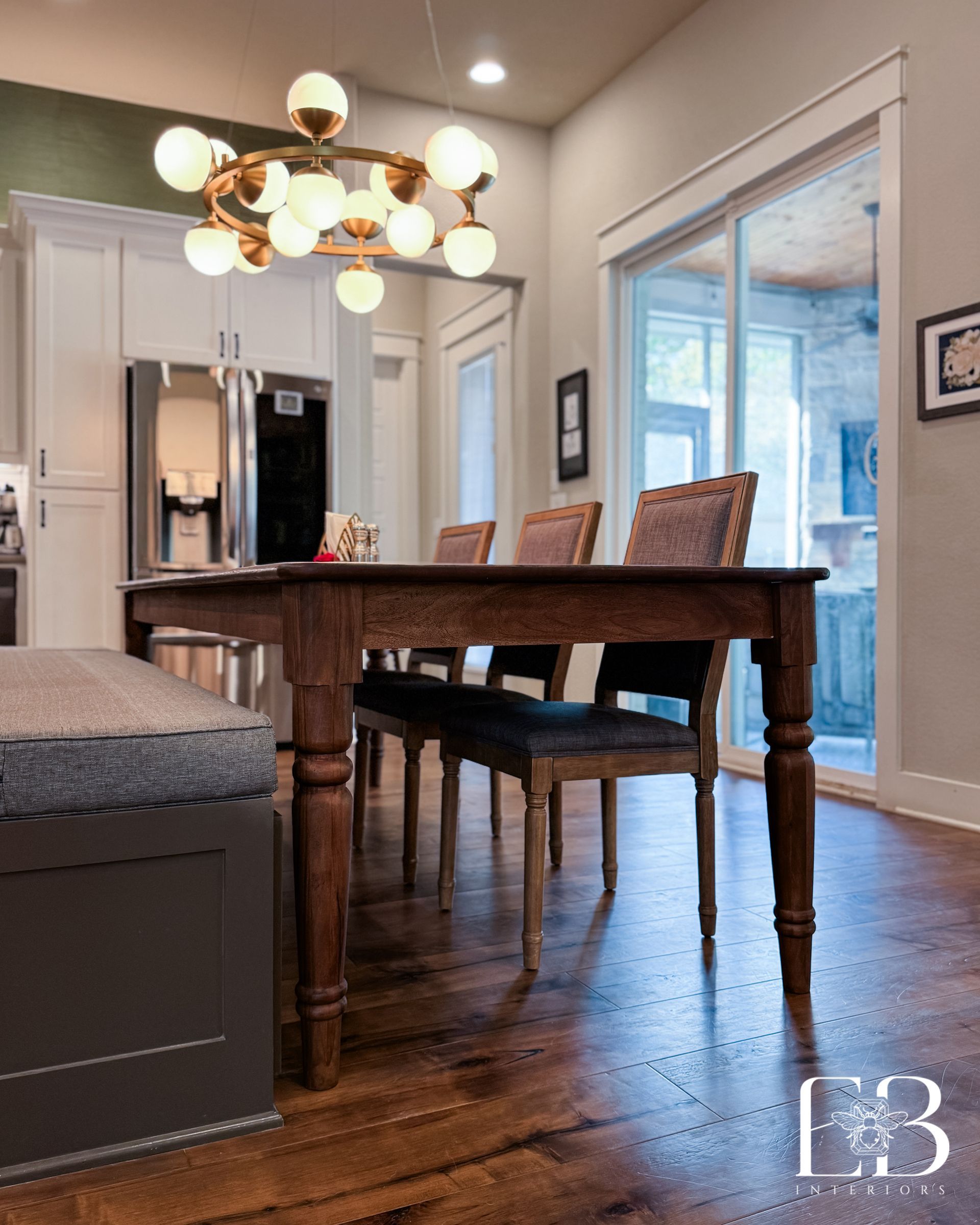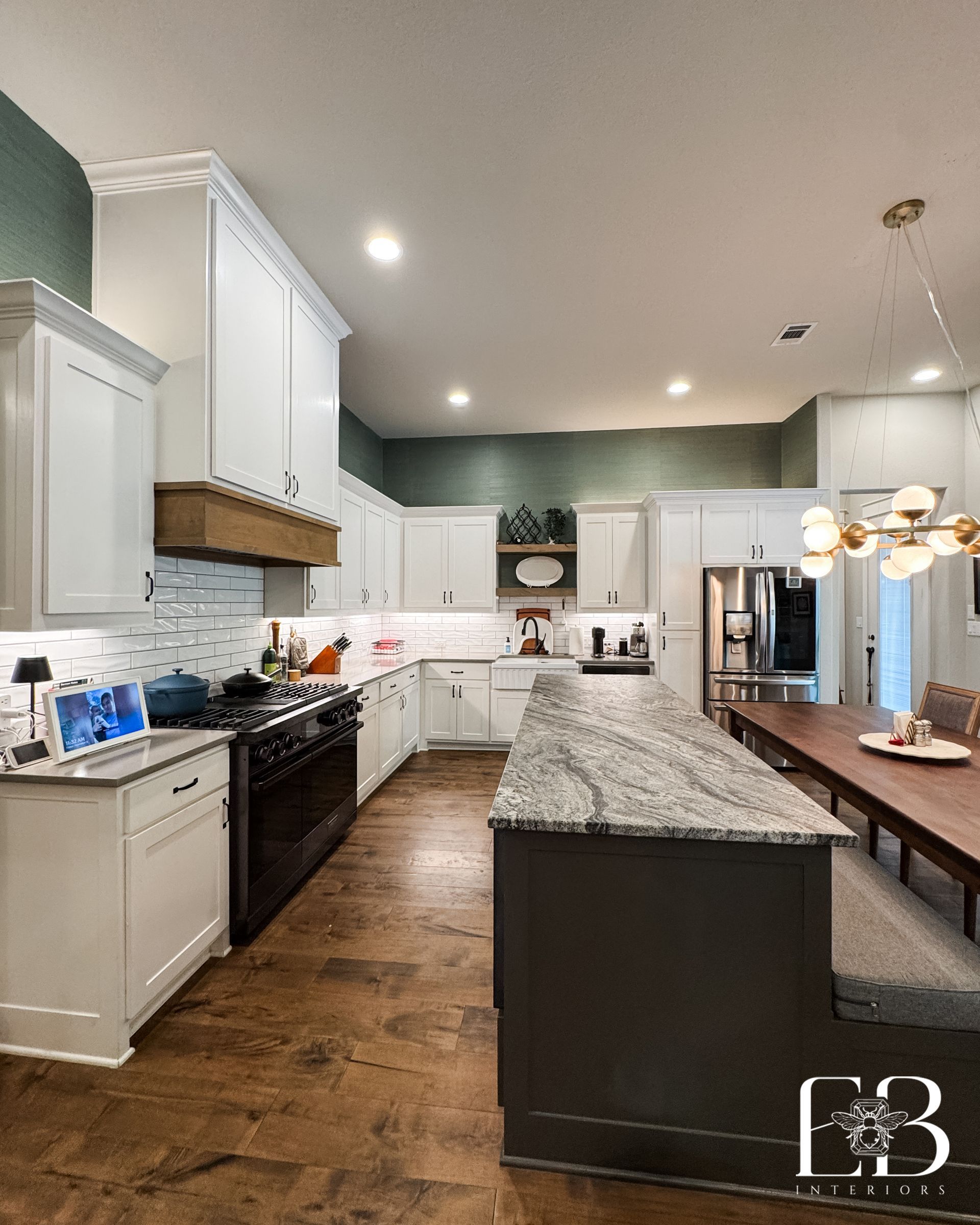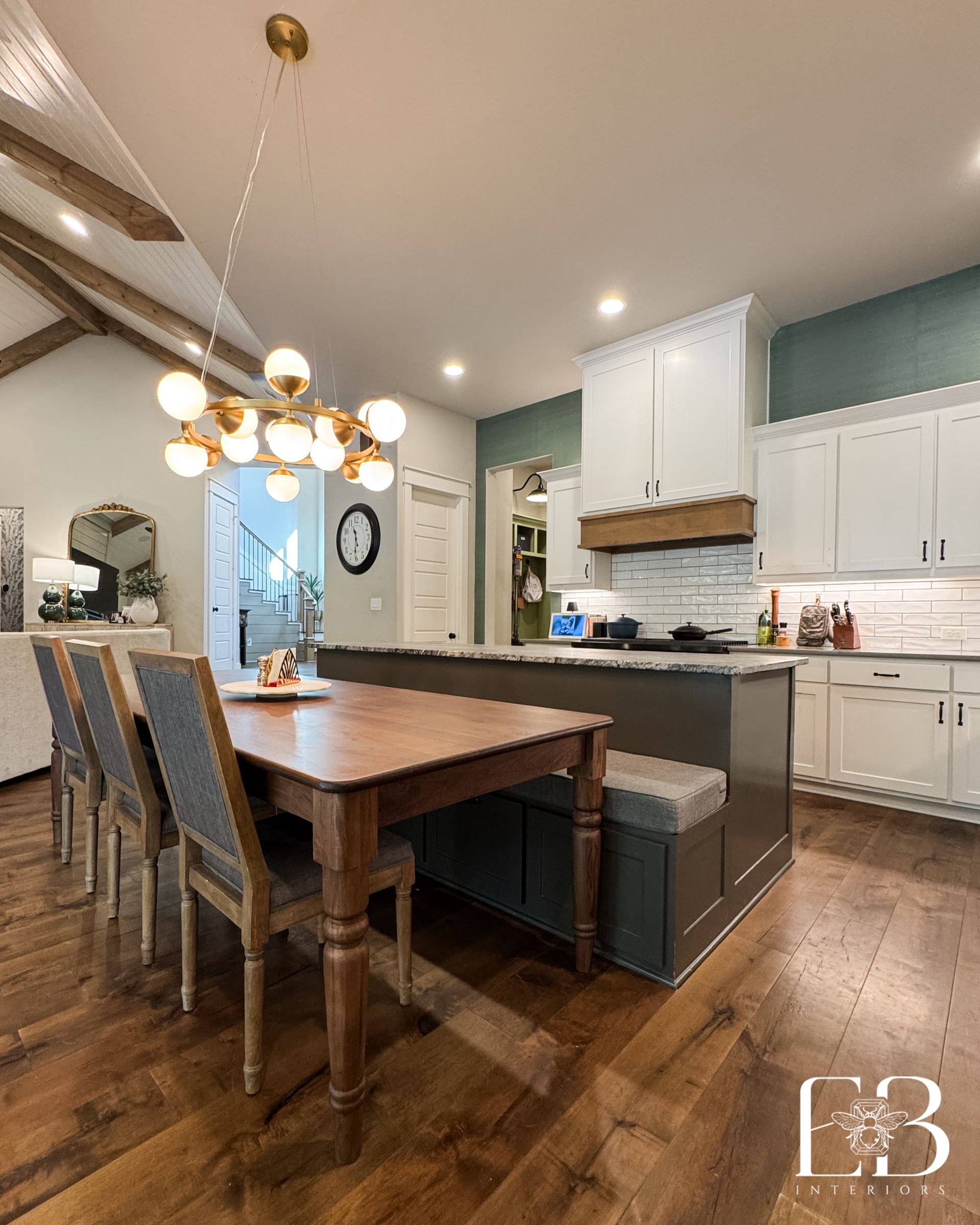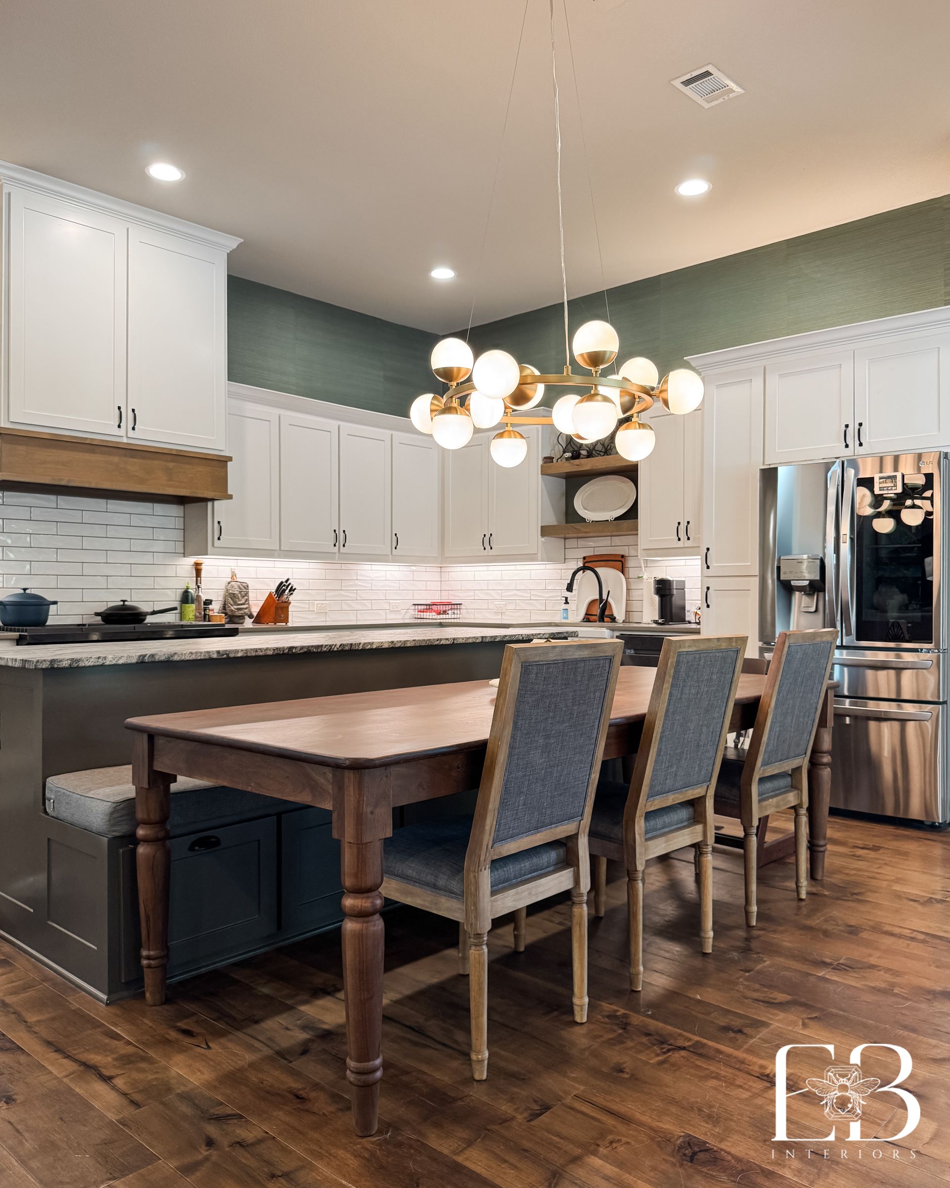 In the kitchen, a green grasscloth wallpaper was installed to provide contrast and texture, complementing the updated color story. The island was repainted to match the new mantel finish, creating a cohesive flow through the open-concept areas. The farmhouse-style table and light fixture were replaced with more transitional selections to align with the home’s refreshed aesthetic.