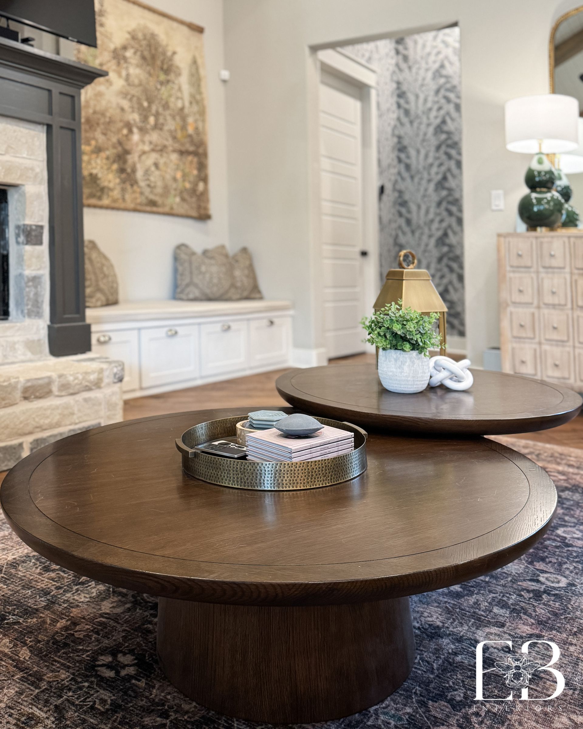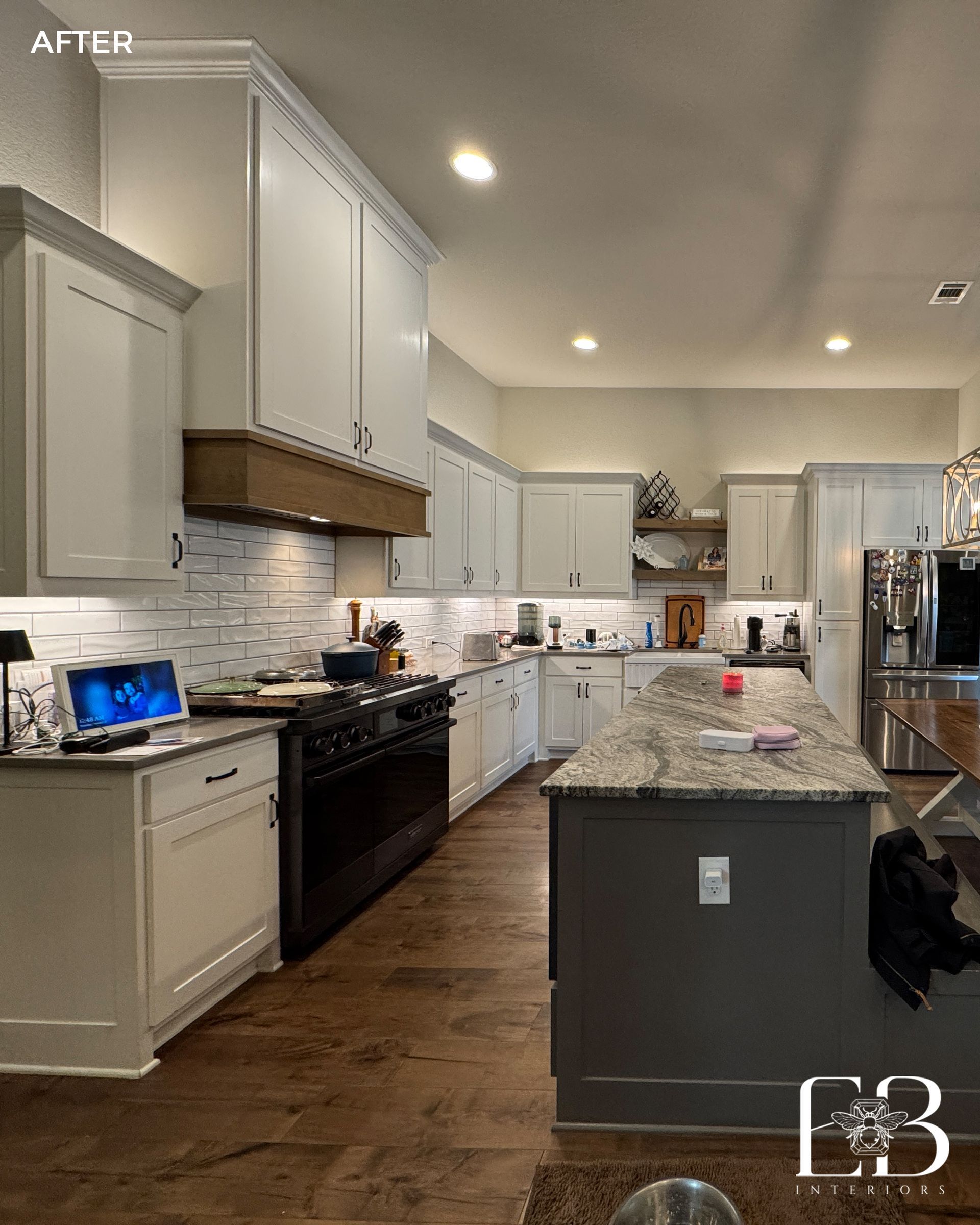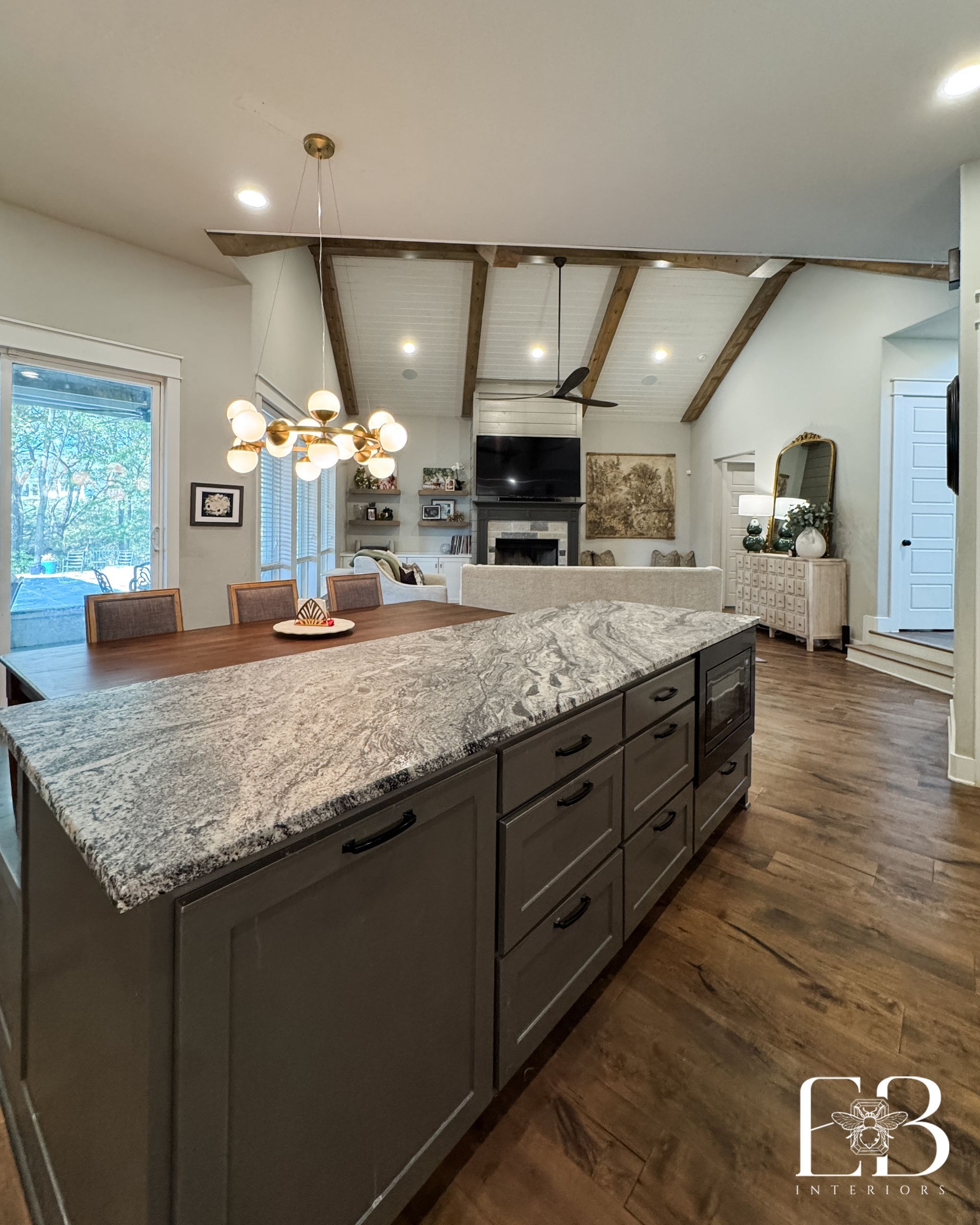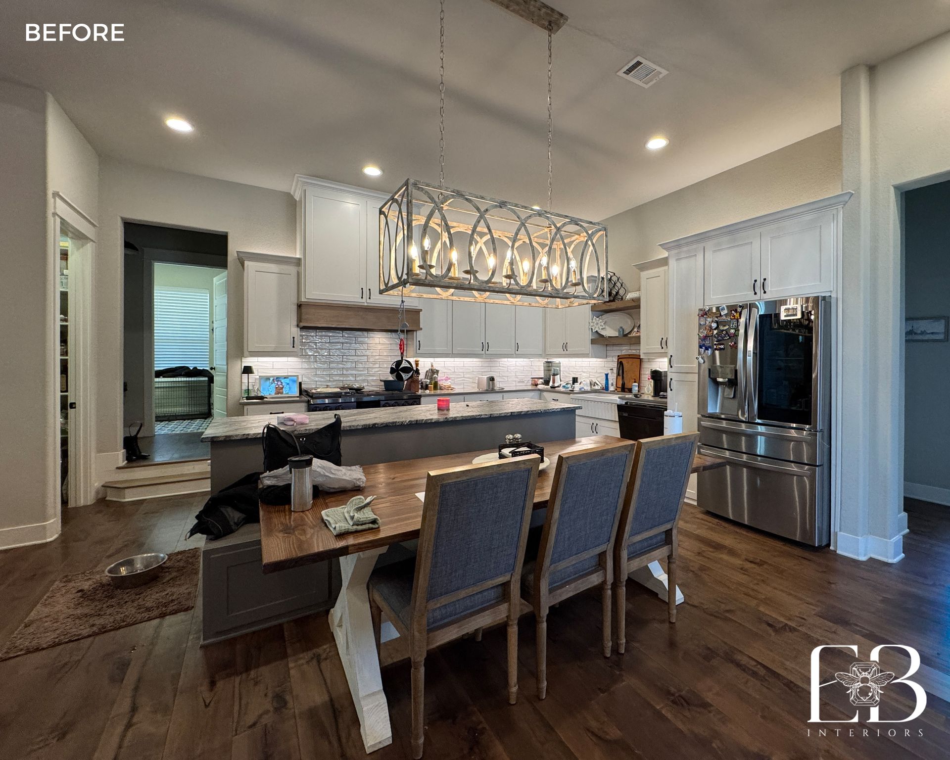 In the kitchen, a green grasscloth wallpaper was installed to provide contrast and texture, complementing the updated color story. The island was repainted to match the new mantel finish, creating a cohesive flow through the open-concept areas. The farmhouse-style table and light fixture were replaced with more transitional selections to align with the home’s refreshed aesthetic.