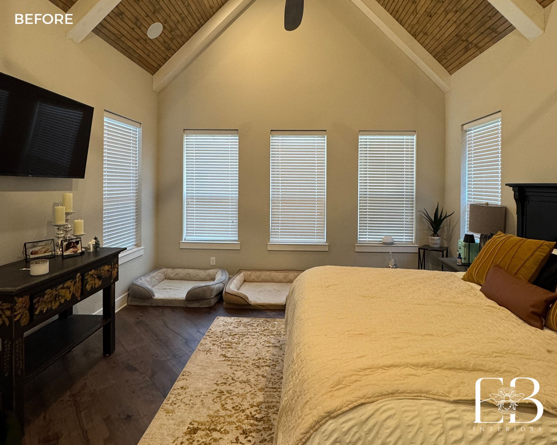 The primary bedroom built upon existing furnishings, including a Restoration Hardware bed and nightstands, with new additions such as a custom cabinet beneath the television and curated finishes to tie the space together. The adjoining study nook, visible from the bedroom, was designed in harmony with the suite for a seamless visual transition.