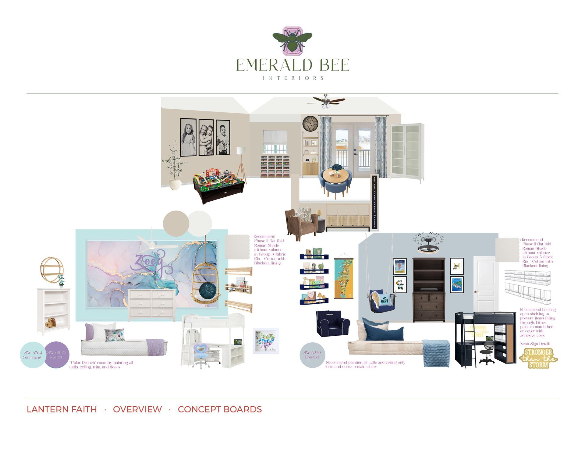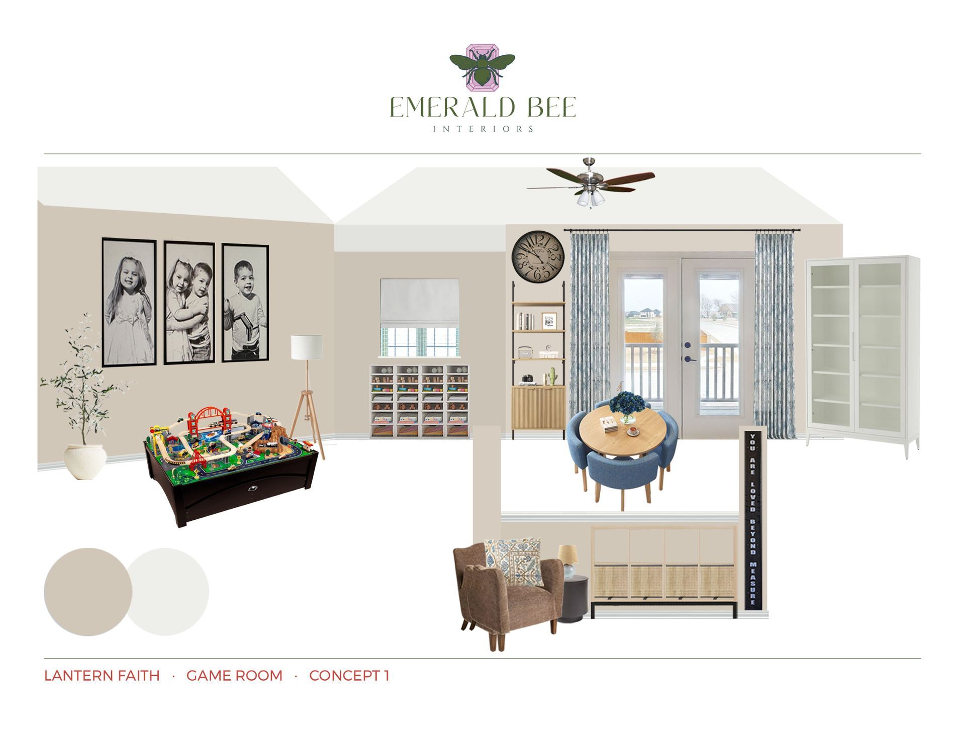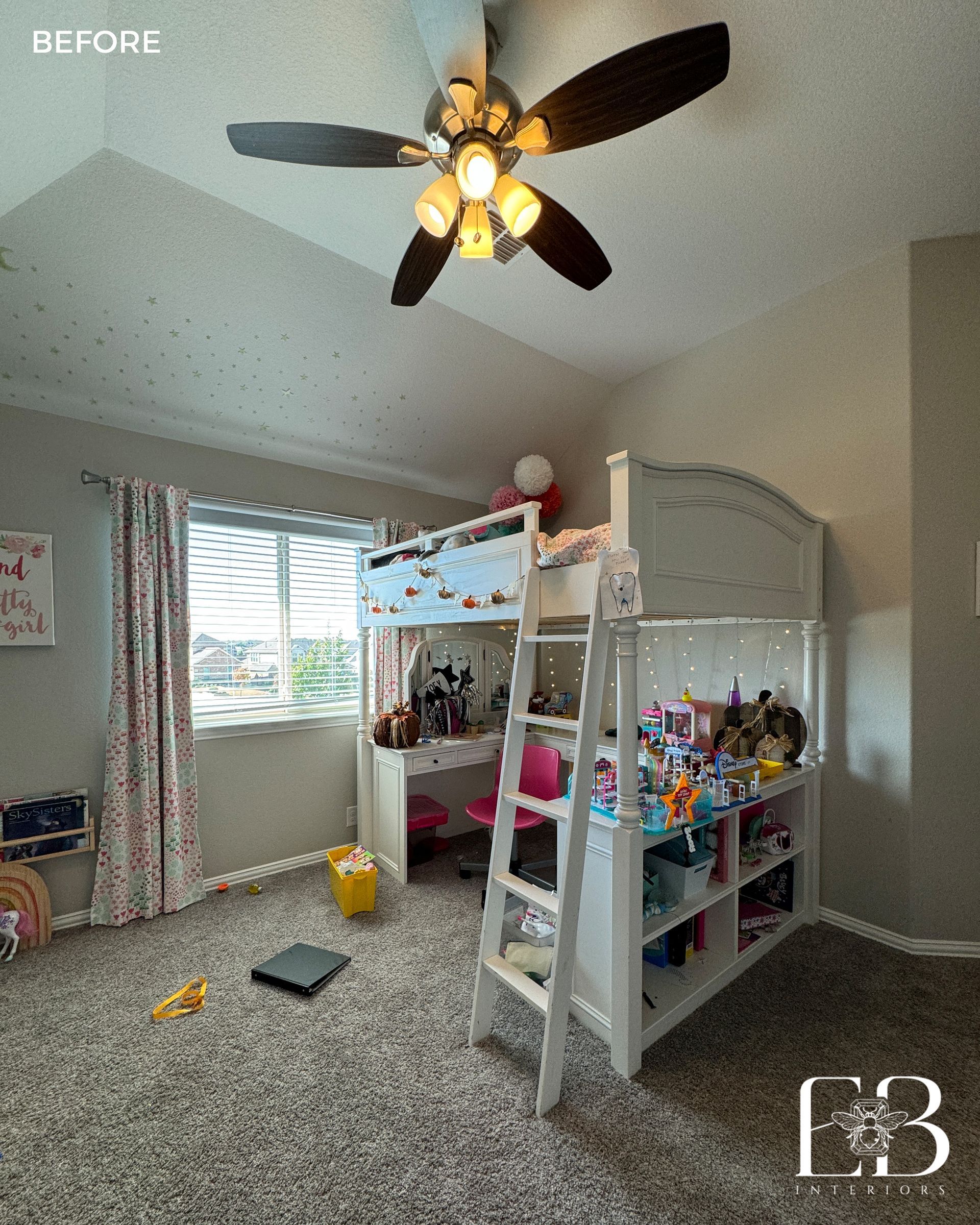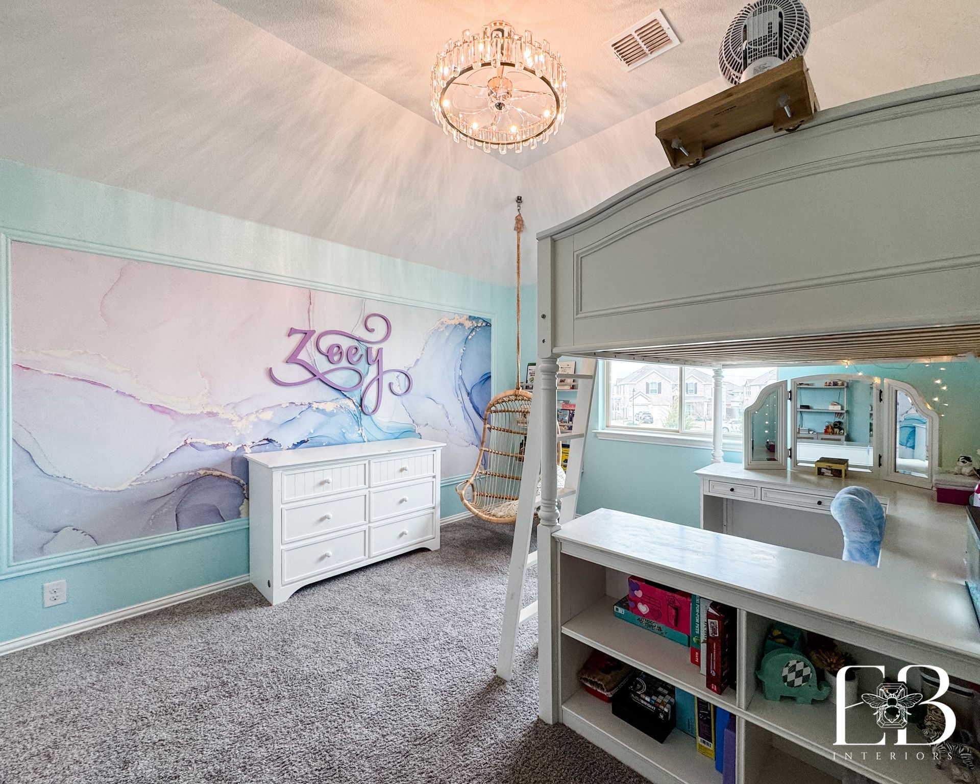 This design-only project for the Lantern Faith Residence centered on creating three distinct yet cohesive spaces—a daughter’s bedroom, a son’s bedroom, and a shared game room—all completed on a tight pre-holiday timeline. The children’s rooms were designed as a surprise Christmas gift, requiring efficient design decisions and thoughtful planning to achieve maximum impact within a limited window and budget. Emerald Bee Interiors later had the opportunity to return and professionally photograph the completed bedrooms, capturing how the designs translated from concept to reality.