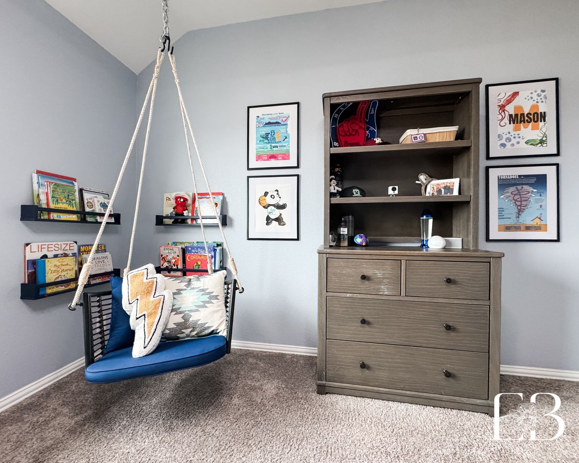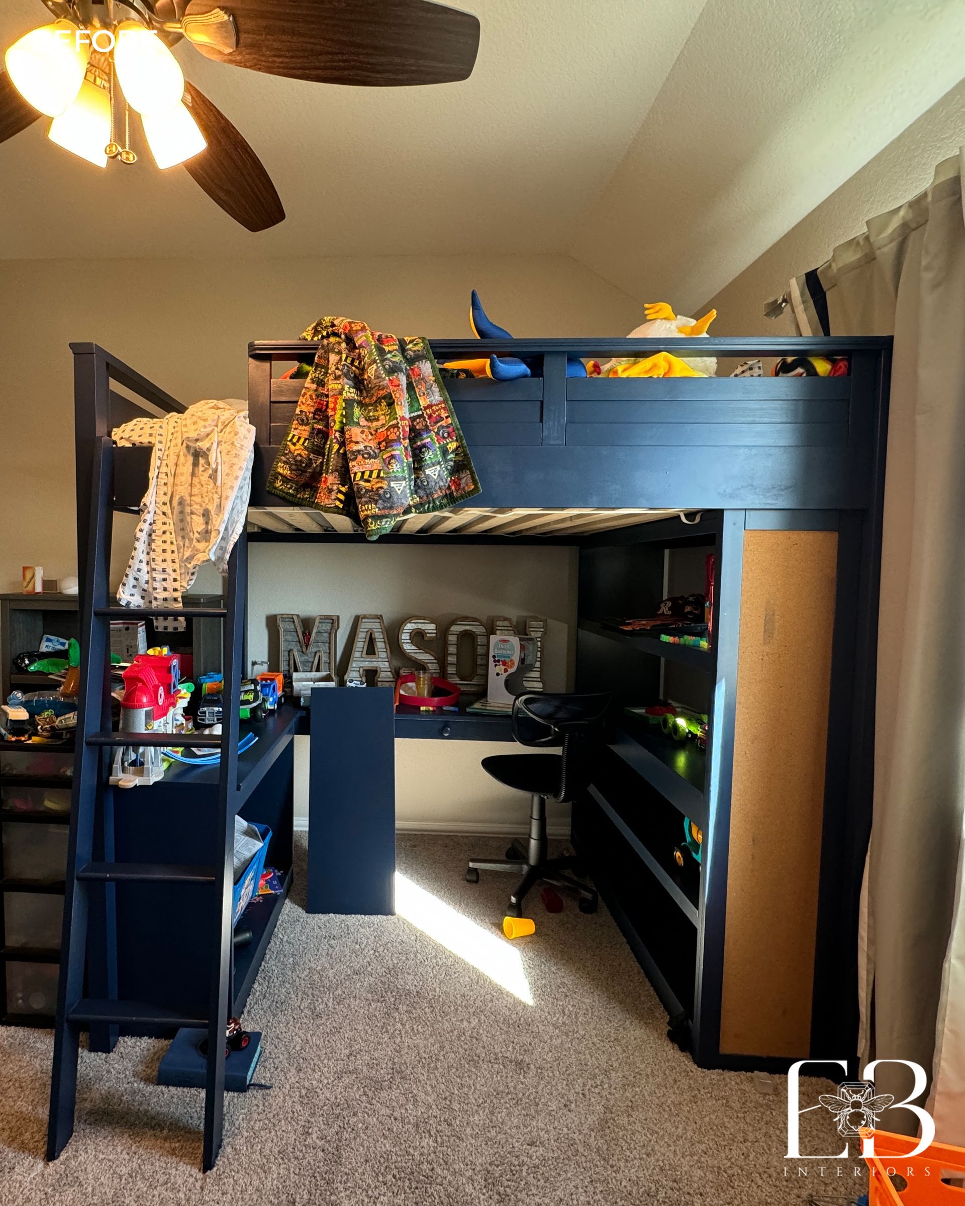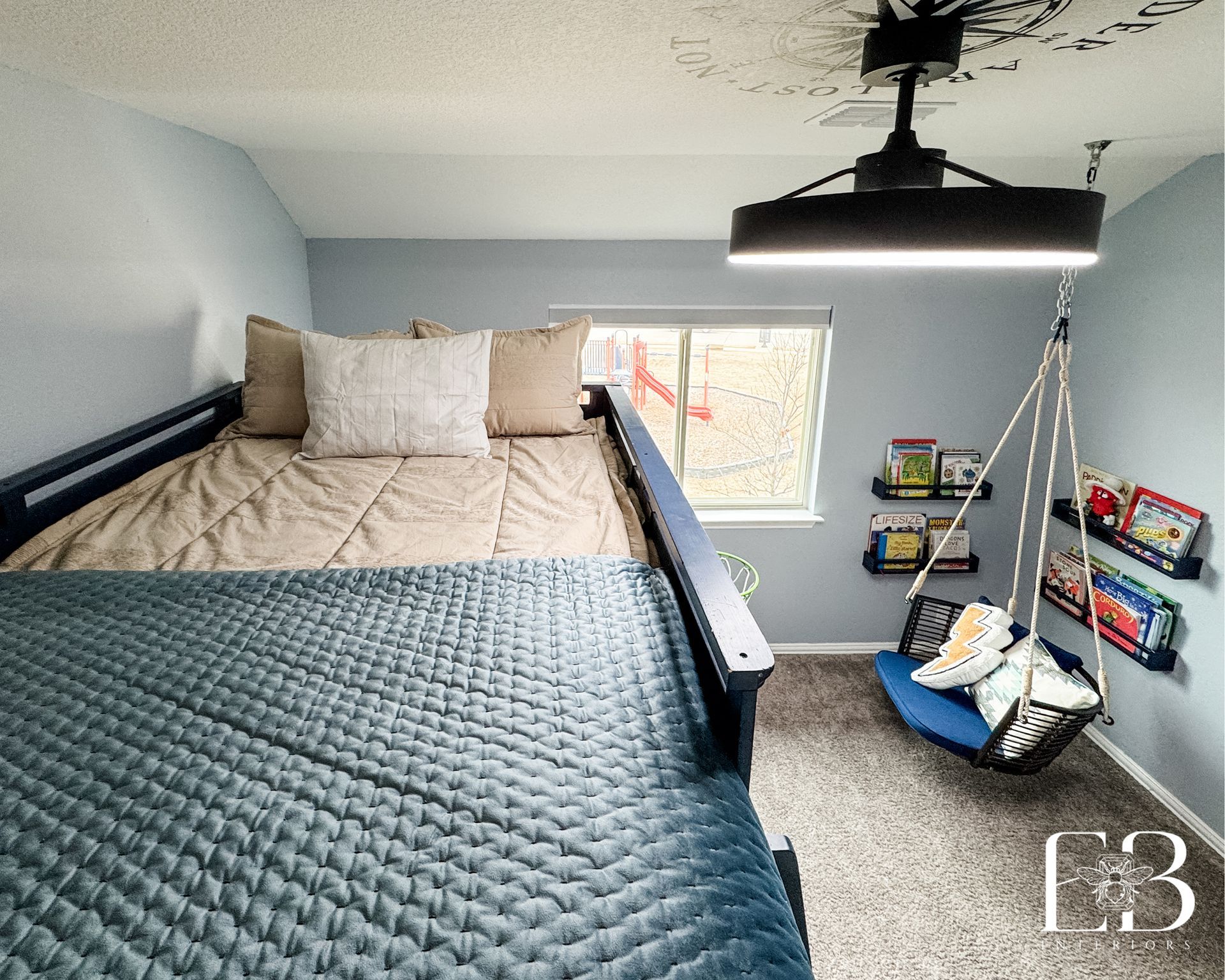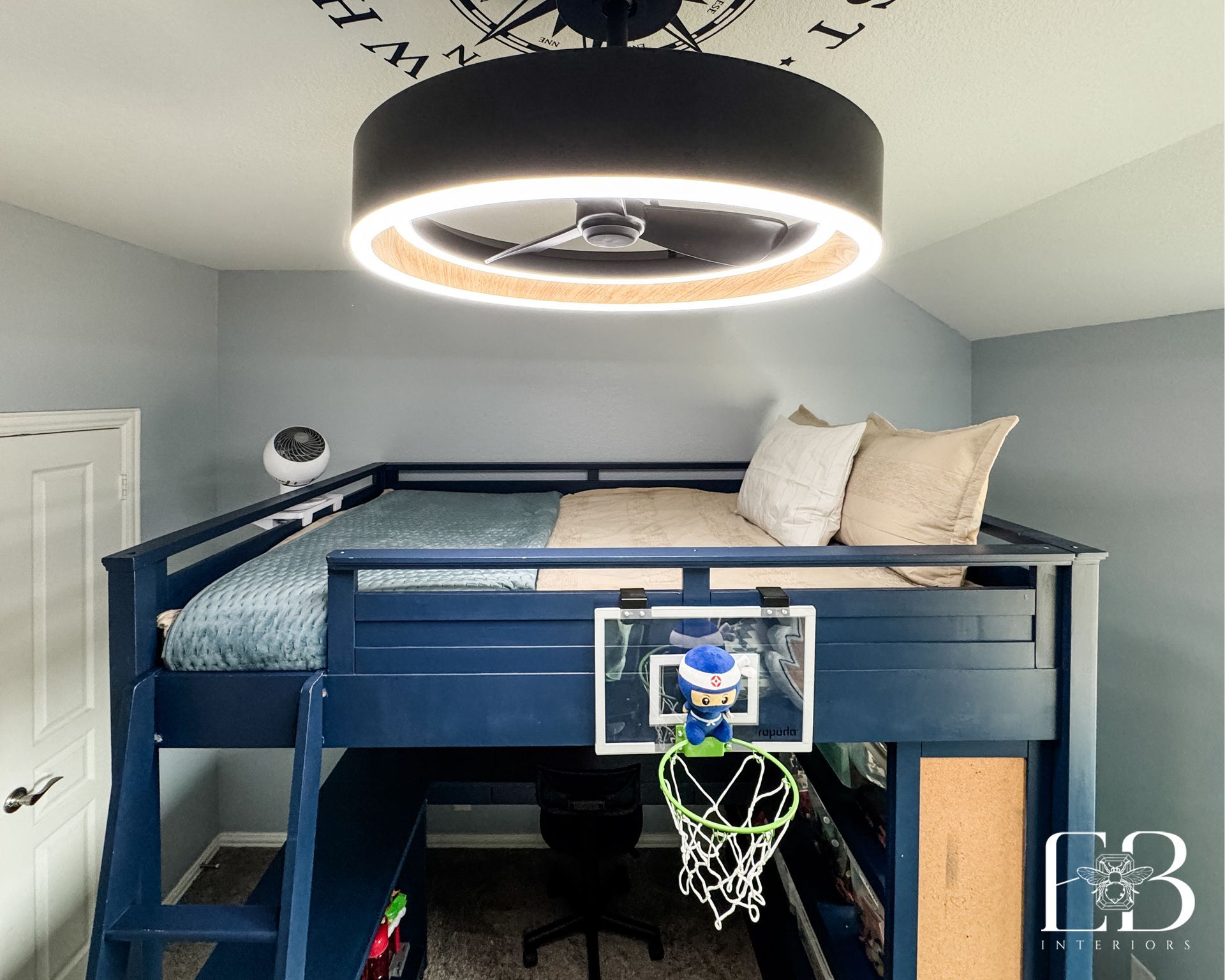 In the son’s room, multiple interests—Dude Perfect, storms, maps, and cruises—were woven together through color and texture rather than overt theming. A sleek “fandelier” anchors the ceiling, offering both style and comfort, while the loft bed’s built-in shelving was fitted with uniform fabric bins to replace plastic drawers. Wall-mounted book ledges and a hanging chair create distinct activity zones within the compact footprint, ensuring the room feels spacious and intentional. The cohesive navy, steel gray, and white palette grounds the layered themes, giving the space a clean, adaptable look that will easily evolve with him over time.