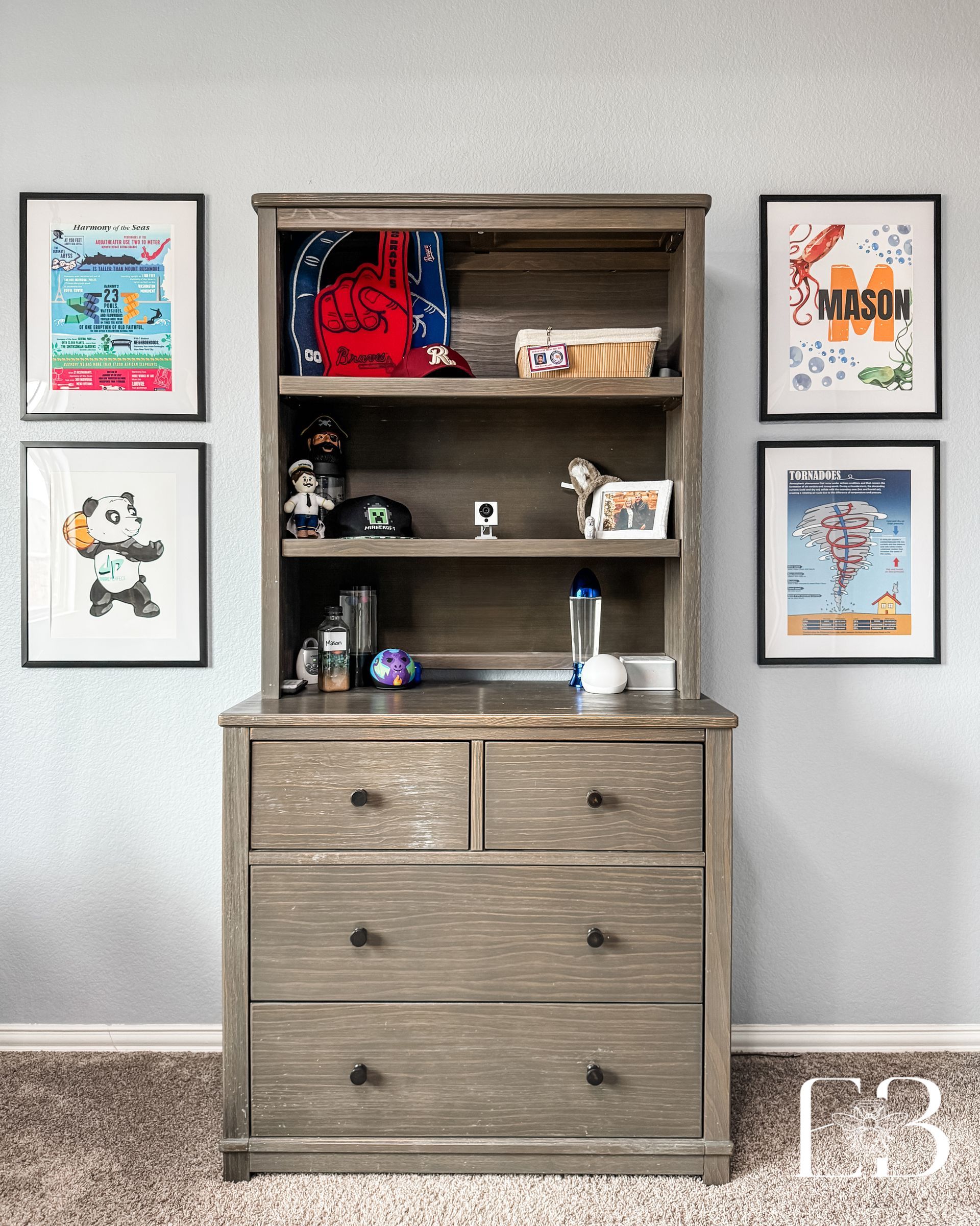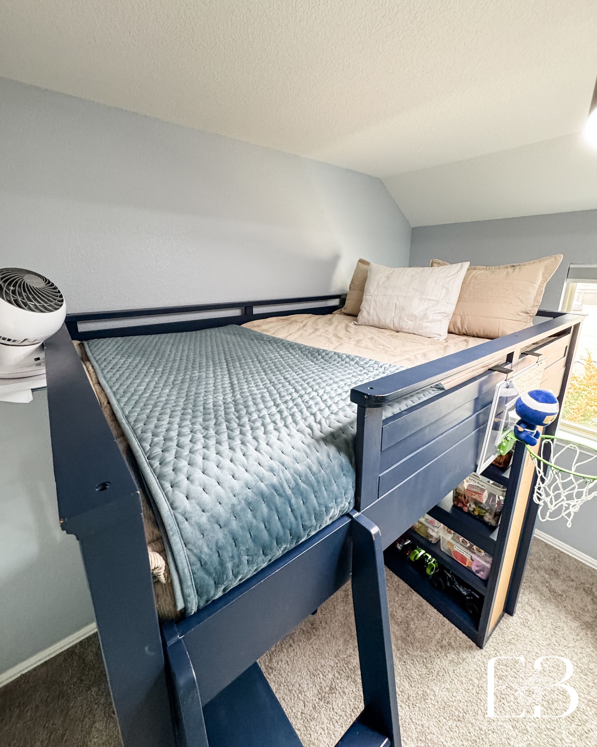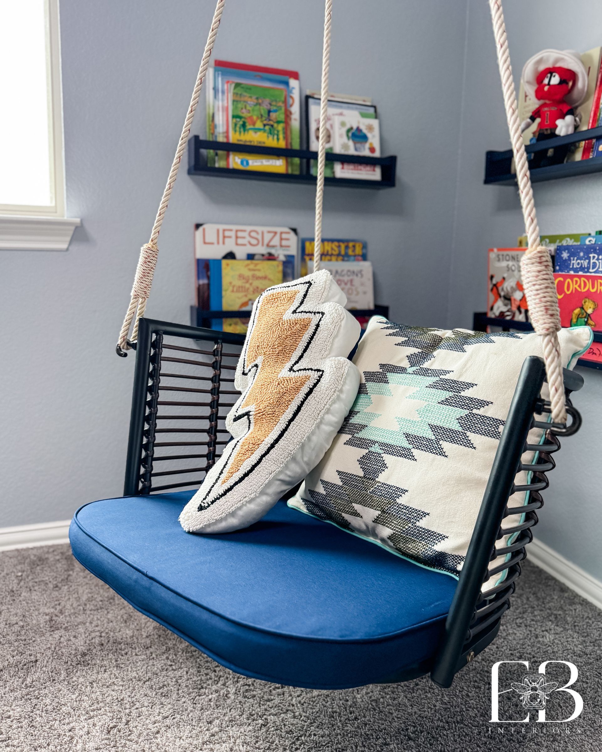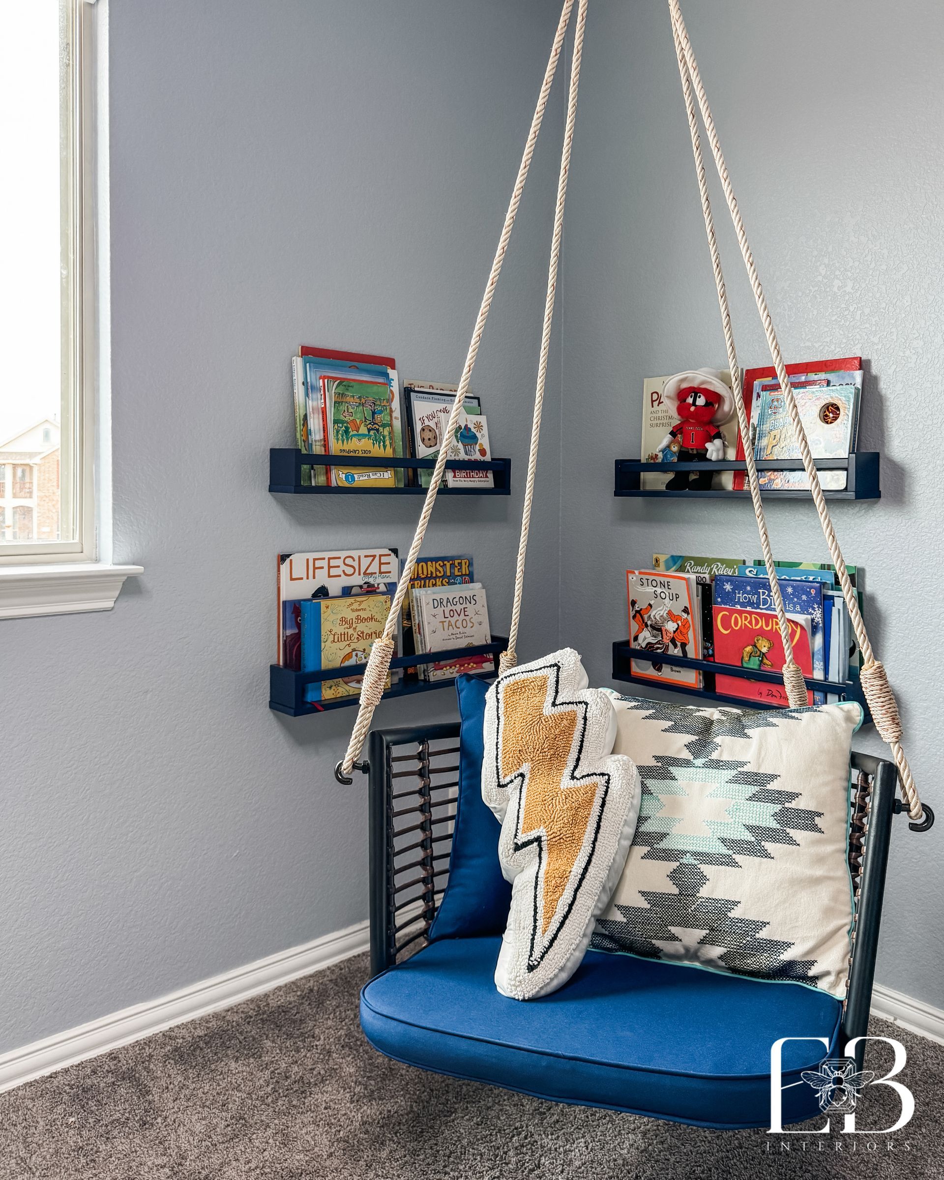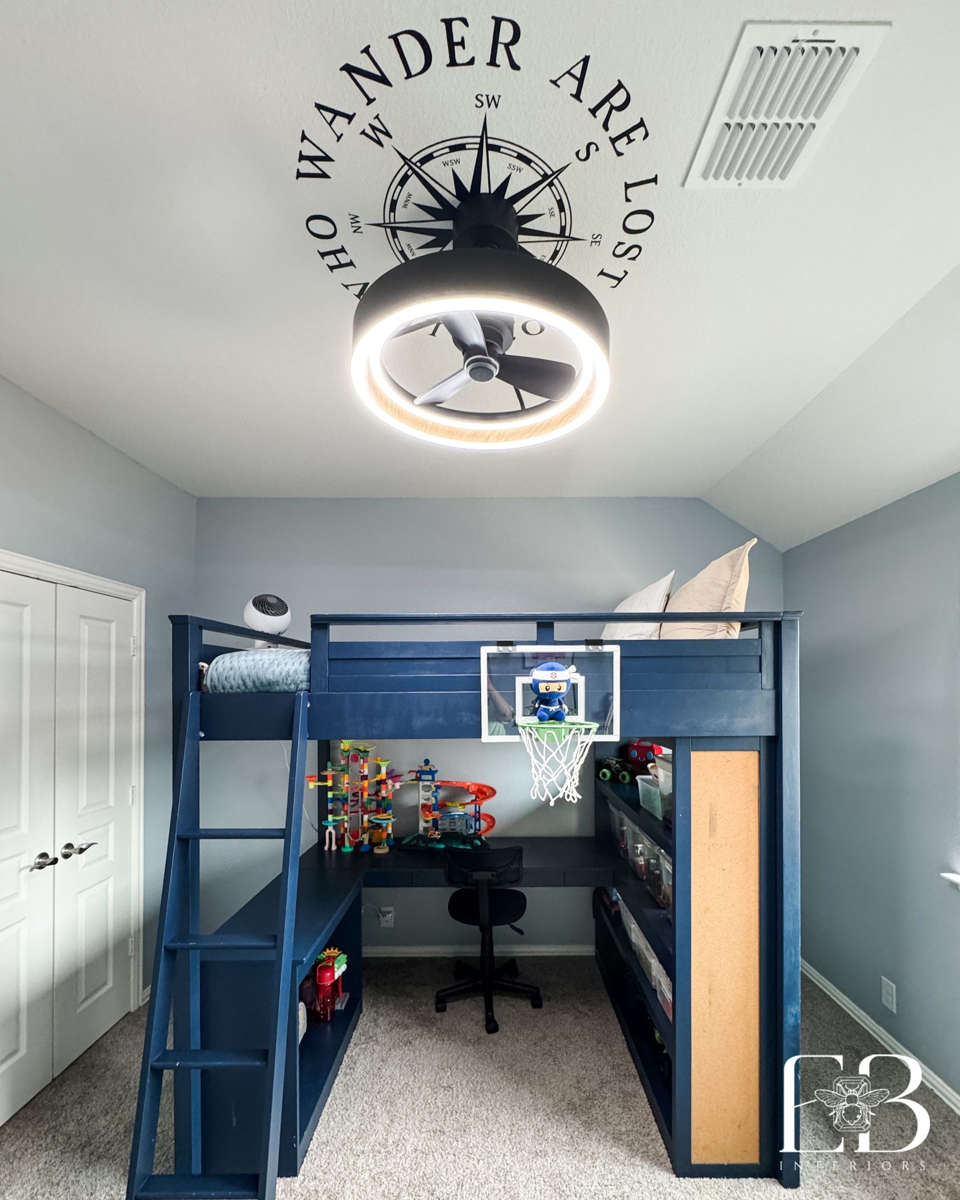 In the son’s room, multiple interests—Dude Perfect, storms, maps, and cruises—were woven together through color and texture rather than overt theming. A sleek “fandelier” anchors the ceiling, offering both style and comfort, while the loft bed’s built-in shelving was fitted with uniform fabric bins to replace plastic drawers. Wall-mounted book ledges and a hanging chair create distinct activity zones within the compact footprint, ensuring the room feels spacious and intentional. The cohesive navy, steel gray, and white palette grounds the layered themes, giving the space a clean, adaptable look that will easily evolve with him over time.