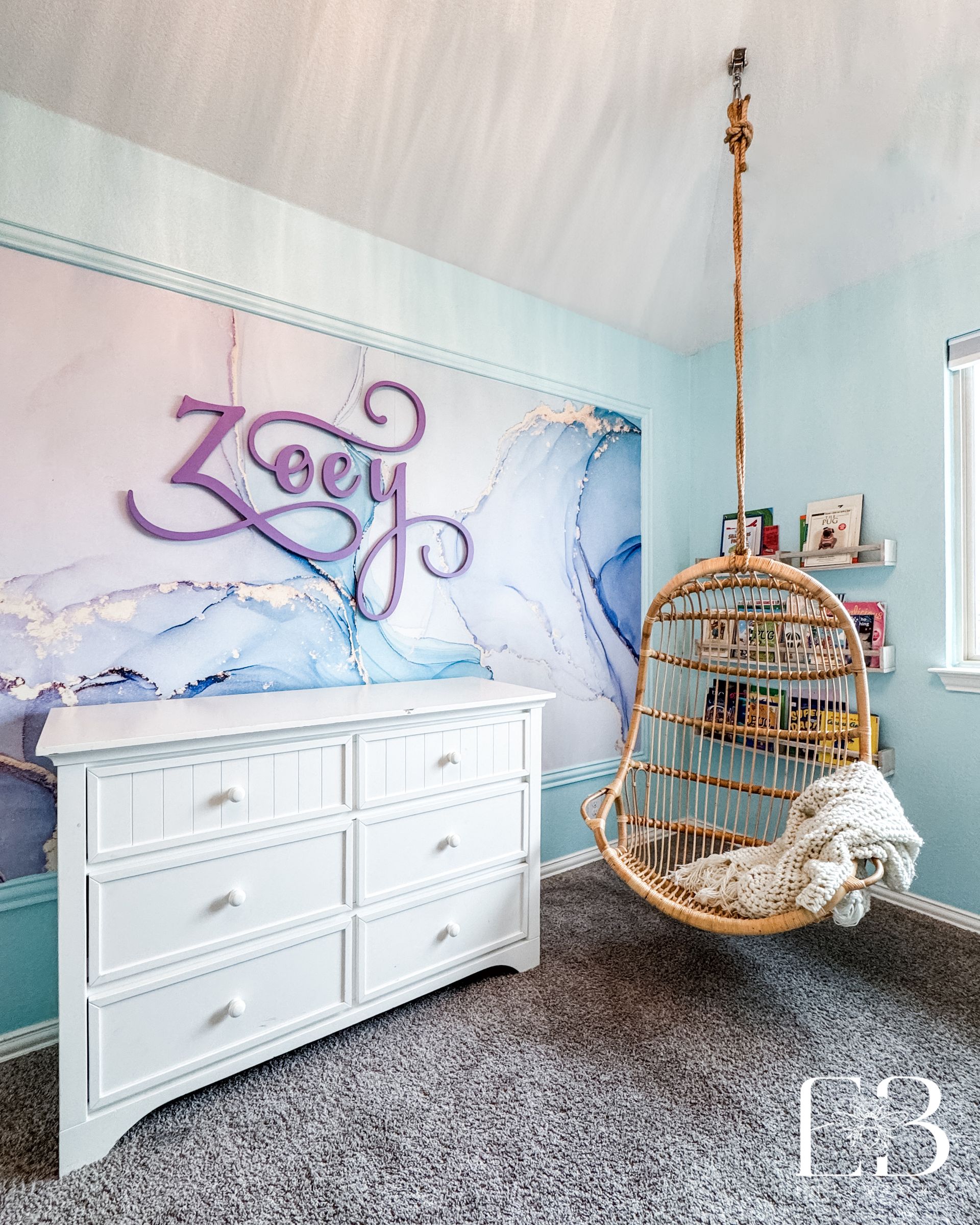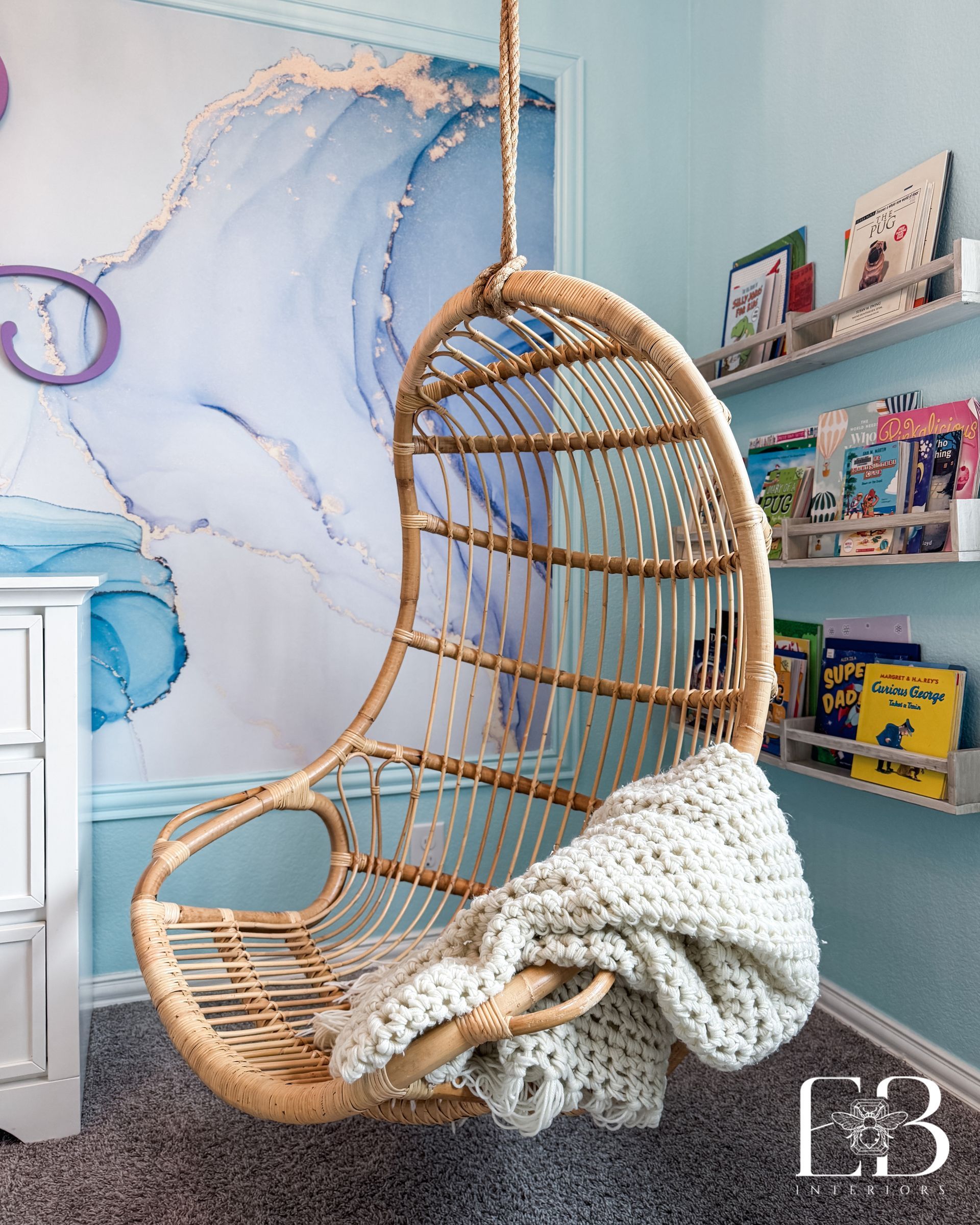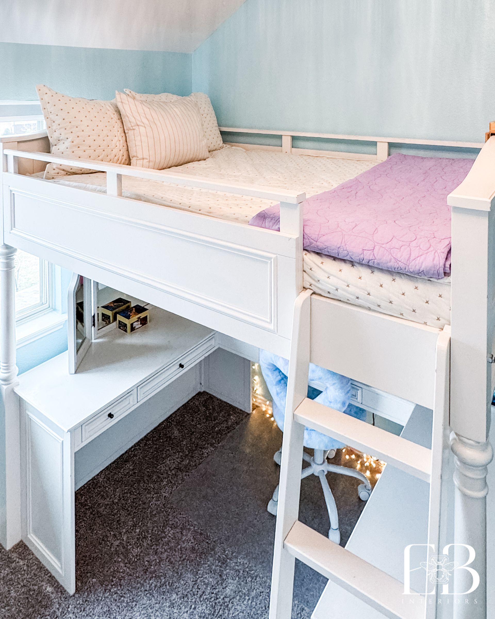 The client's daughter requested an aqua and light purple color palette with subtle heart-inspired details and plenty of room to grow. Because the existing loft bed was staying, we recommended replacing traditional curtains with custom blackout roller shades to maintain visual openness and simplify the layout. Updated lighting, new wall shelving, and a ceiling-mounted hammock added both functionality and fun, while a mobile under-desk caddy provided flexible storage for art supplies and schoolwork. Closed LEGO bins were relocated to the game room to keep the space tidy. The result is a bright, cheerful room that balances playfulness with polish—perfect for a growing girl, yet timeless enough to carry her into her teen years.