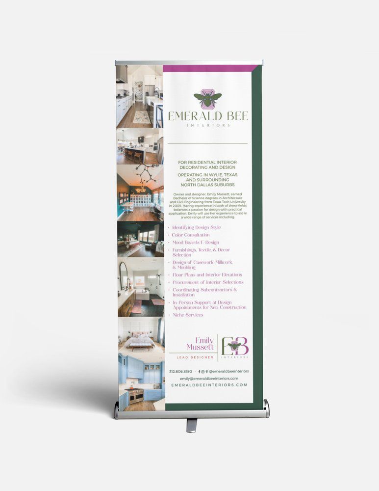 including advertisements, event materials, and trade show displays that reflect Emerald Bee’s refined yet approachable brand identity.