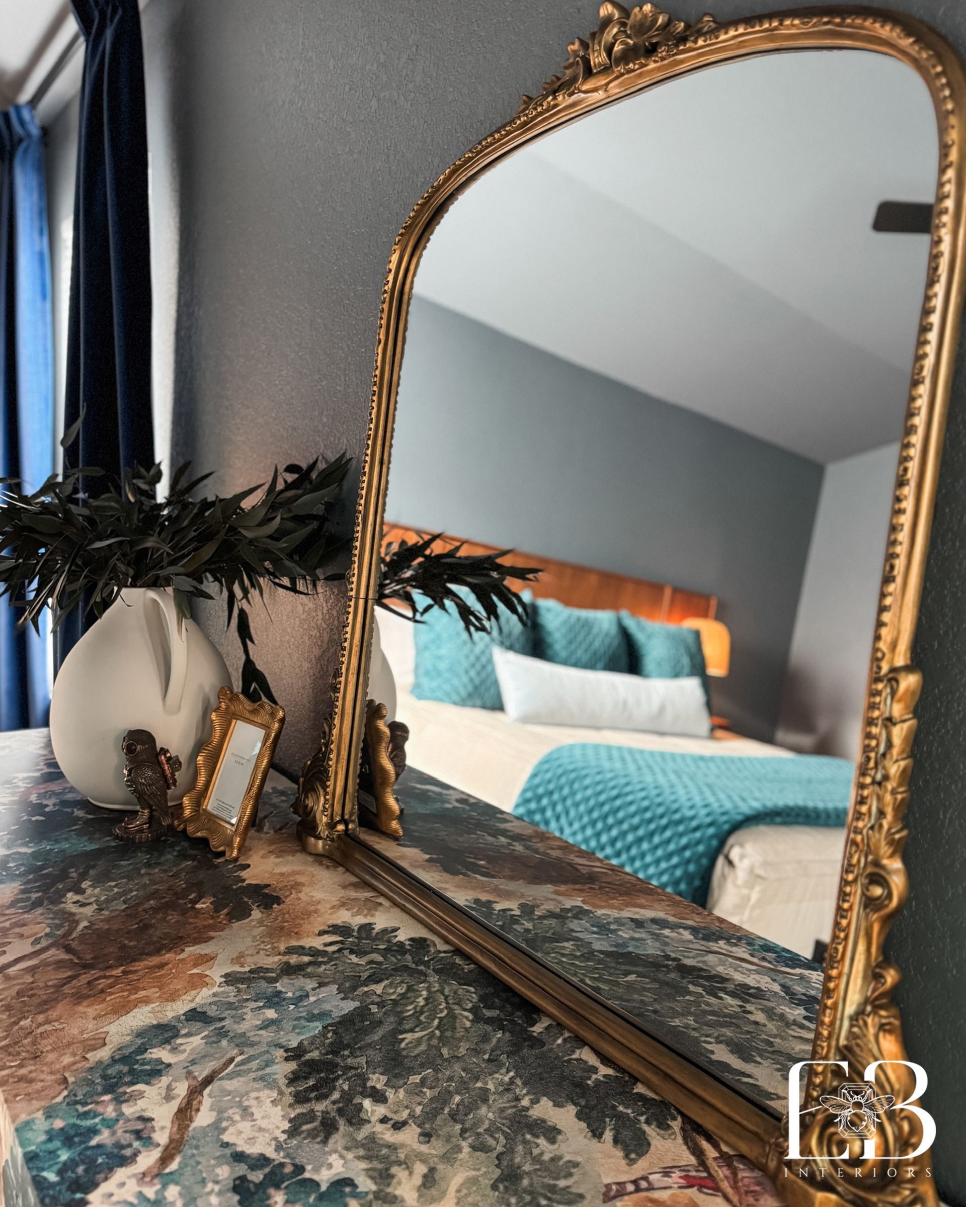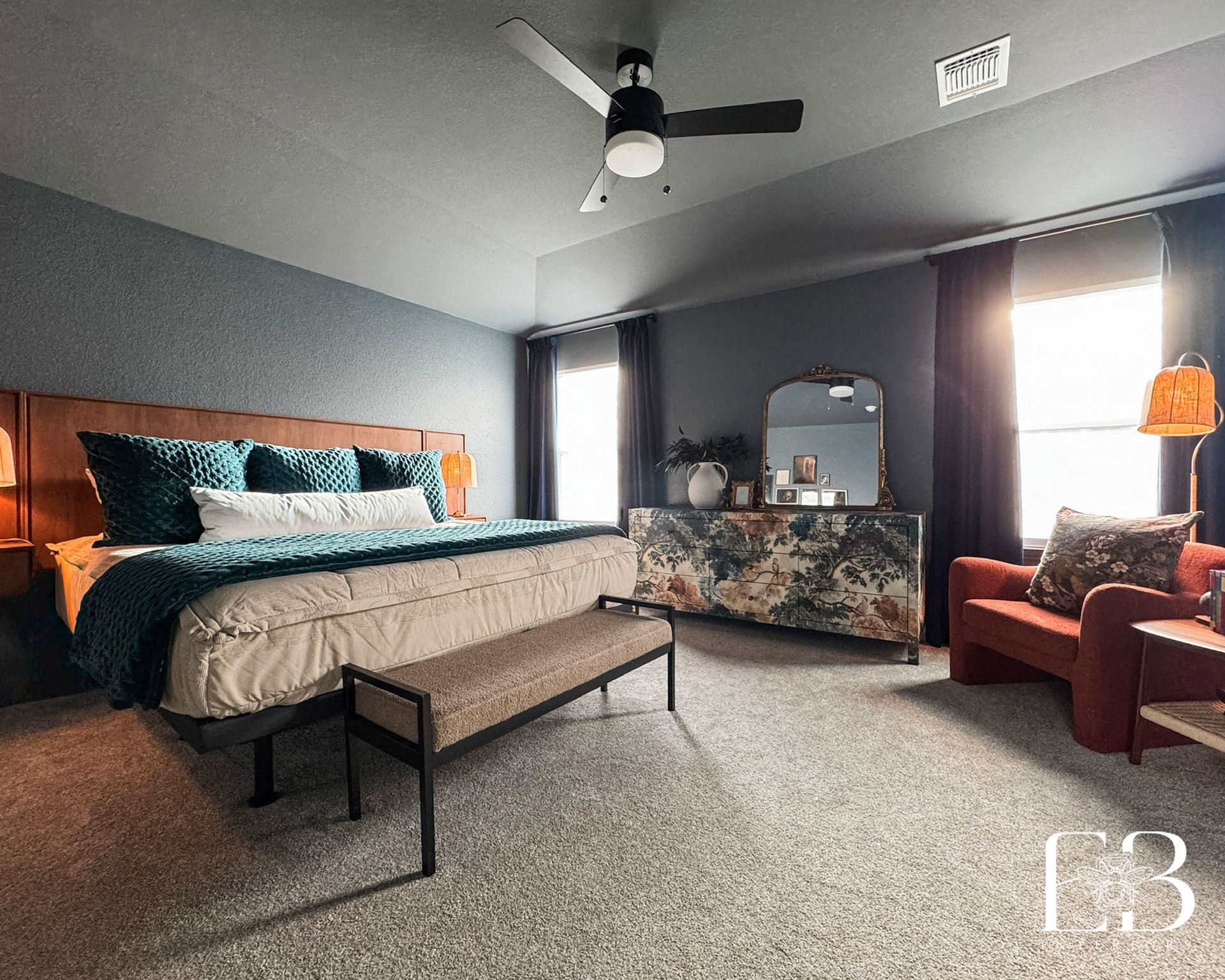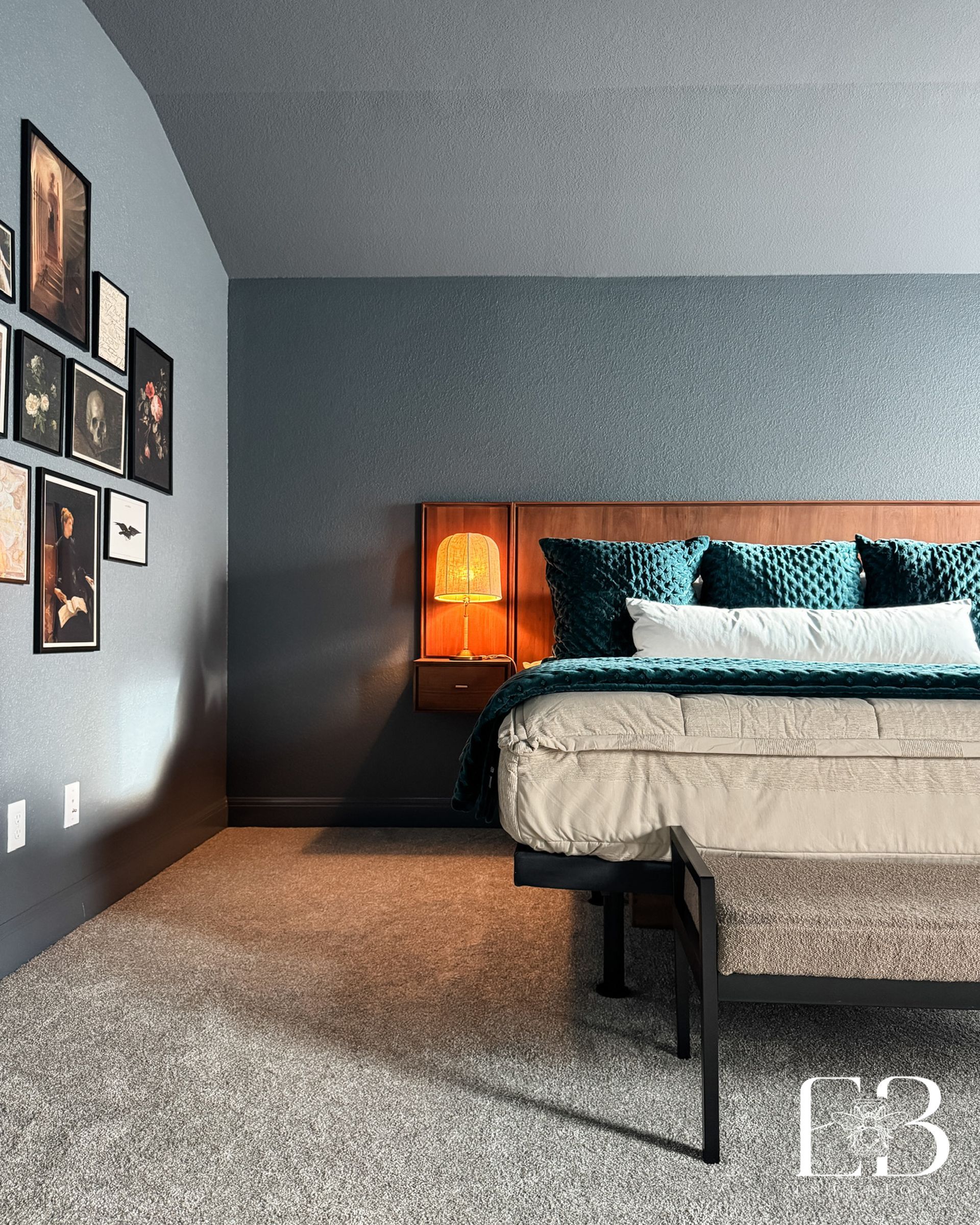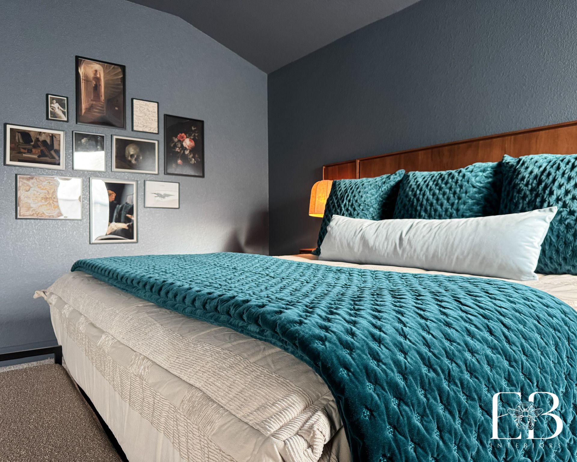 In the primary suite, blackout draperies and deep blue walls create an ideal environment for daytime rest, while a statement dresser, textural bedding, and curated gallery wall add depth and warmth. Throughout the home, jewel-toned palettes, botanical wallpapers, and natural wood tones blend whimsy with intellect—crafting a space that feels both personal and timeless.