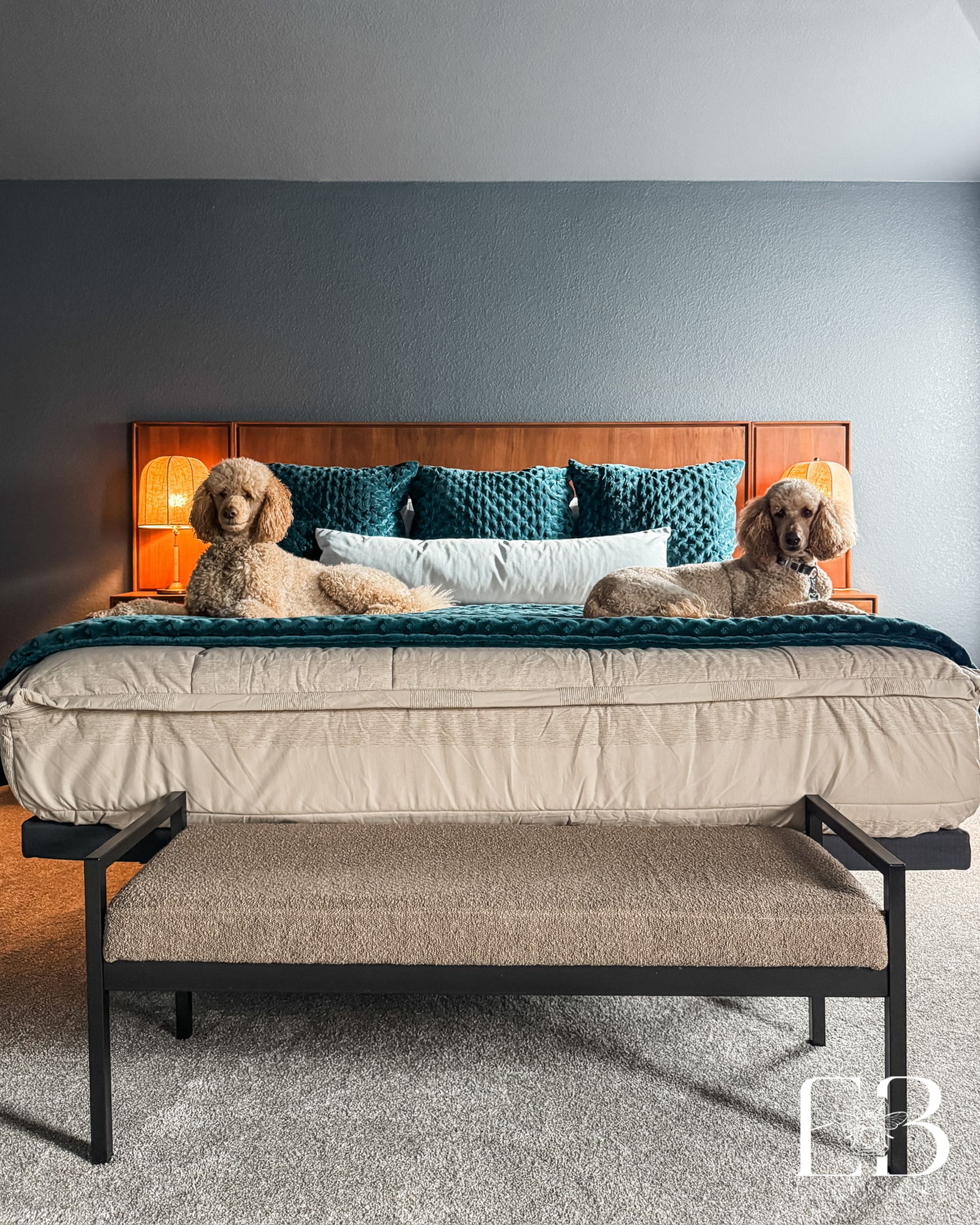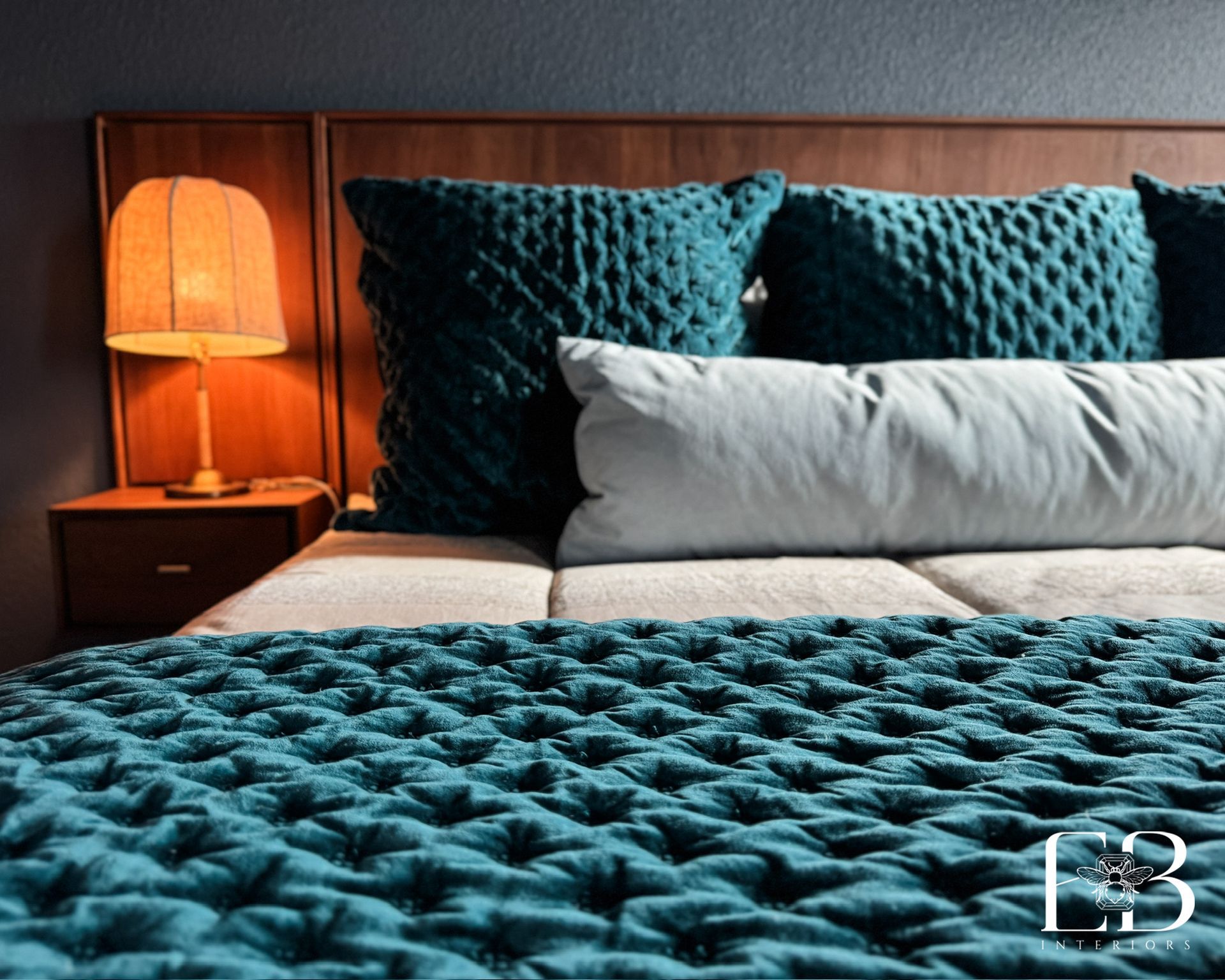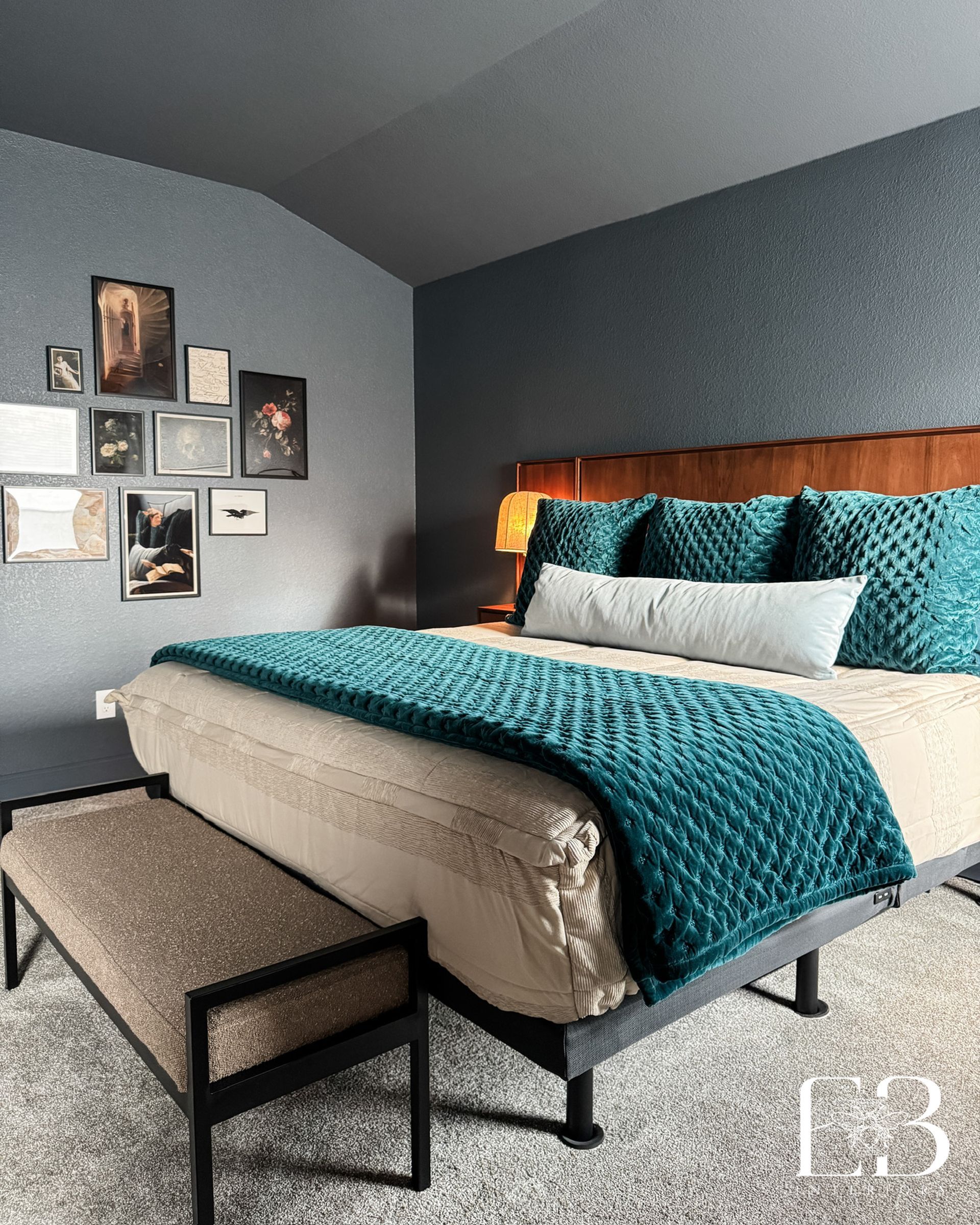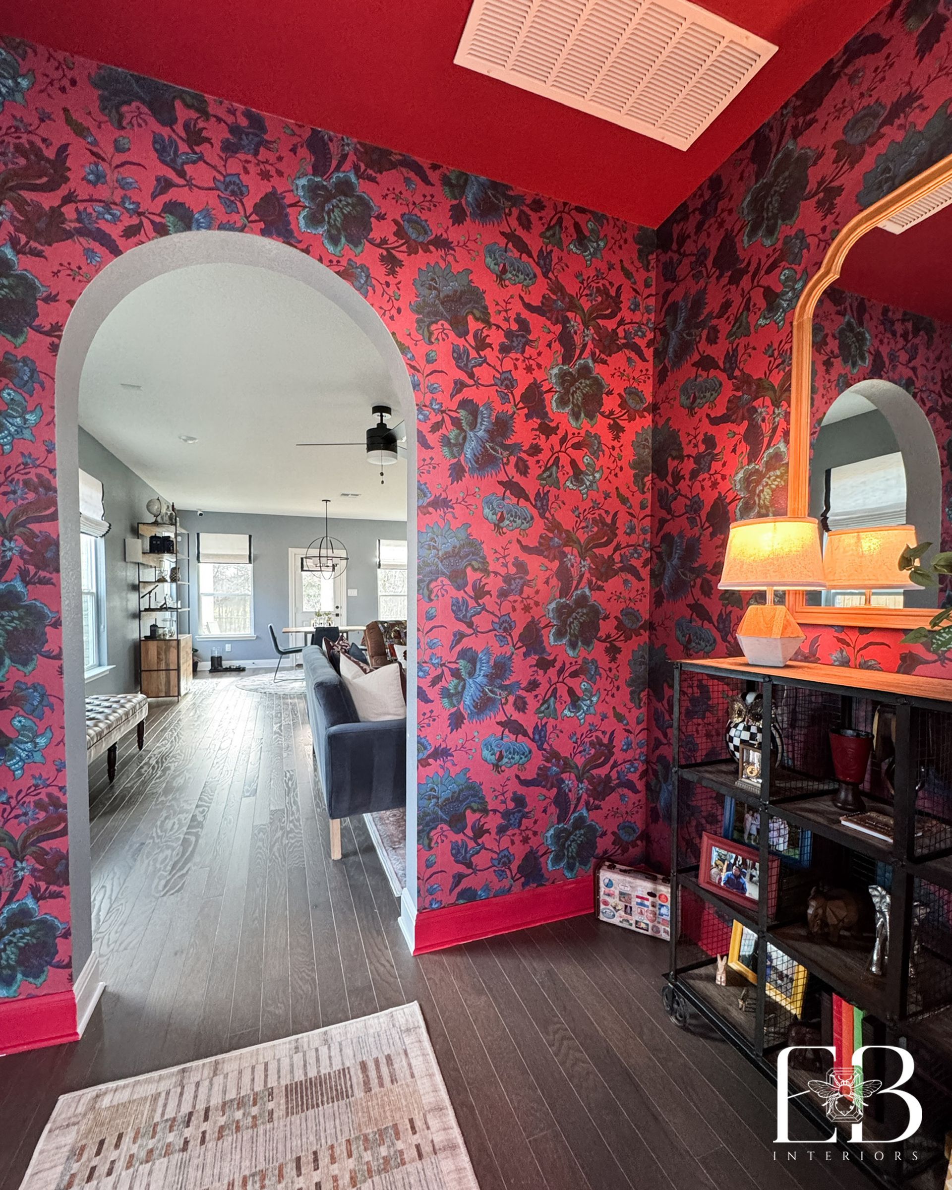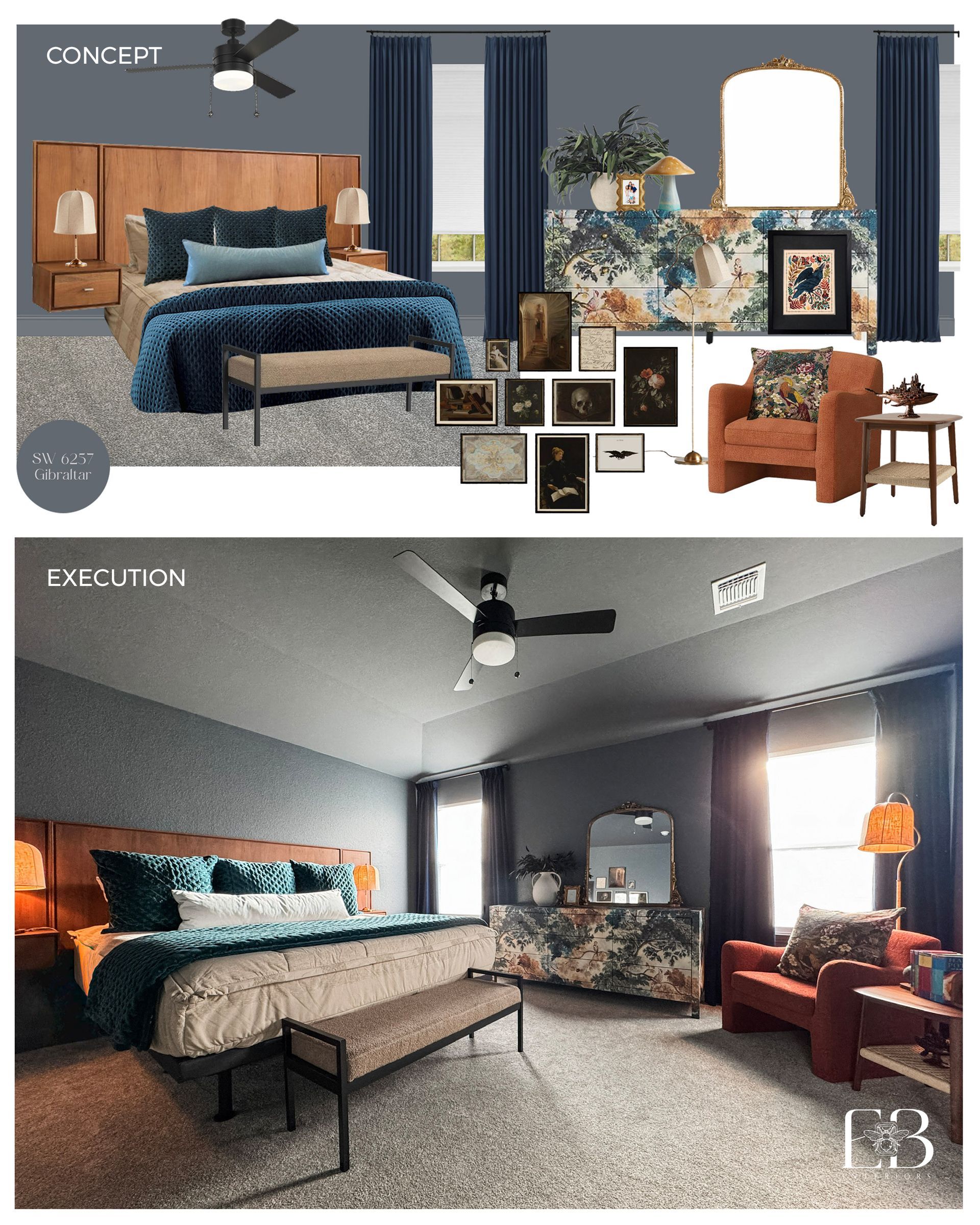 In the primary suite, blackout draperies and deep blue walls create an ideal environment for daytime rest, while a statement dresser, textural bedding, and curated gallery wall add depth and warmth. Throughout the home, jewel-toned palettes, botanical wallpapers, and natural wood tones blend whimsy with intellect—crafting a space that feels both personal and timeless.