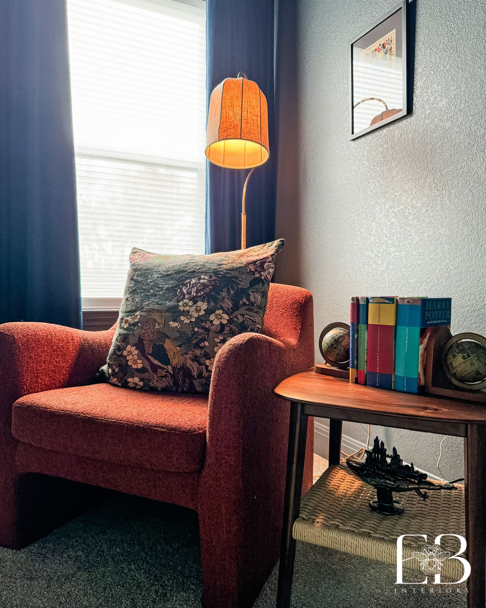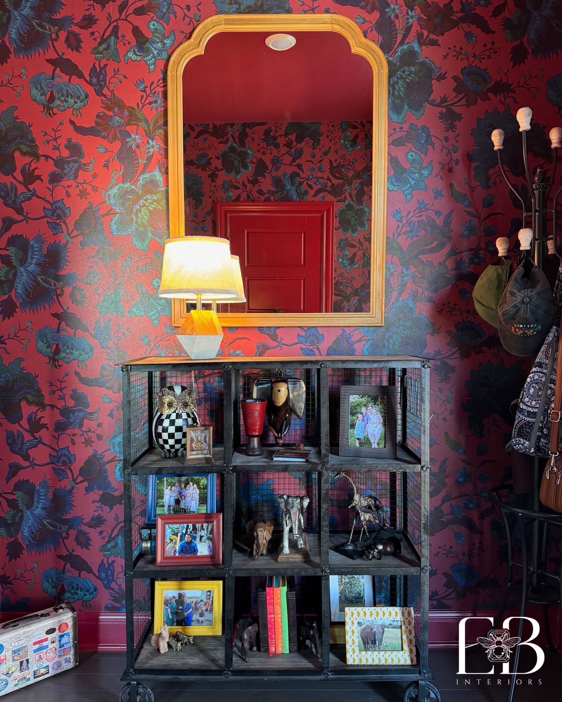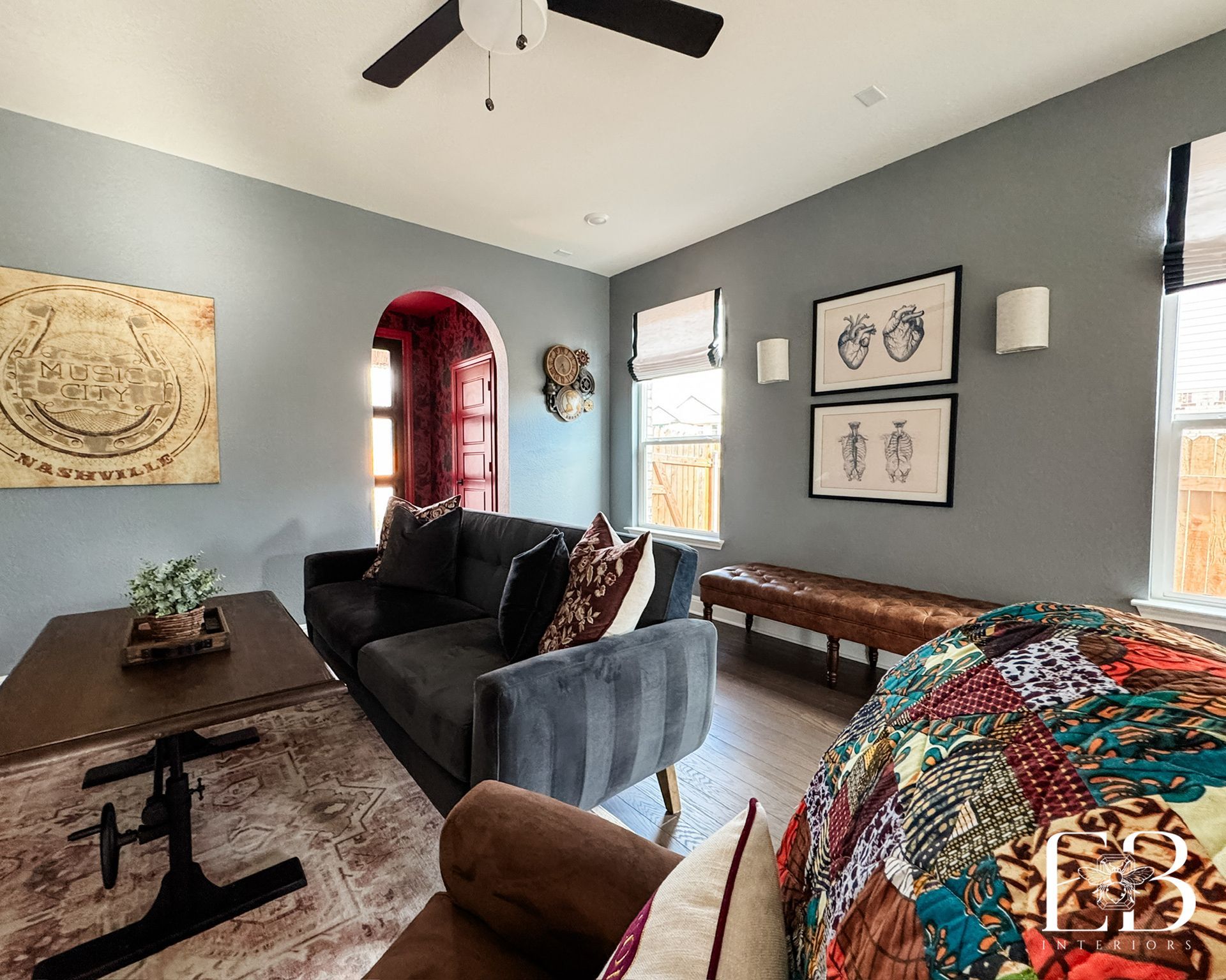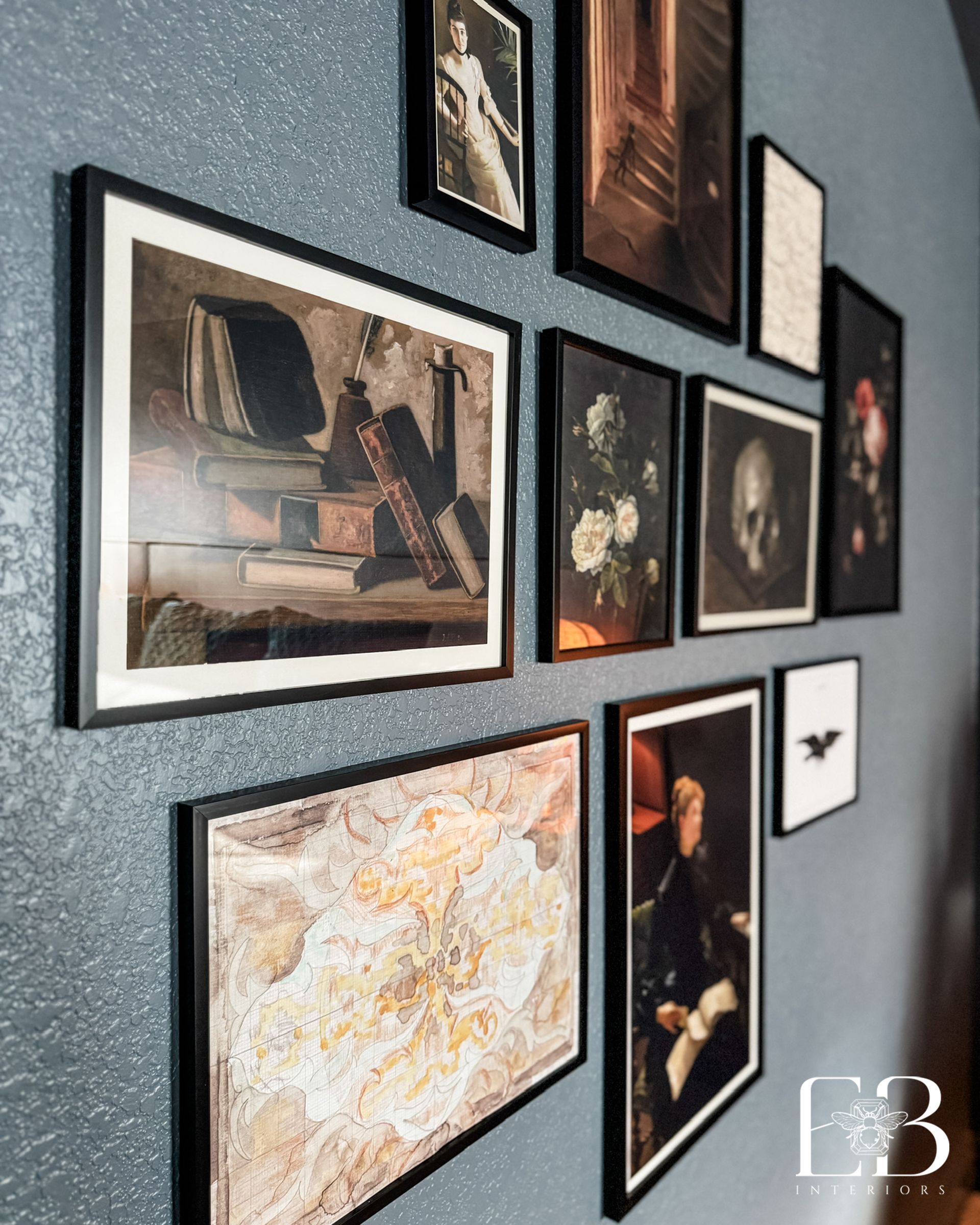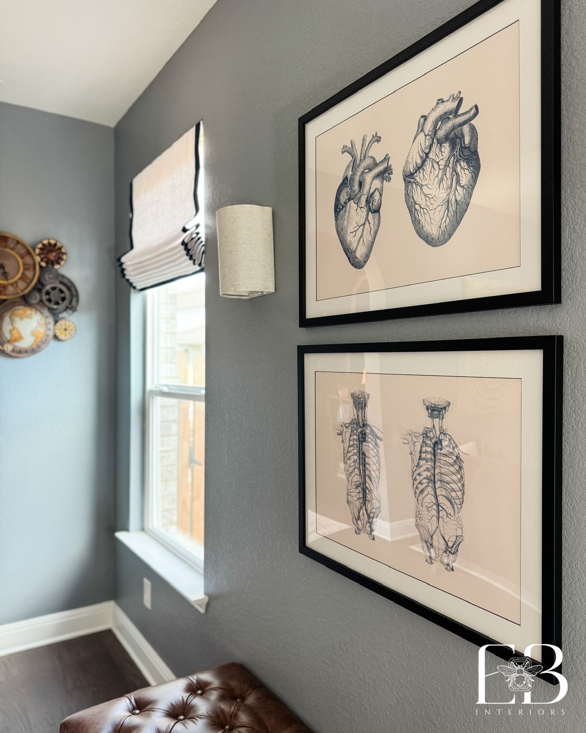 The client, a self-proclaimed “nerd,” wanted her love of Star Wars, Doctor Who, and Lord of the Rings to shine through with a refined dark academia aesthetic. Emerald Bee sourced anatomy art, layered rich textures, and incorporated moody colors to reflect her personality while maintaining a sophisticated, collected style. The design also celebrates her travels as a nurse on medical missions to Africa, displaying curated artifacts from her journeys.