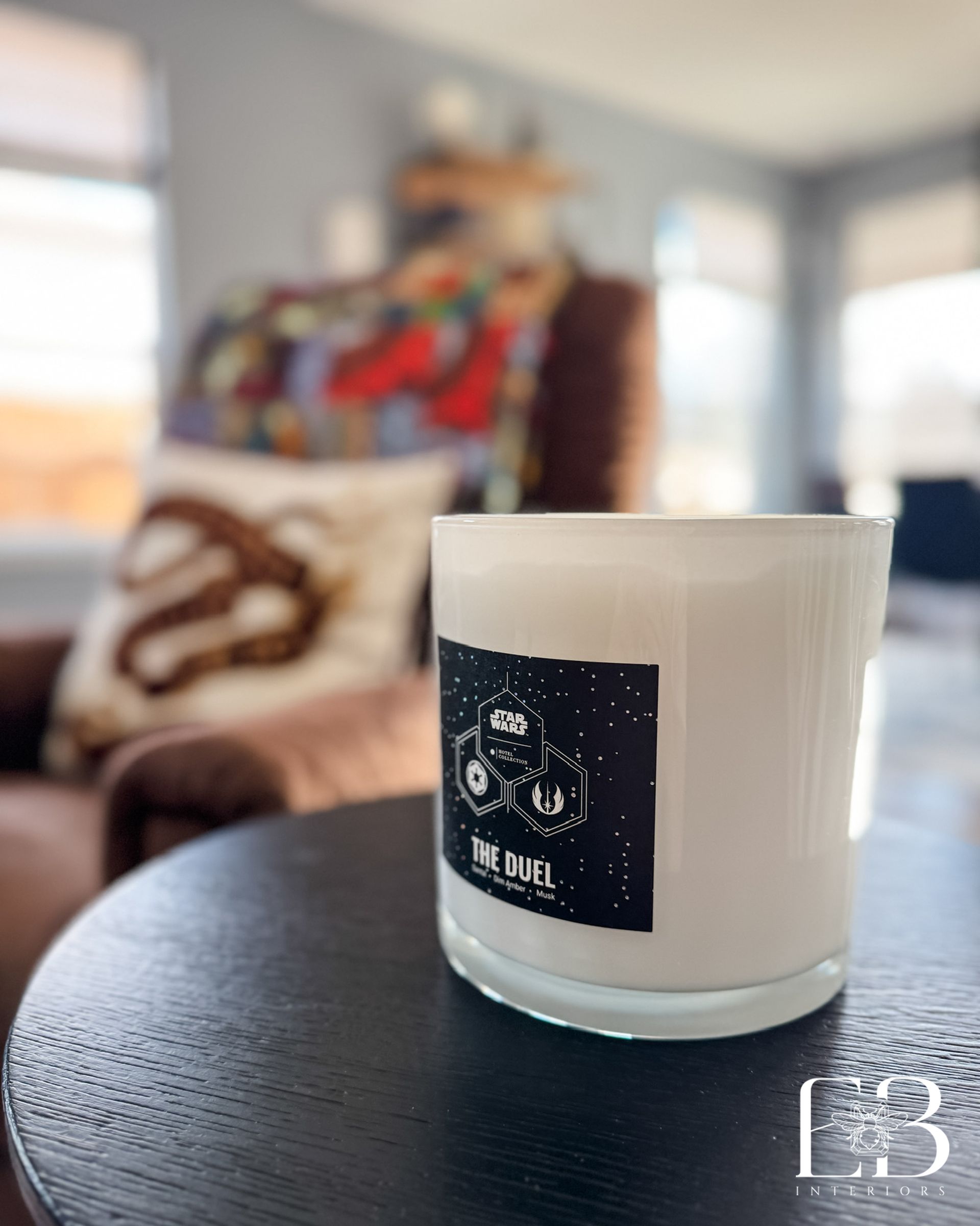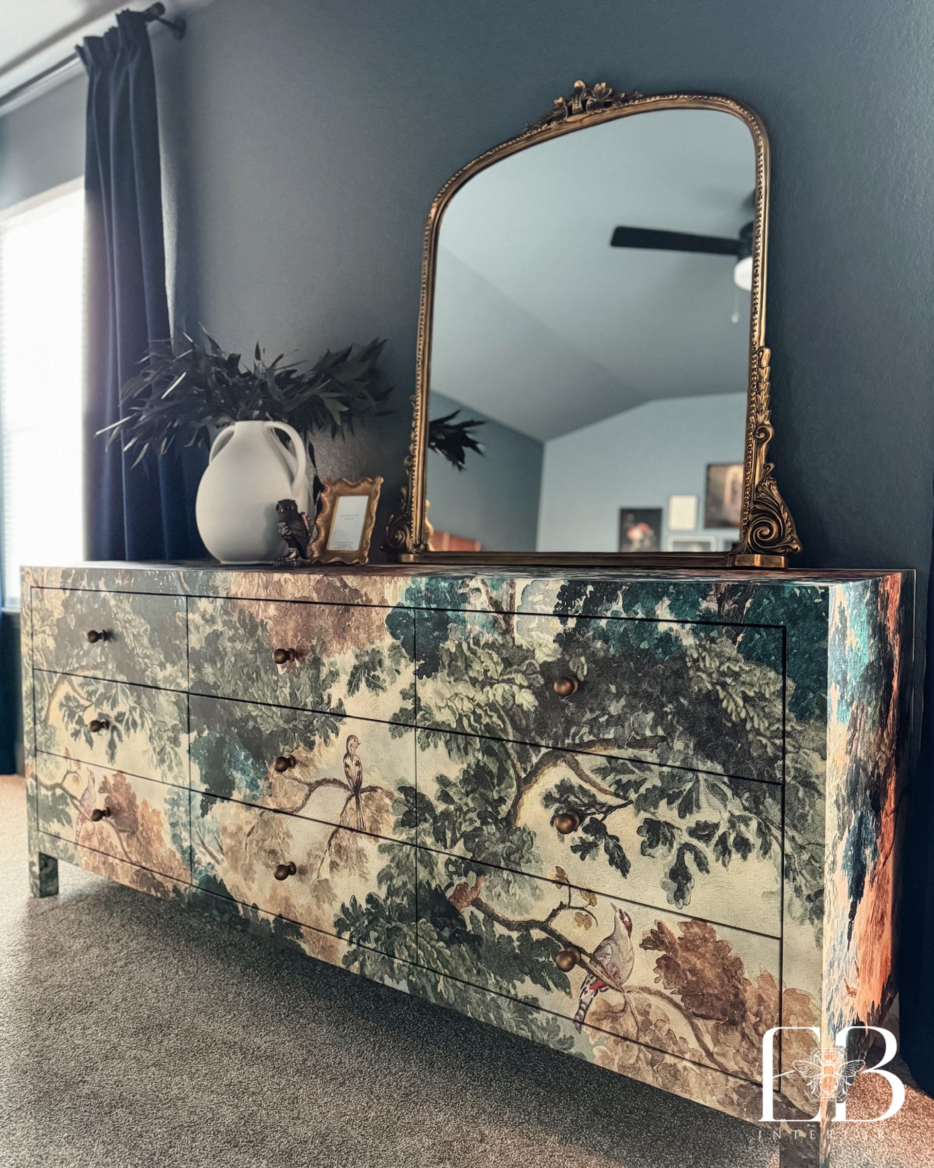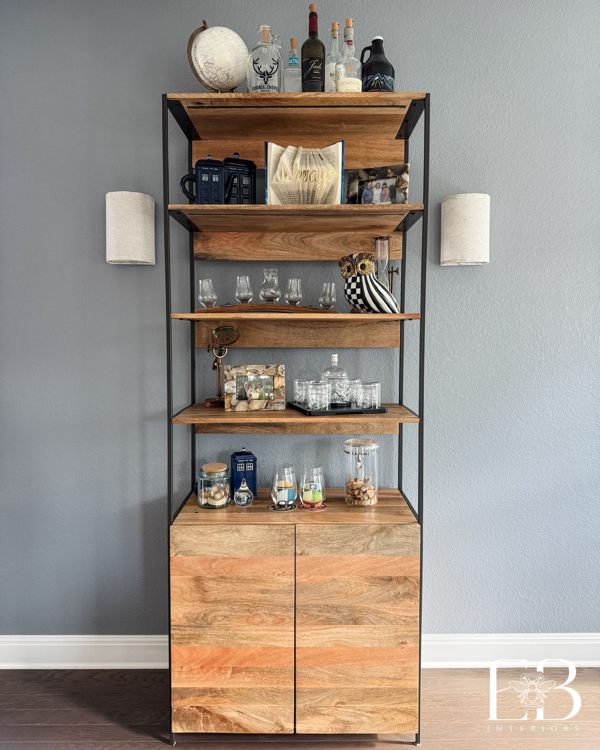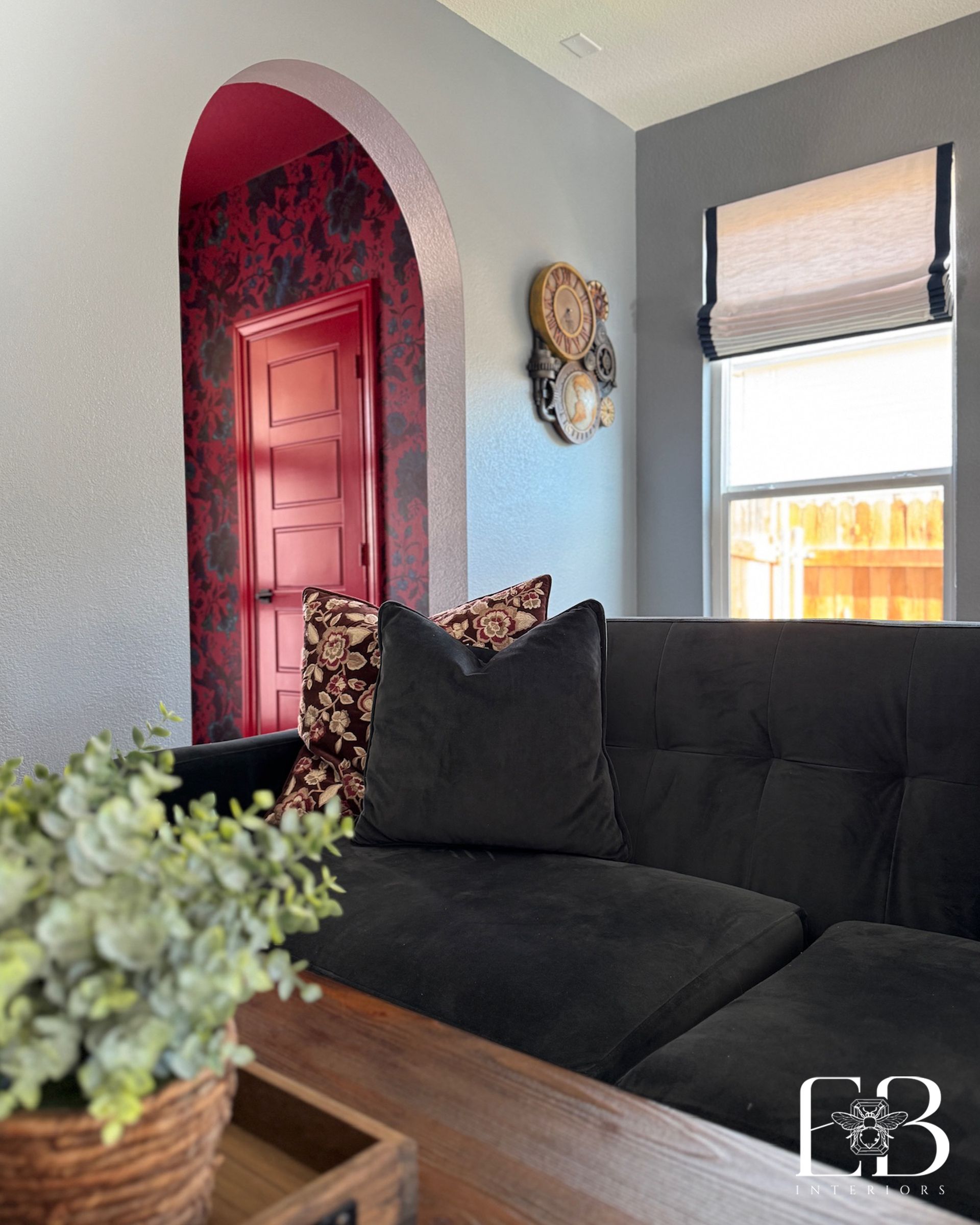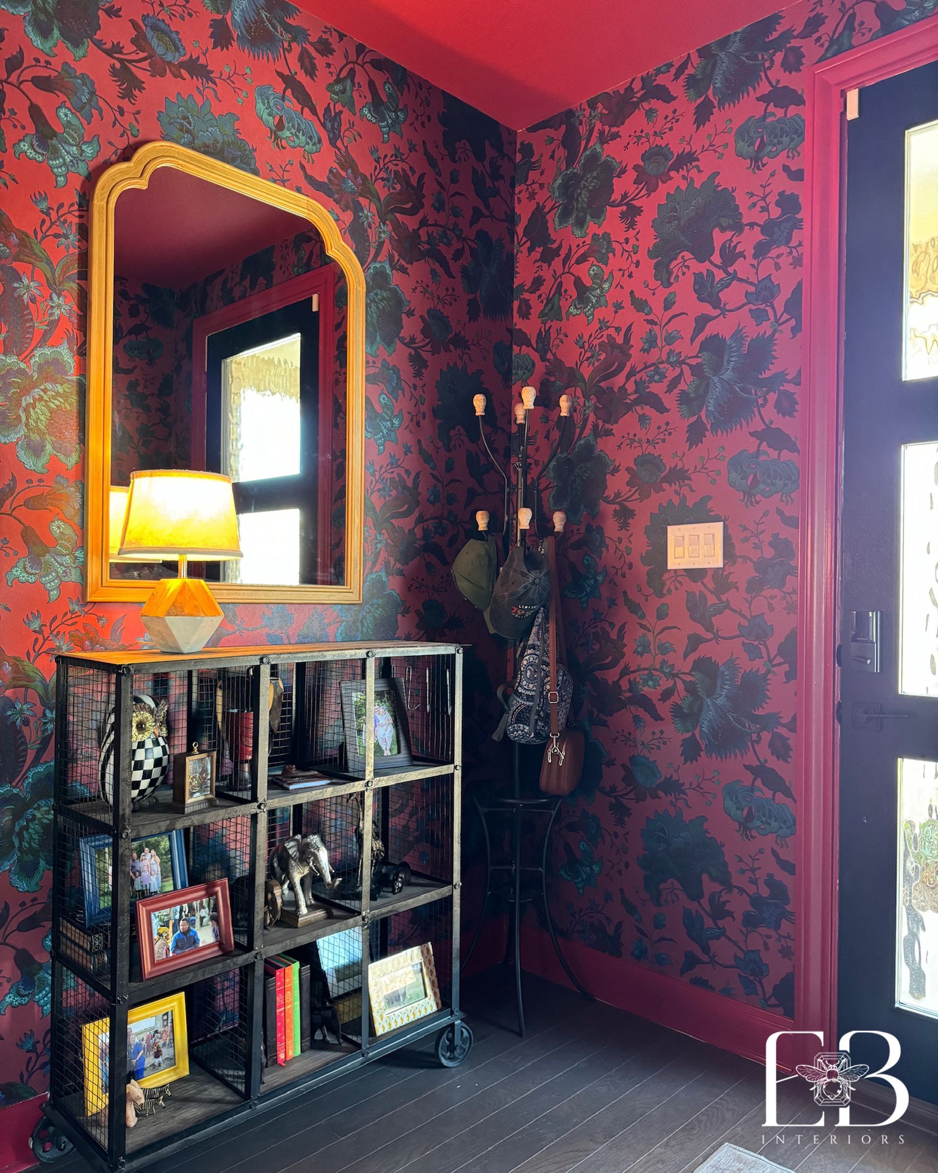 The client, a self-proclaimed “nerd,” wanted her love of Star Wars, Doctor Who, and Lord of the Rings to shine through with a refined dark academia aesthetic. Emerald Bee sourced anatomy art, layered rich textures, and incorporated moody colors to reflect her personality while maintaining a sophisticated, collected style. The design also celebrates her travels as a nurse on medical missions to Africa, displaying curated artifacts from her journeys.