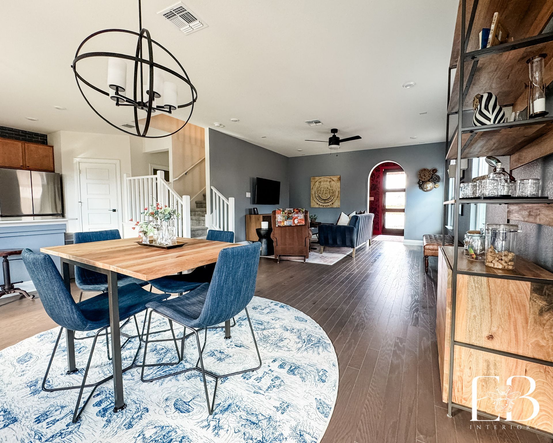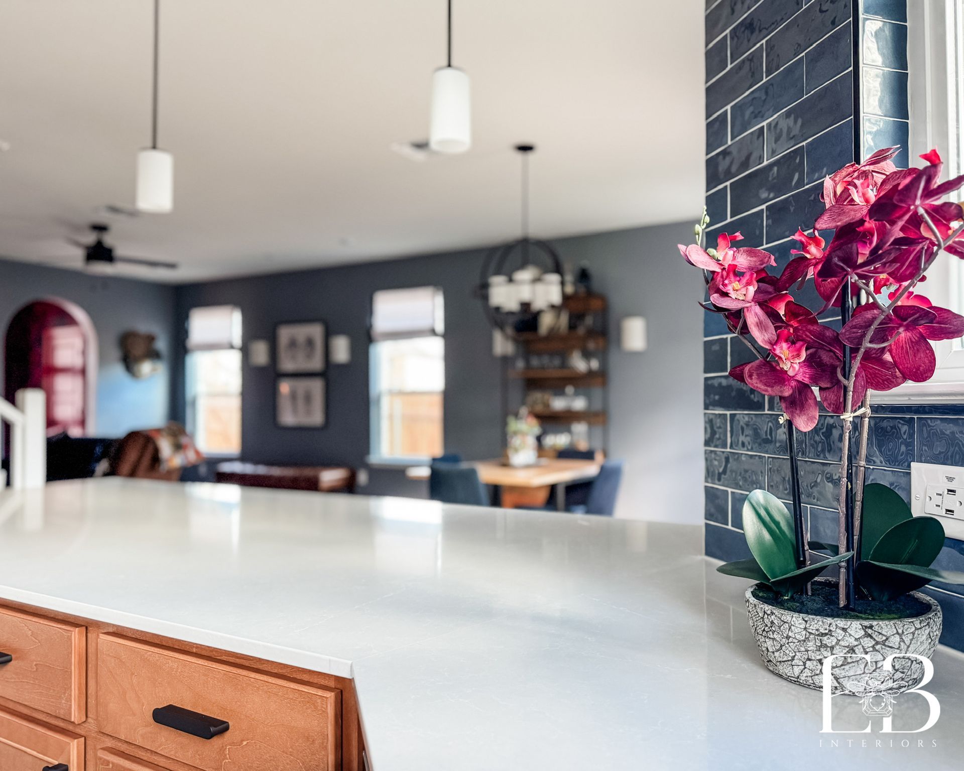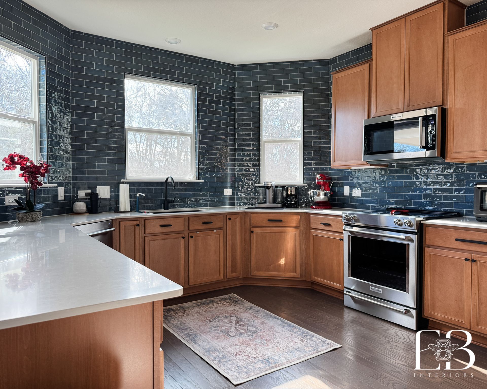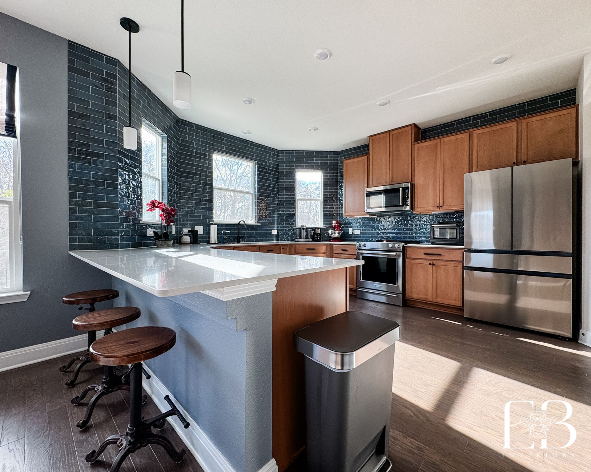 Emerald Bee Interiors guided this client through the process of personalizing a new construction production build with K.B. Homes—from selecting the ideal floor plan and design options to attending the design center appointment to finalize all interior and exterior finishes. Custom concept boards and construction drawings were created to implement after-market upgrades, including full-height kitchen tile and custom paint applications that brought a dramatic, cohesive atmosphere to the home.