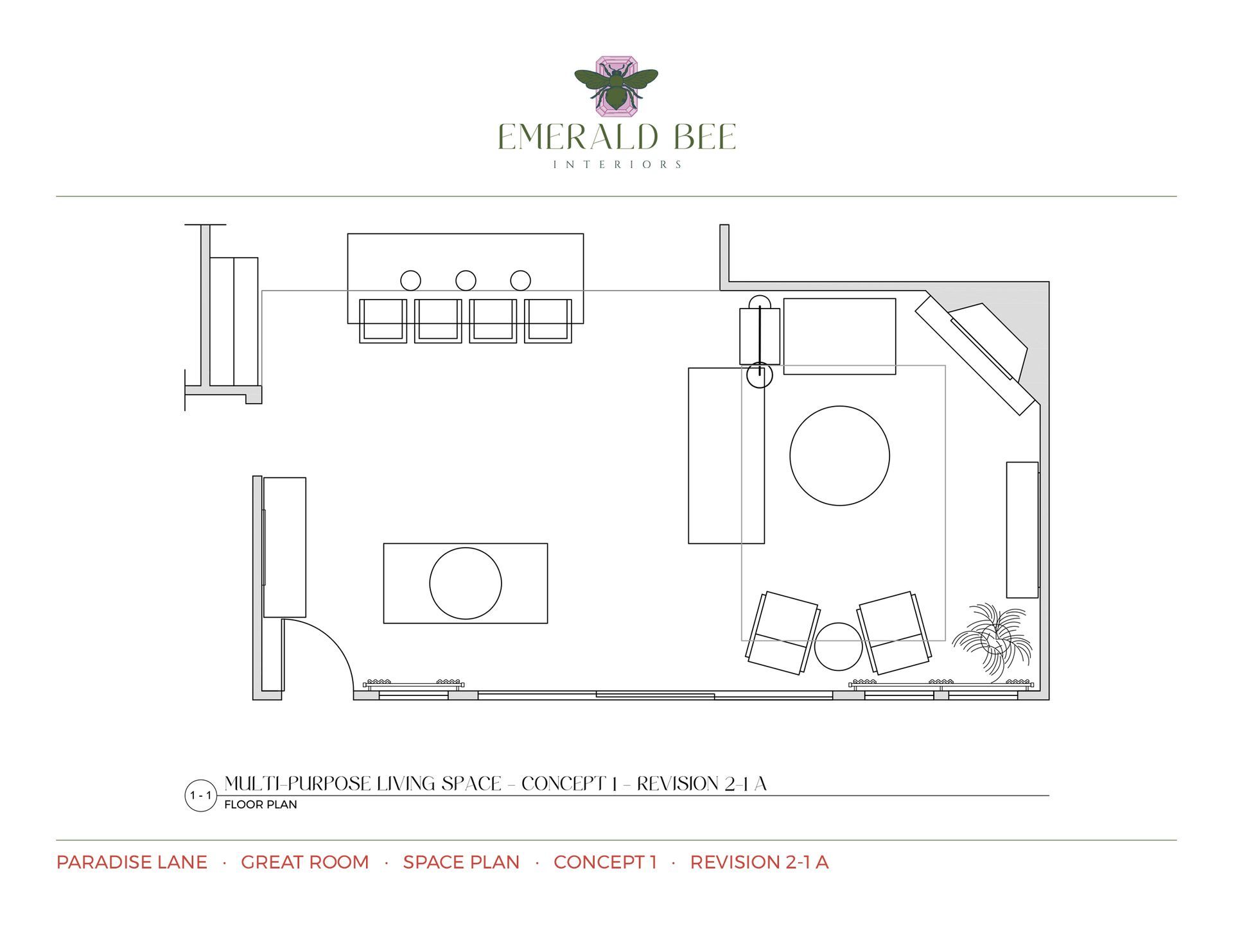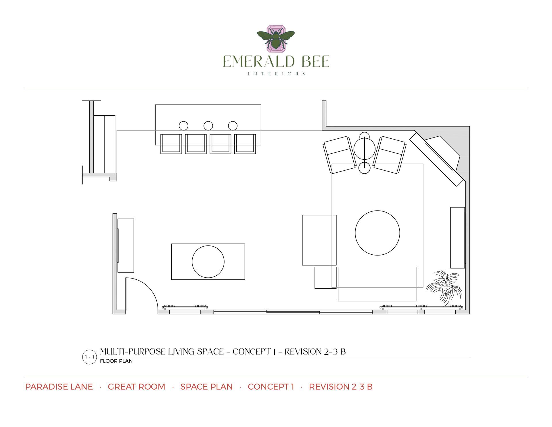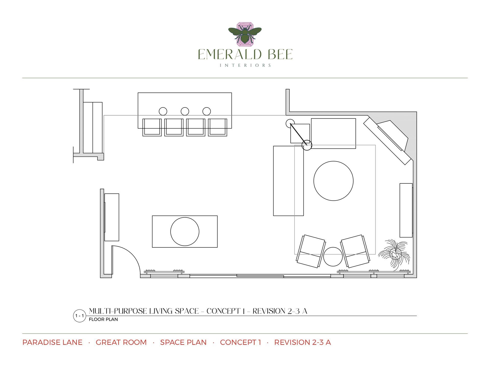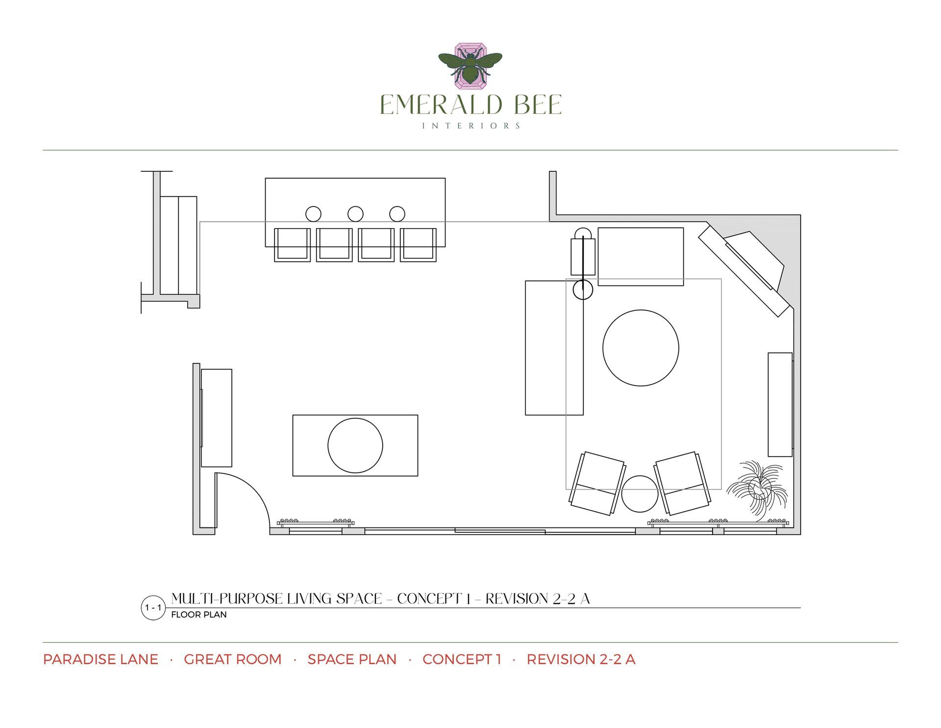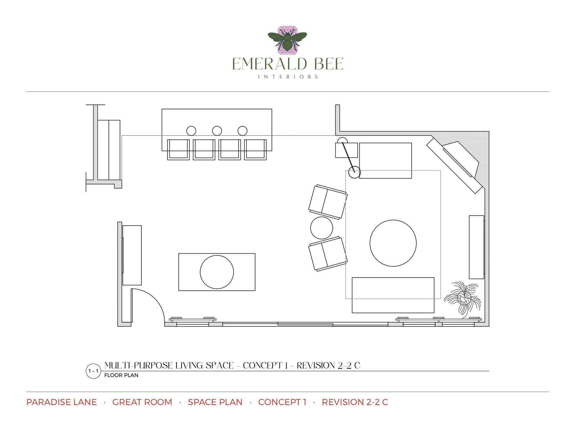 Because the client often gravitates toward smaller-scale furniture, special attention was given to proportion and visual balance to ensure each piece complemented the room’s architecture and maintained comfortable flow. Multiple revisions were created to incorporate client feedback, along with several alternate space plans exploring seating arrangements and traffic flow.