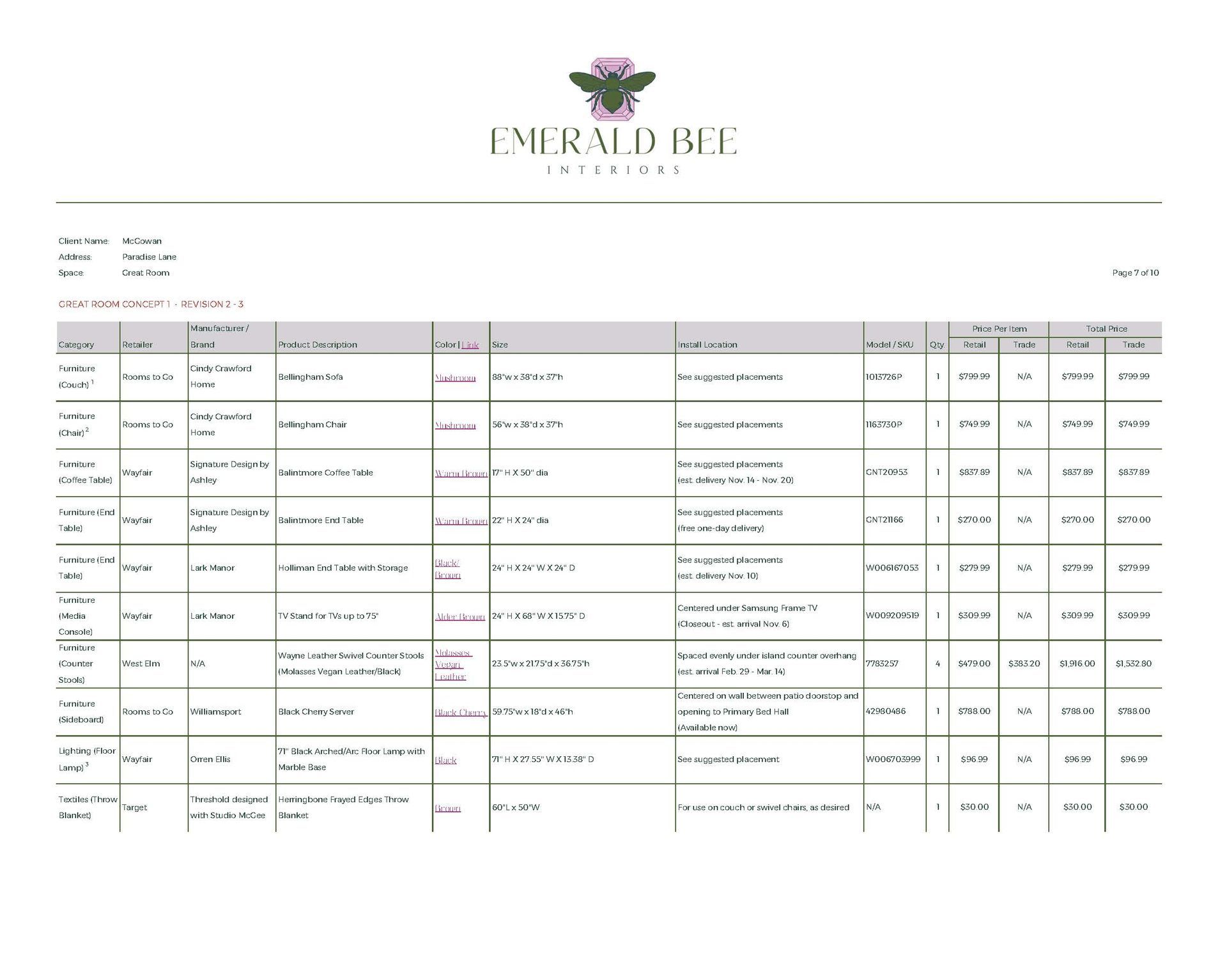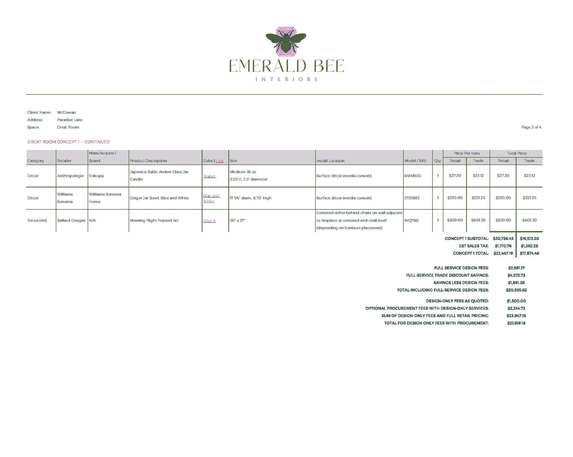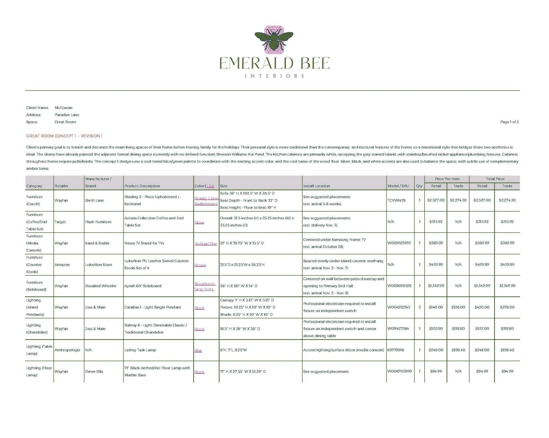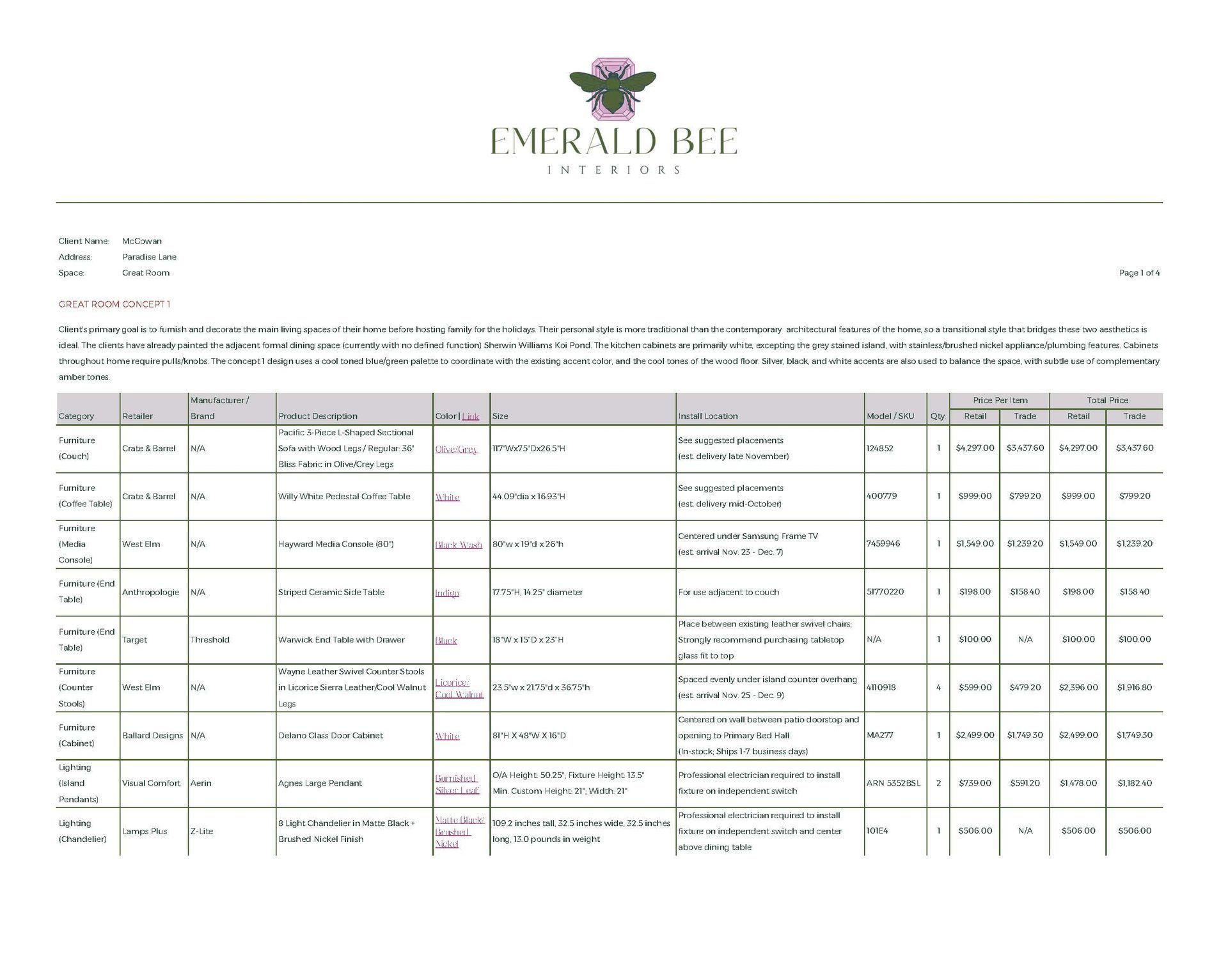 Concept Development, Furniture & Décor Sourcing, Space Planning (Multiple Options), Paint & Material Coordination, Procurement Assistance