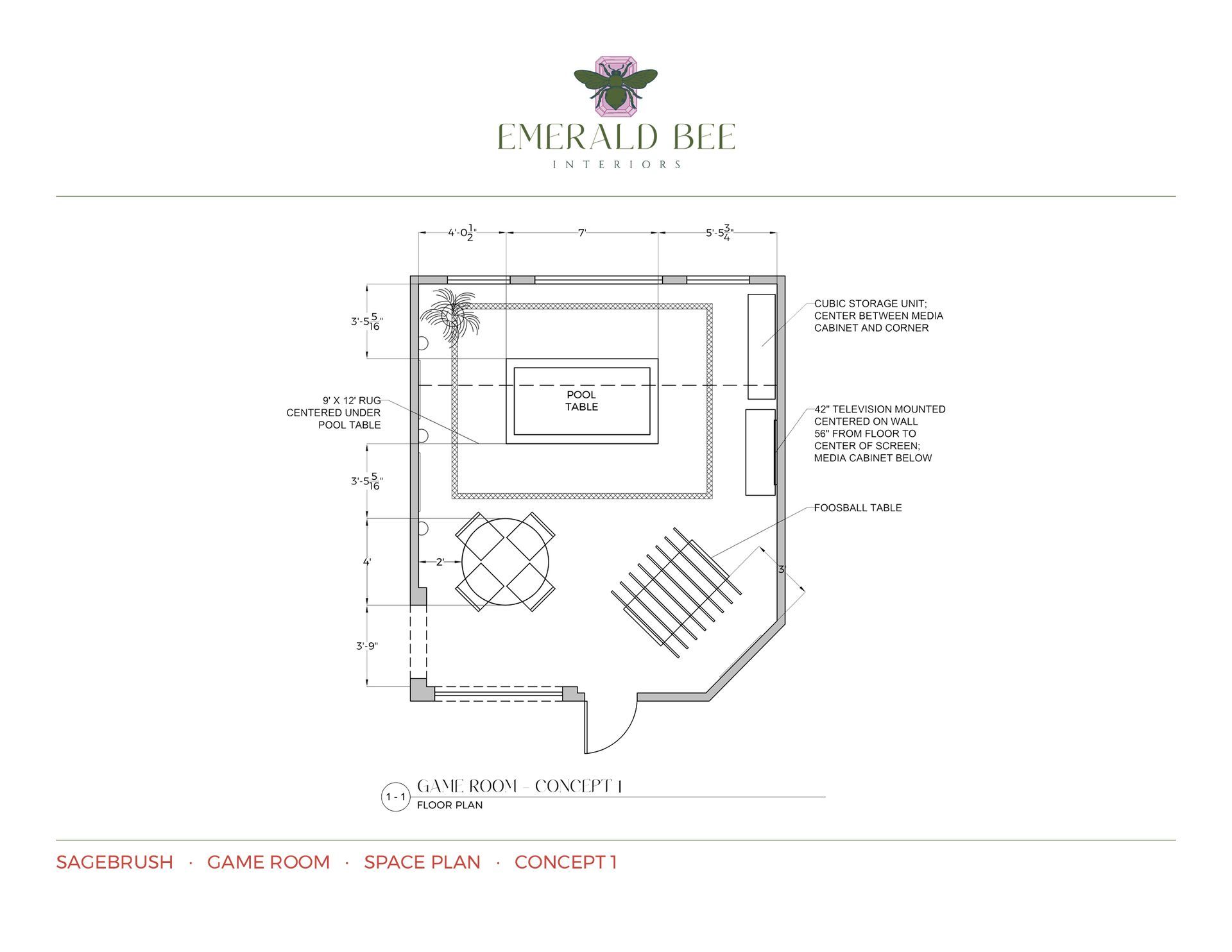 Emerald Bee Interiors was hired to reimagine an existing game room for a client who wanted to incorporate a new pool table without sacrificing space for their existing foosball and game tables. Because of the pool table’s clearance requirements, space planning and circulation were critical considerations in the design. The final layout balances functionality with fun, maintaining open pathways while maximizing entertainment zones.