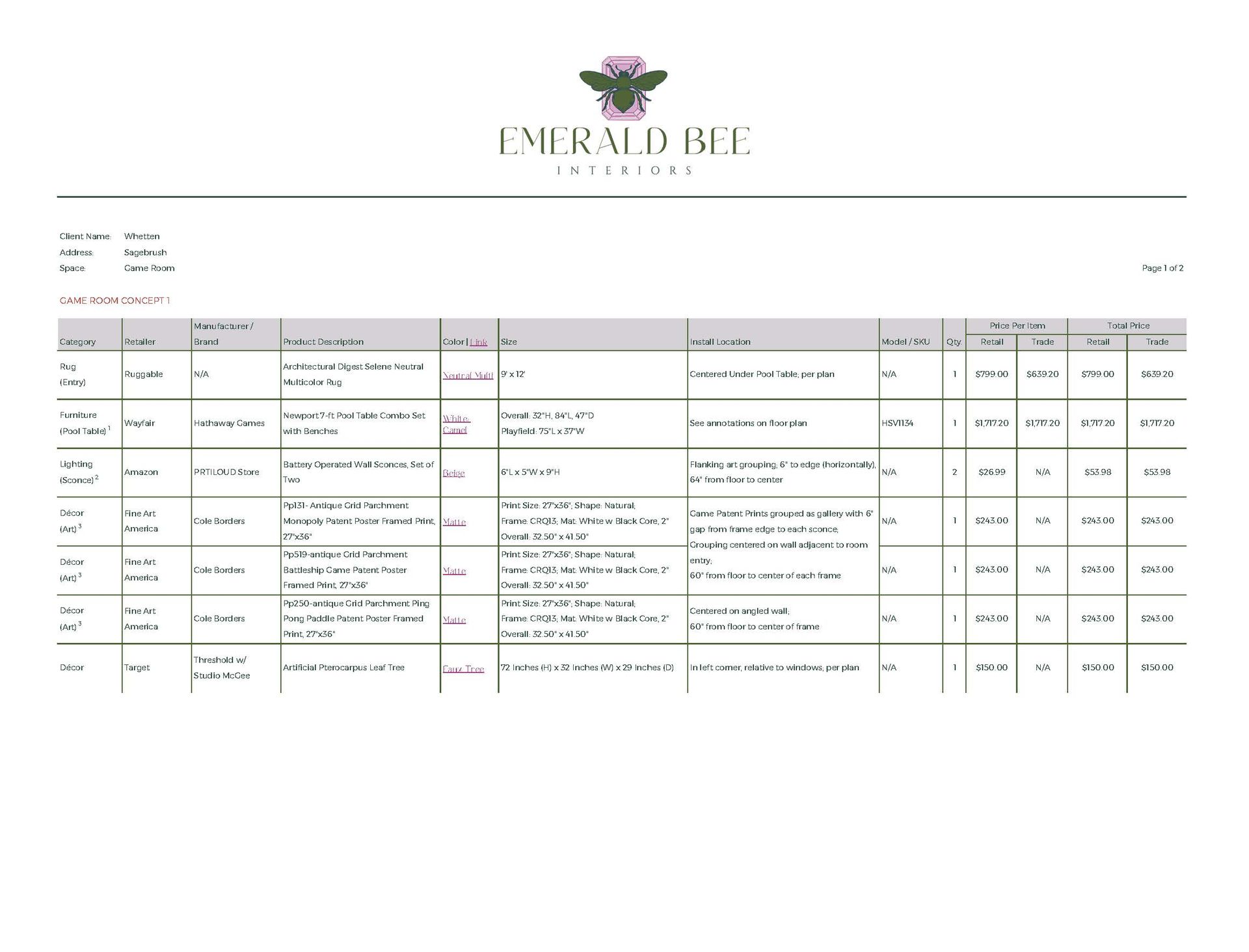 The design concept introduces a cohesive color palette anchored by Sherwin Williams Morning Fog, layered with soft neutrals and textural elements to bring warmth and visual interest. Budget-friendly updates included sourcing art prints inspired by vintage game patents, a durable 9’x12’ rug from Ruggable, and battery-operated wall sconces.